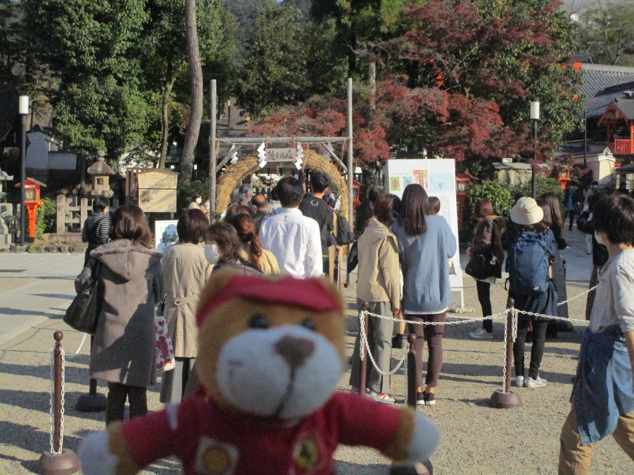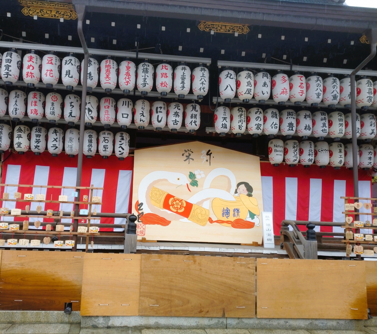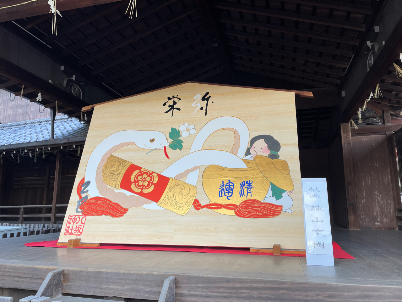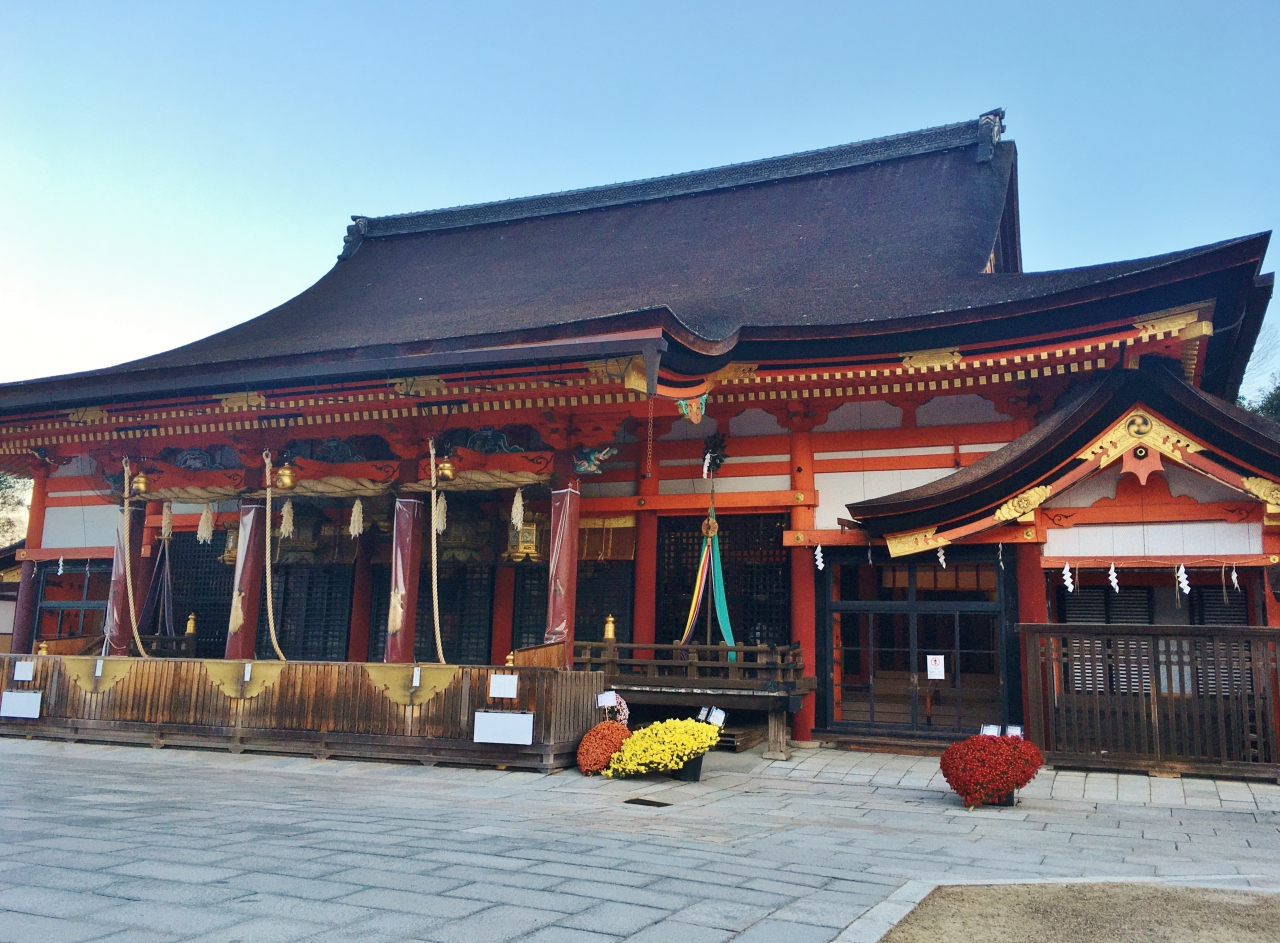 牛頭天王を祀っているようです。 基本的には疫病退散の神社ですが、美人祈願や縁結び、さらには商売繁盛の恵比須様も祀られてい... 続きを読むました。歴史の重みある大絵馬を掲げ、訪れる参拝客を出迎えます。 四条通の突き当りに大きな門がある他、境内南側にも門が据えられていました。円山公園にも隣接しており、多くの人でごった返していました。 閉じる