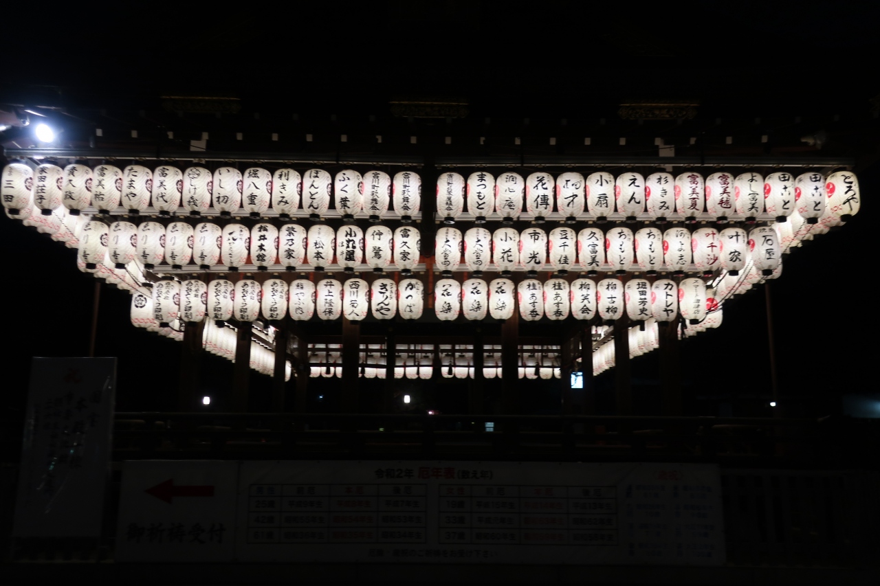 厄除け・縁結びの神、祇園さんの呼び名で親しまれている。日本三大祭のひとつ祇園祭は京都の代表的行事である。師走の風物詩「をけら詣り」も有名。全国の祇園社の総本社。