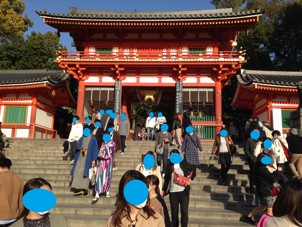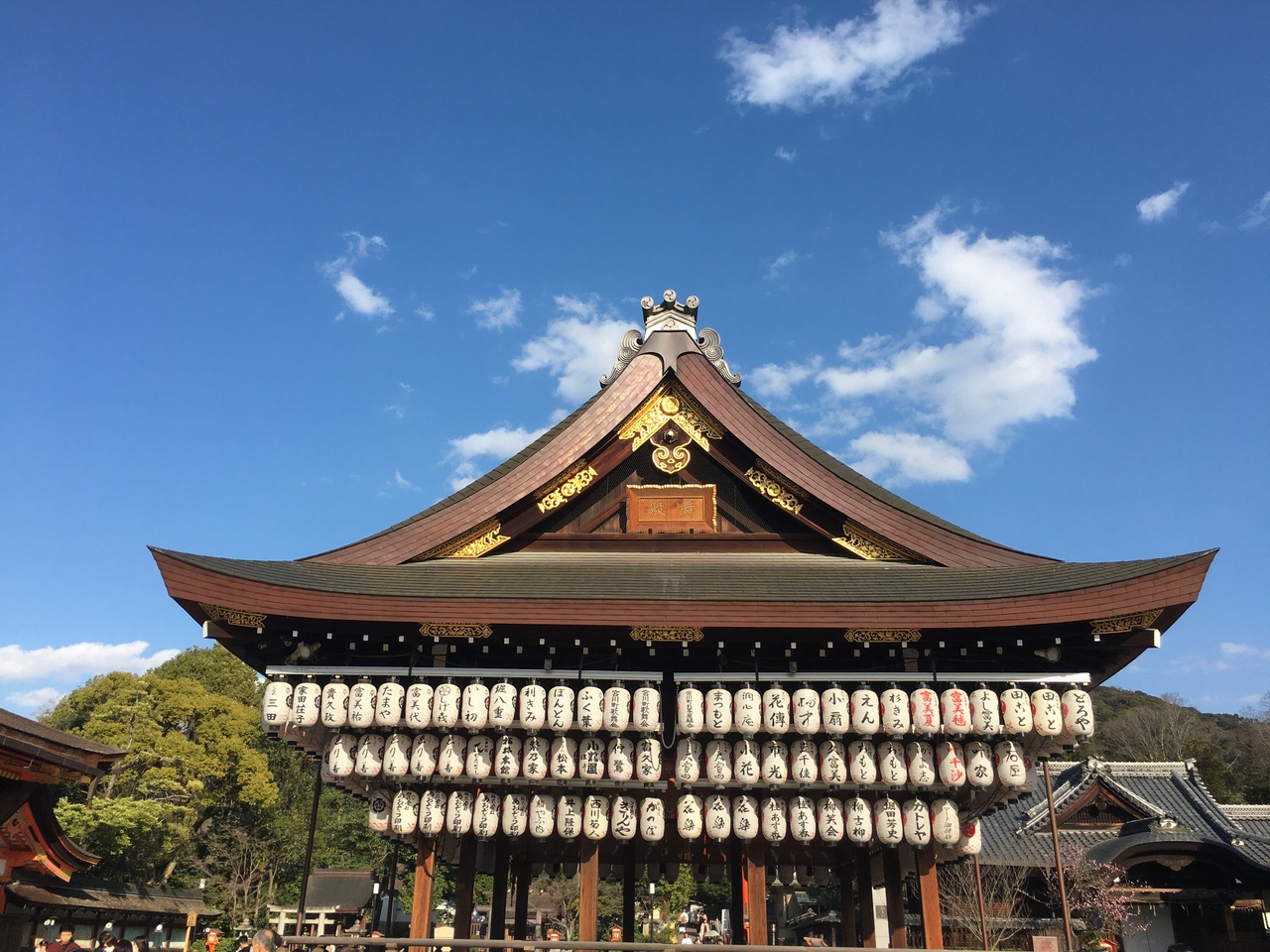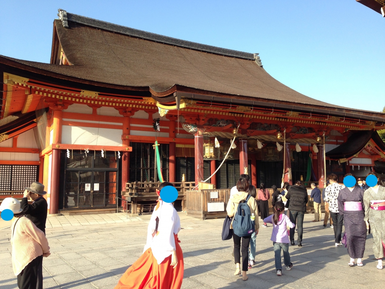 牛頭天王を祀っているようです。 基本的には疫病退散の神社ですが、美人祈願や縁結び、さらには商売繁盛の恵比須様も祀られてい... 続きを読むました。歴史の重みある大絵馬を掲げ、訪れる参拝客を出迎えます。 四条通の突き当りに大きな門がある他、境内南側にも門が据えられていました。円山公園にも隣接しており、多くの人でごった返していました。 閉じる