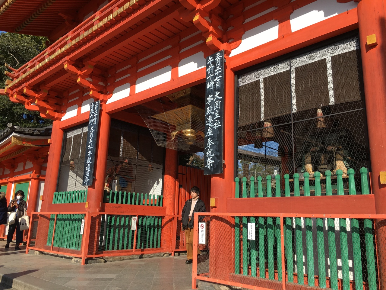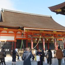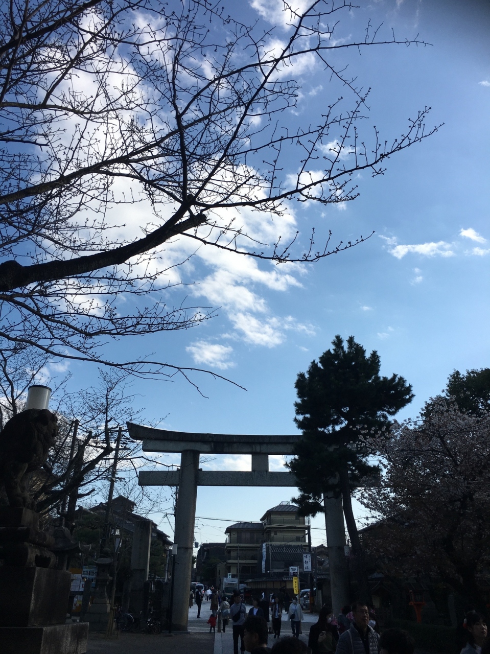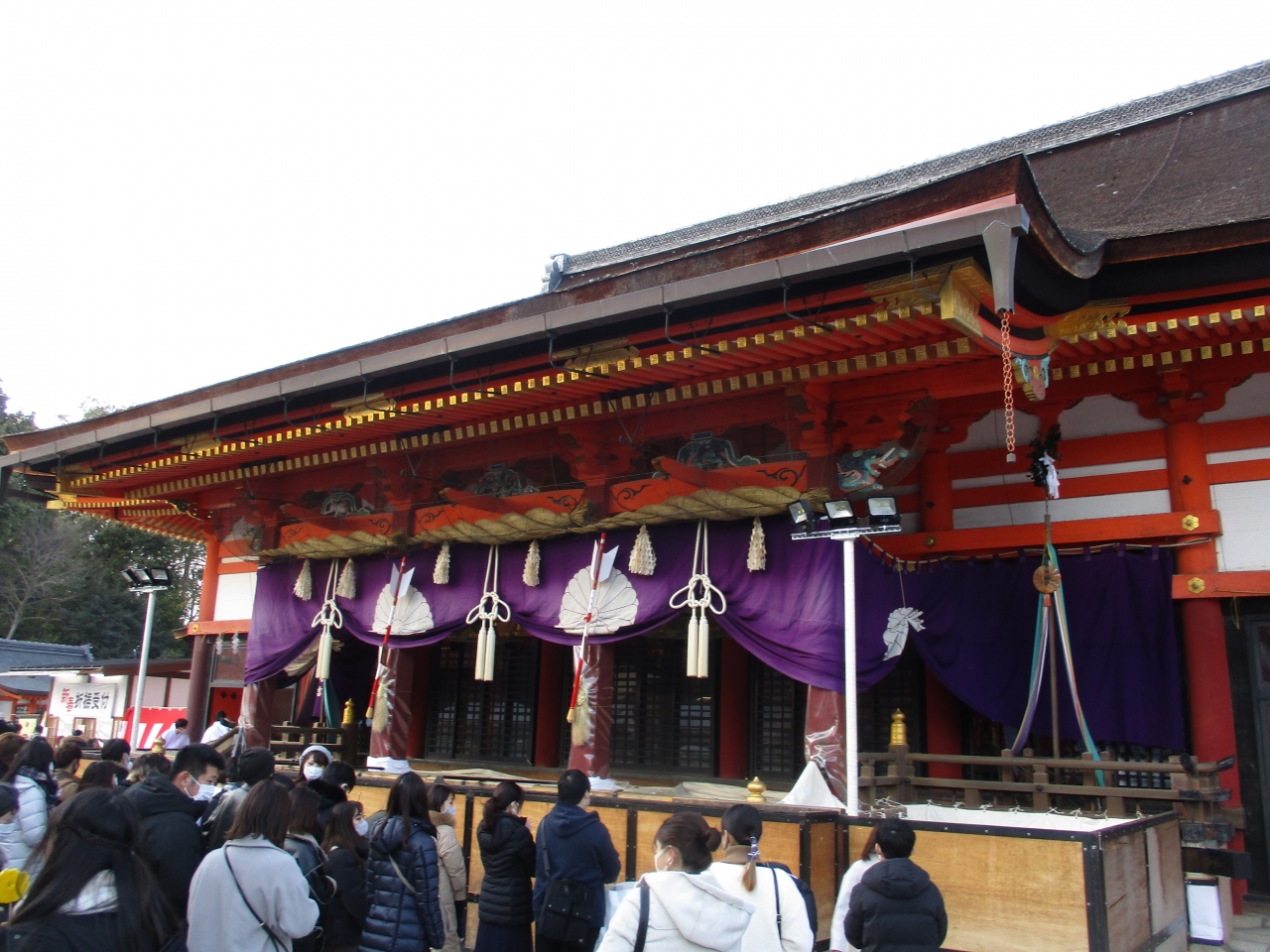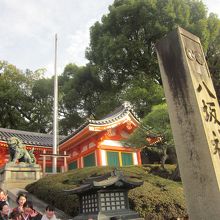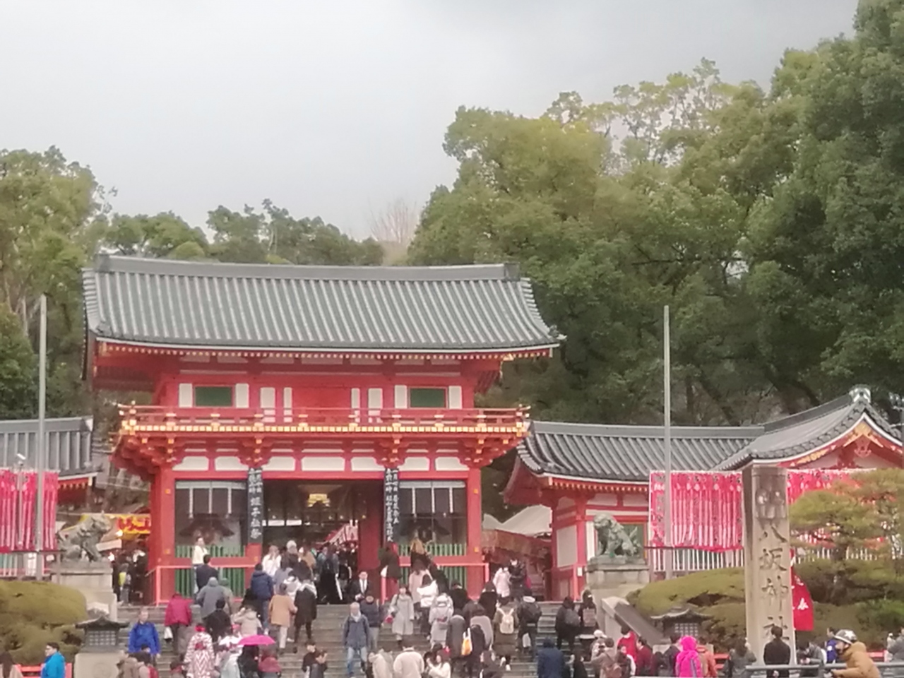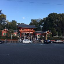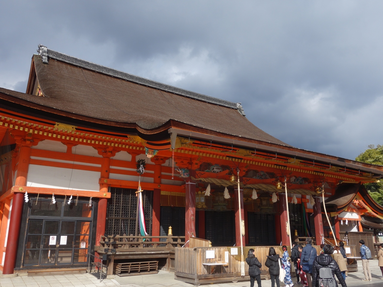 牛頭天王を祀っているようです。 基本的には疫病退散の神社ですが、美人祈願や縁結び、さらには商売繁盛の恵比須様も祀られてい... 続きを読むました。歴史の重みある大絵馬を掲げ、訪れる参拝客を出迎えます。 四条通の突き当りに大きな門がある他、境内南側にも門が据えられていました。円山公園にも隣接しており、多くの人でごった返していました。 閉じる