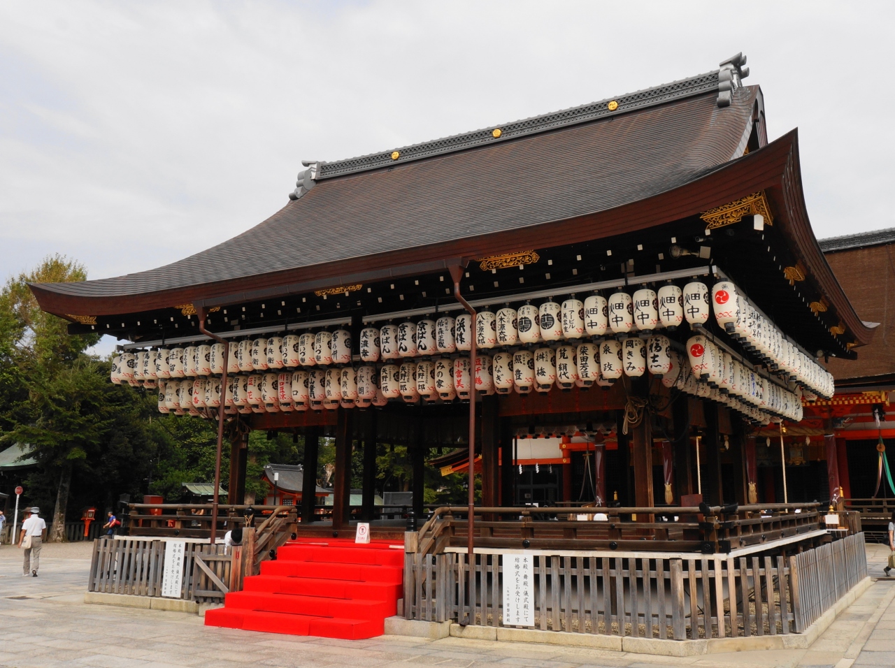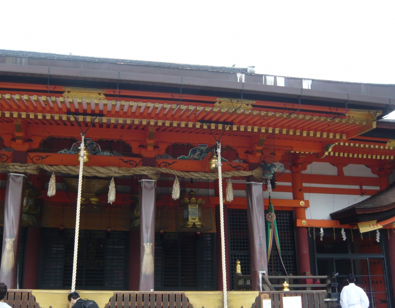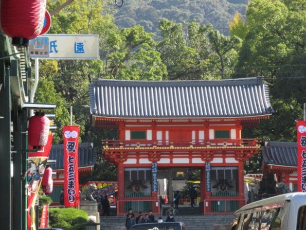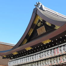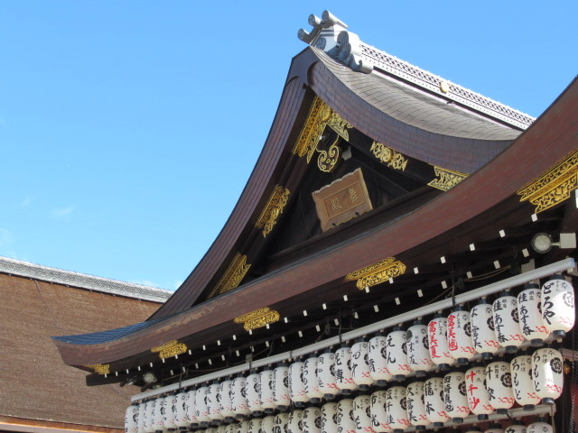 牛頭天王を祀っているようです。 基本的には疫病退散の神社ですが、美人祈願や縁結び、さらには商売繁盛の恵比須様も祀られてい... 続きを読むました。歴史の重みある大絵馬を掲げ、訪れる参拝客を出迎えます。 四条通の突き当りに大きな門がある他、境内南側にも門が据えられていました。円山公園にも隣接しており、多くの人でごった返していました。 閉じる