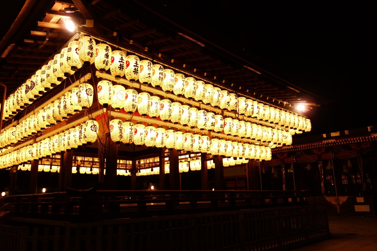 厄除け・縁結びの神、祇園さんの呼び名で親しまれている。日本三大祭のひとつ祇園祭は京都の代表的行事である。師走の風物詩「をけら詣り」も有名。全国の祇園社の総本社。