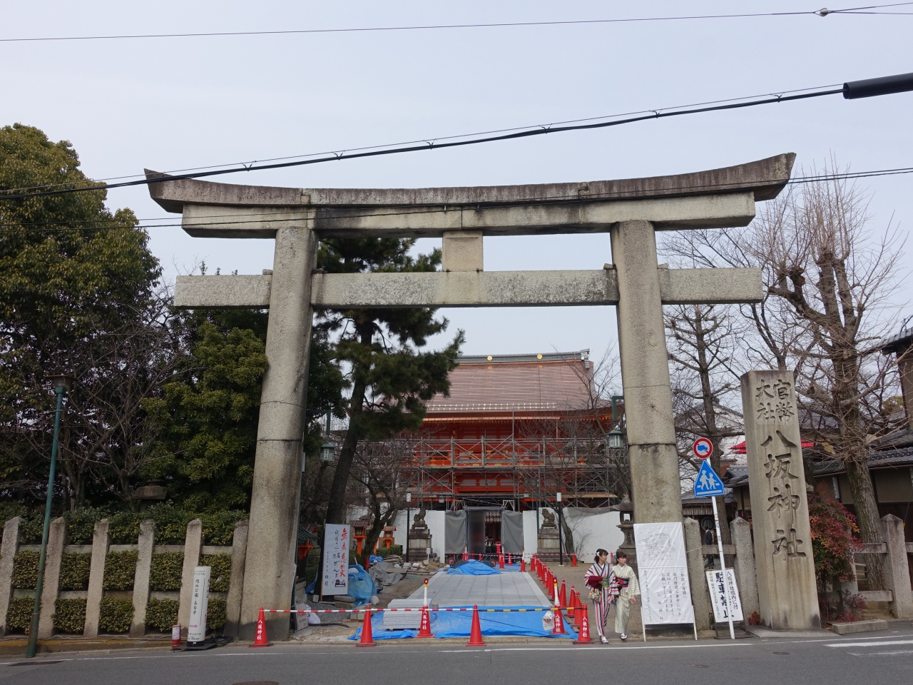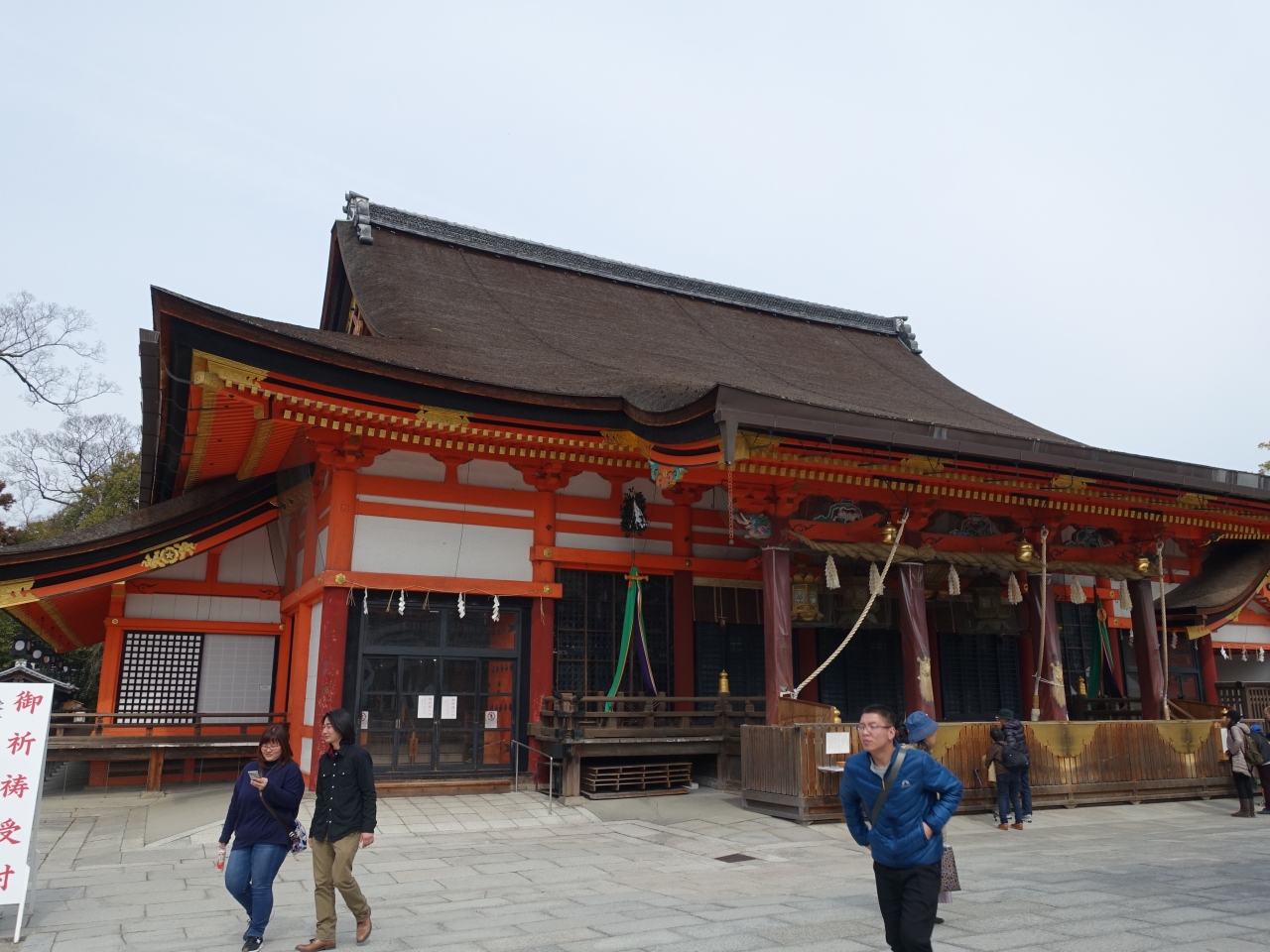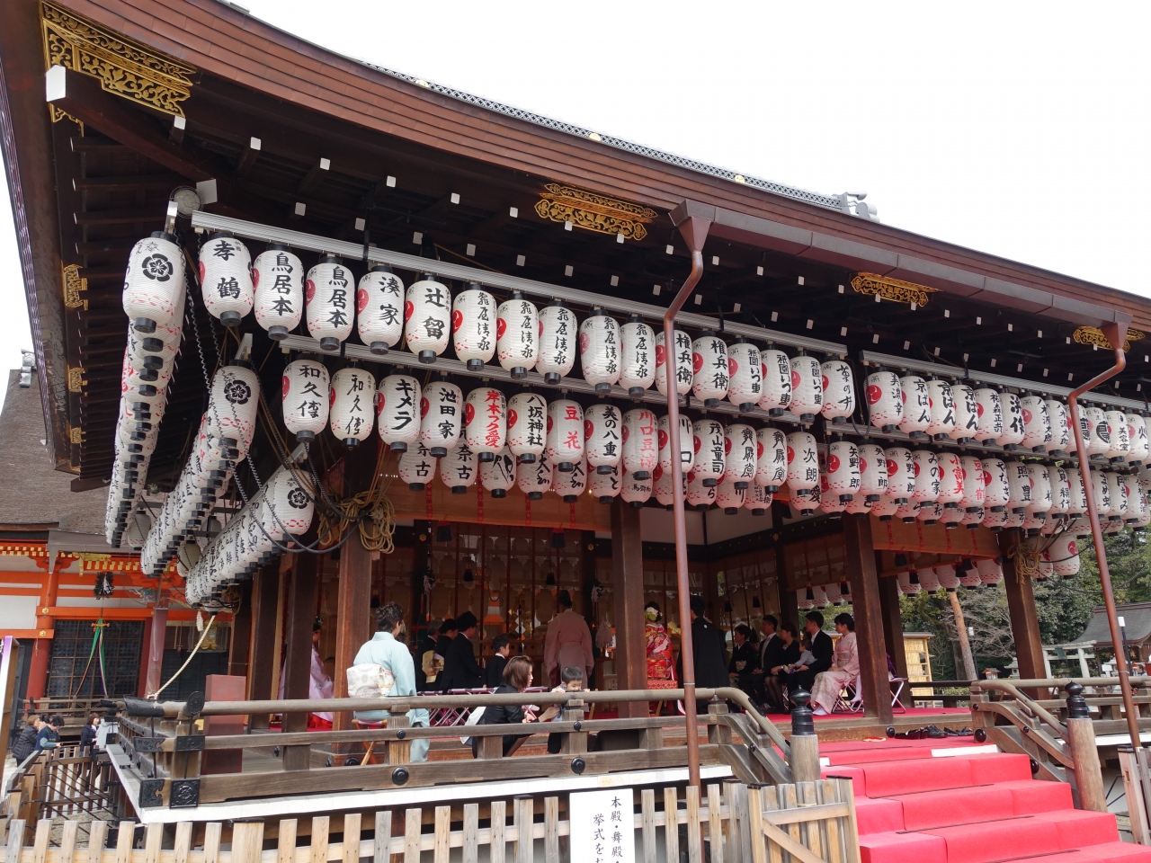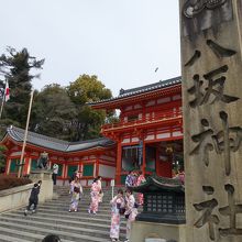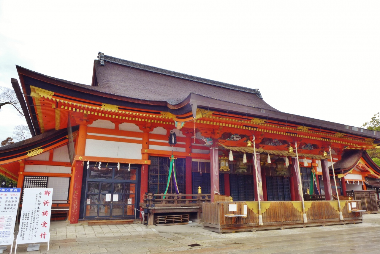 牛頭天王を祀っているようです。 基本的には疫病退散の神社ですが、美人祈願や縁結び、さらには商売繁盛の恵比須様も祀られてい... 続きを読むました。歴史の重みある大絵馬を掲げ、訪れる参拝客を出迎えます。 四条通の突き当りに大きな門がある他、境内南側にも門が据えられていました。円山公園にも隣接しており、多くの人でごった返していました。 閉じる
