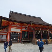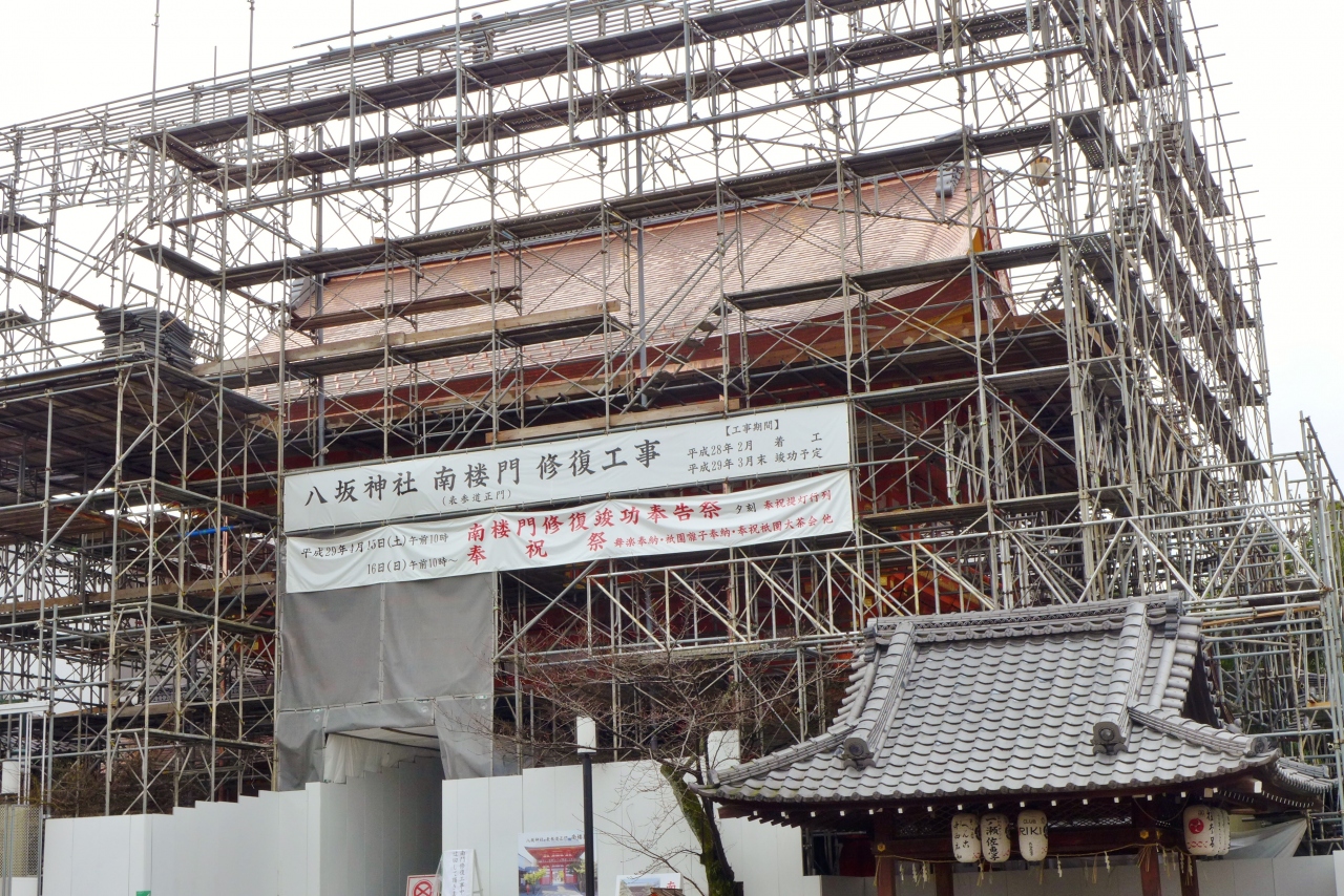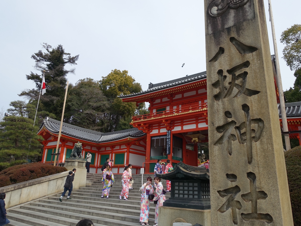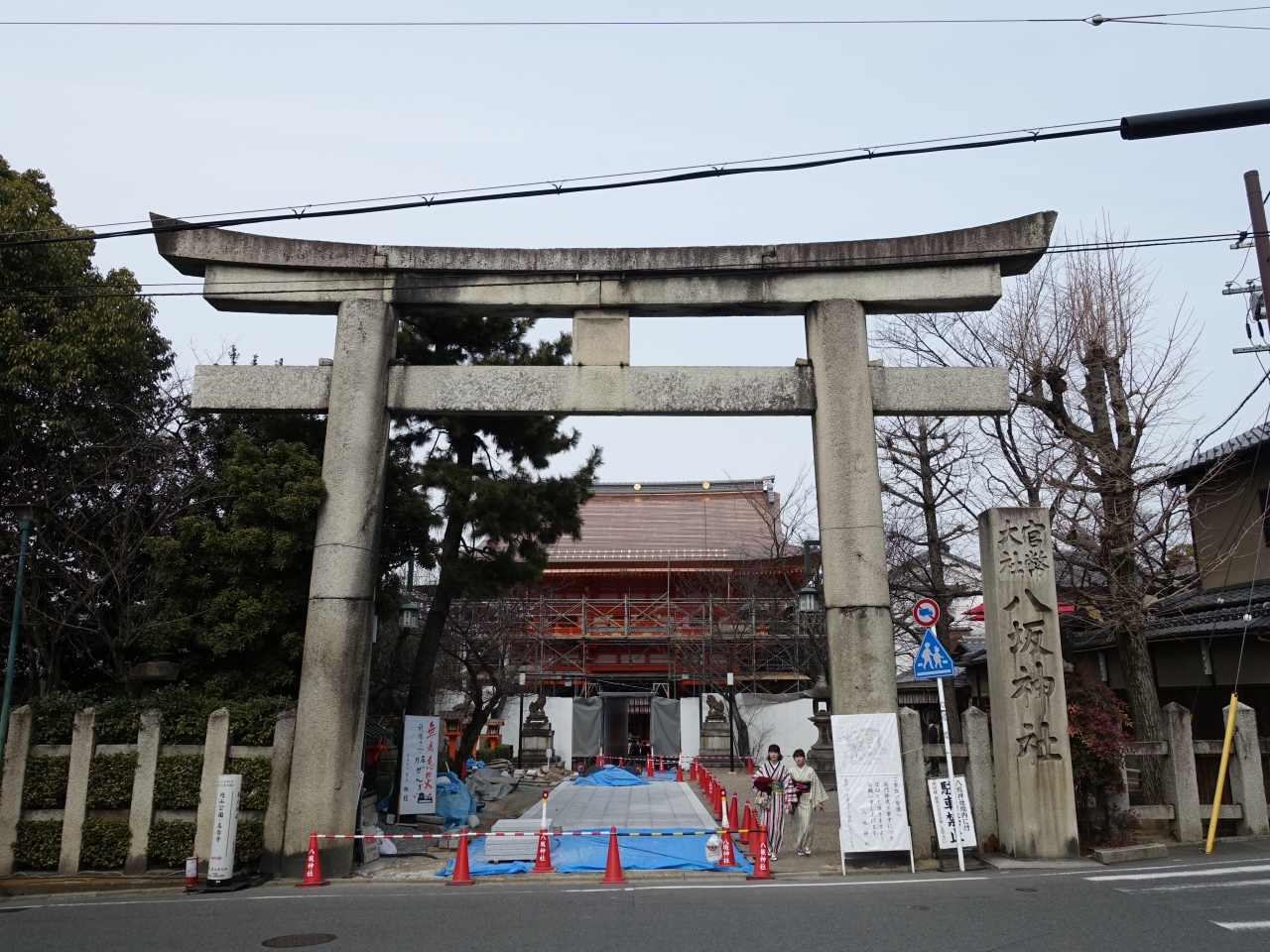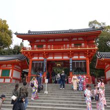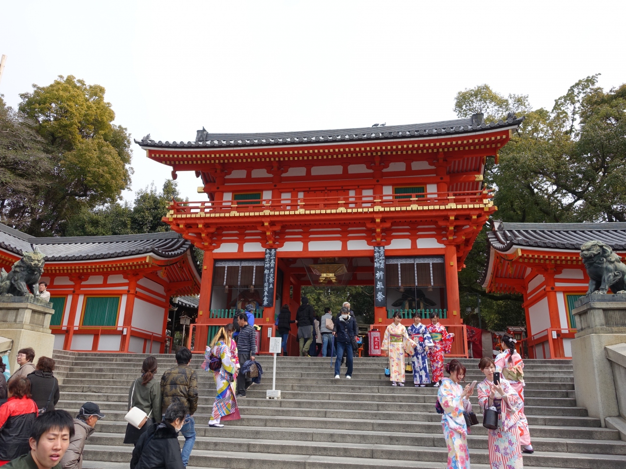 牛頭天王を祀っているようです。 基本的には疫病退散の神社ですが、美人祈願や縁結び、さらには商売繁盛の恵比須様も祀られてい... 続きを読むました。歴史の重みある大絵馬を掲げ、訪れる参拝客を出迎えます。 四条通の突き当りに大きな門がある他、境内南側にも門が据えられていました。円山公園にも隣接しており、多くの人でごった返していました。 閉じる