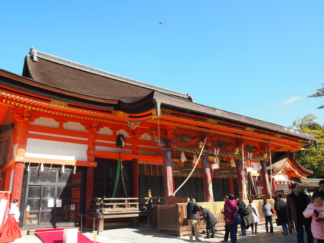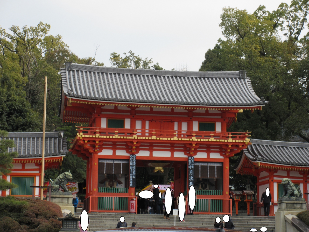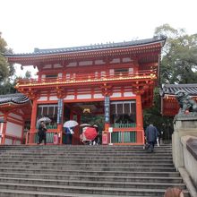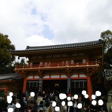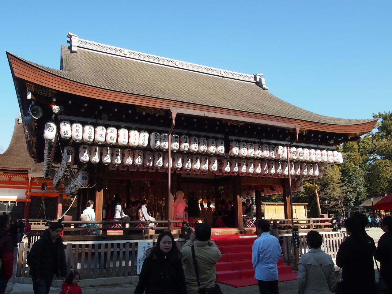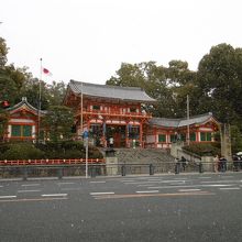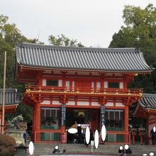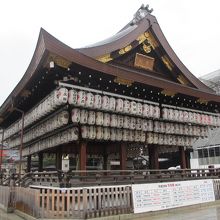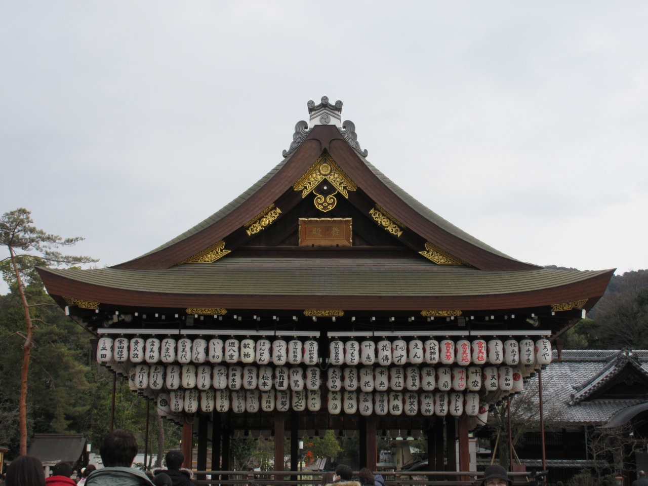 牛頭天王を祀っているようです。 基本的には疫病退散の神社ですが、美人祈願や縁結び、さらには商売繁盛の恵比須様も祀られてい... 続きを読むました。歴史の重みある大絵馬を掲げ、訪れる参拝客を出迎えます。 四条通の突き当りに大きな門がある他、境内南側にも門が据えられていました。円山公園にも隣接しており、多くの人でごった返していました。 閉じる