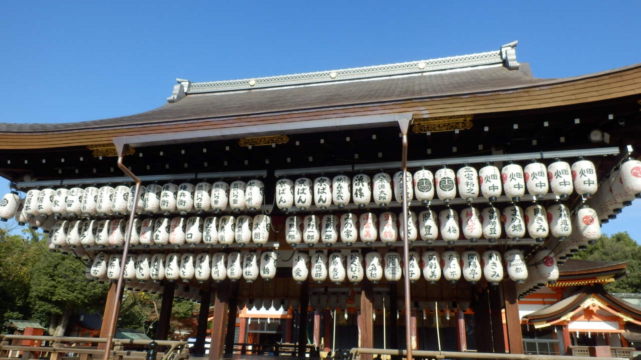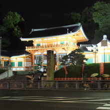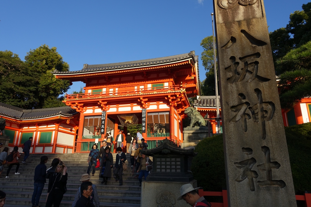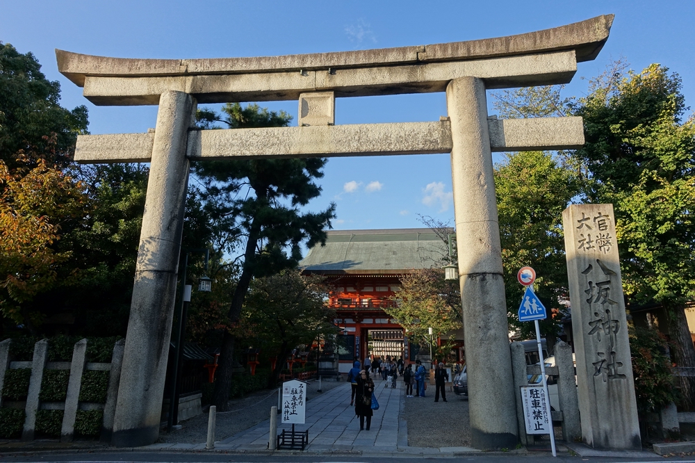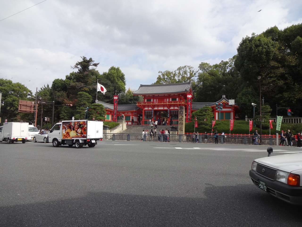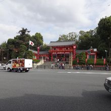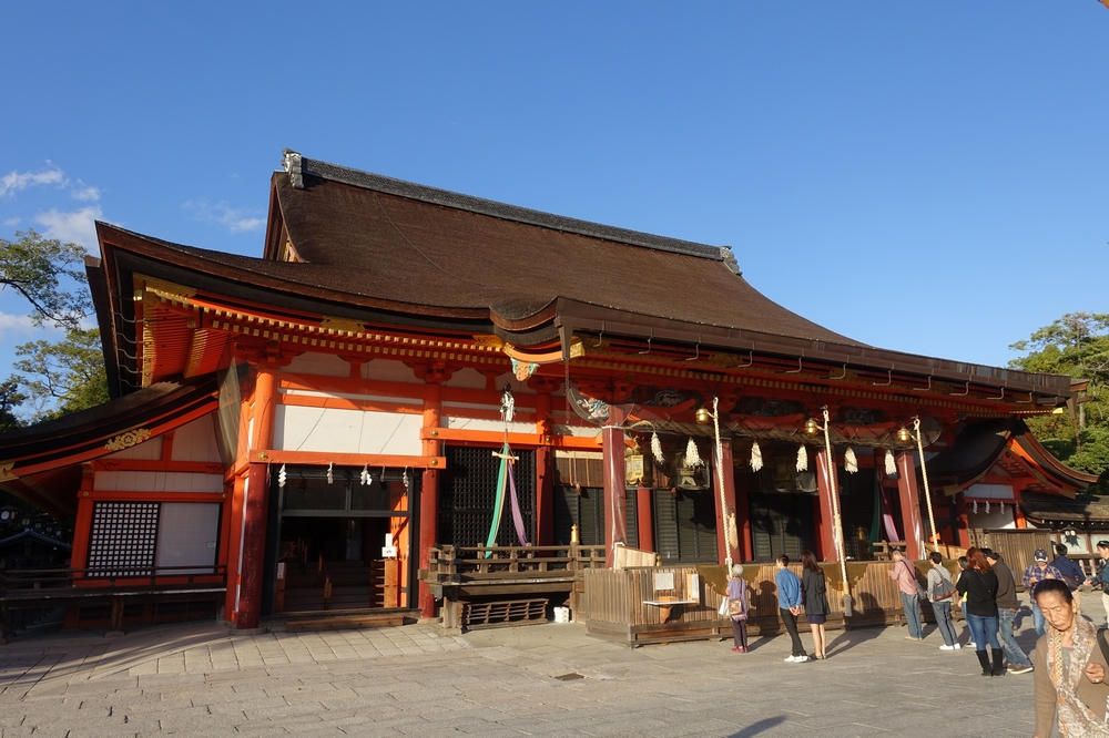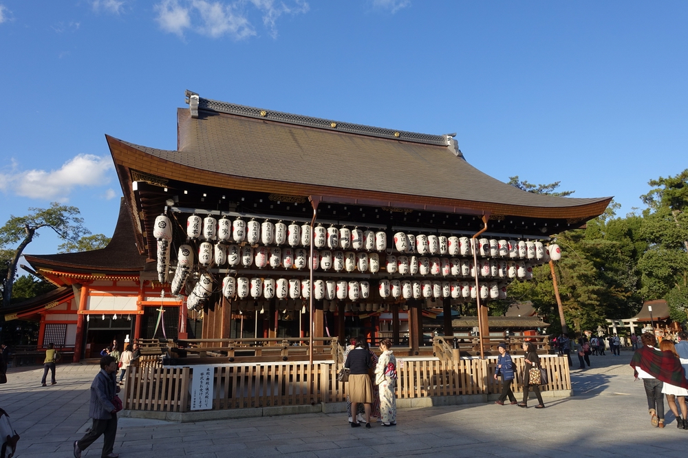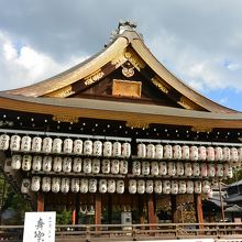 牛頭天王を祀っているようです。 基本的には疫病退散の神社ですが、美人祈願や縁結び、さらには商売繁盛の恵比須様も祀られてい... 続きを読むました。歴史の重みある大絵馬を掲げ、訪れる参拝客を出迎えます。 四条通の突き当りに大きな門がある他、境内南側にも門が据えられていました。円山公園にも隣接しており、多くの人でごった返していました。 閉じる