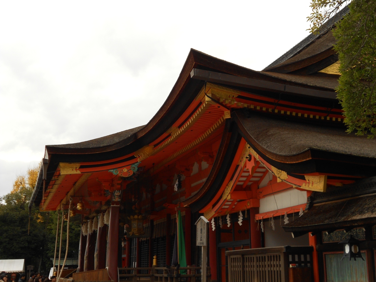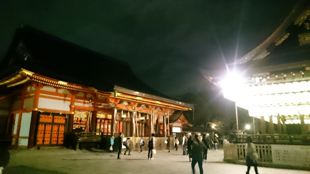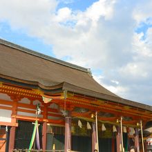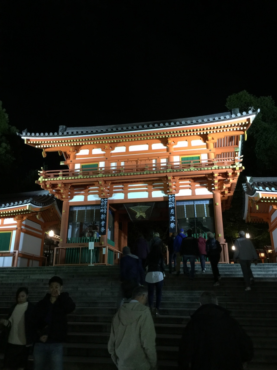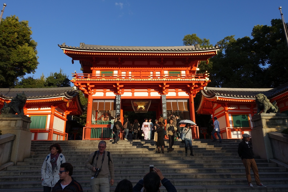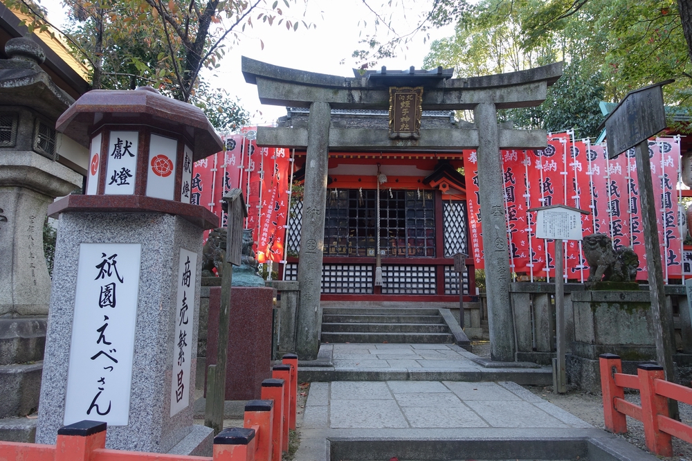 牛頭天王を祀っているようです。 基本的には疫病退散の神社ですが、美人祈願や縁結び、さらには商売繁盛の恵比須様も祀られてい... 続きを読むました。歴史の重みある大絵馬を掲げ、訪れる参拝客を出迎えます。 四条通の突き当りに大きな門がある他、境内南側にも門が据えられていました。円山公園にも隣接しており、多くの人でごった返していました。 閉じる