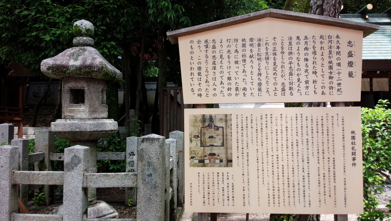 忠盛は、平清盛の父。この燈籠には逸話があって、平家物... 続きを読む語にも出ているということですが、ある五月雨の降る夜、白河法皇が祇園女御に会うためにこの辺りを通っていると前方に鬼のようなものが見えた。法皇はお供の平忠盛に討ち取るよう命じたが、忠盛はその正体を見定めてからとして生け捕りにしたところ、それは燈籠に燈明をあげようとした祇園の社僧だった。人々は忠盛の思慮深い行動に感嘆したというのです。