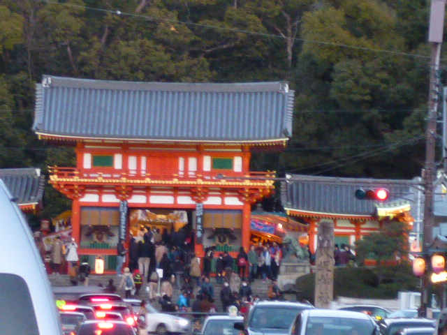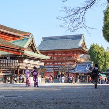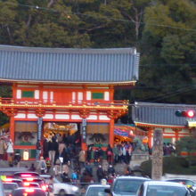牛頭天王を祀っているようです。 基本的には疫病退散の神社ですが、美人祈願や縁結び、さらには商売繁盛の恵比須様も祀られてい... 続きを読むました。歴史の重みある大絵馬を掲げ、訪れる参拝客を出迎えます。 四条通の突き当りに大きな門がある他、境内南側にも門が据えられていました。円山公園にも隣接しており、多くの人でごった返していました。 閉じる