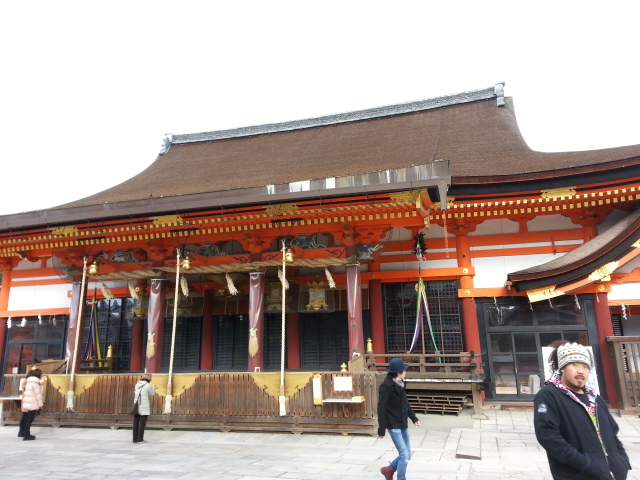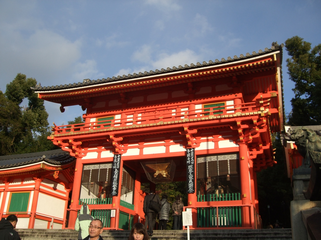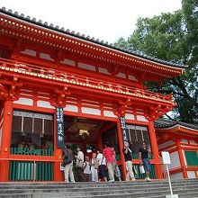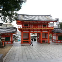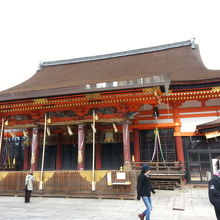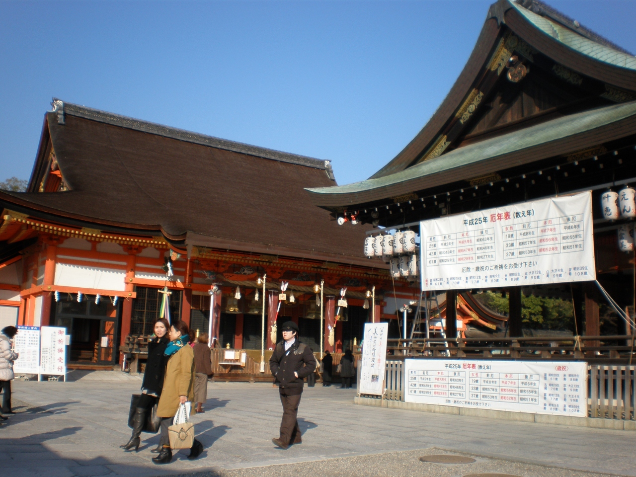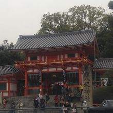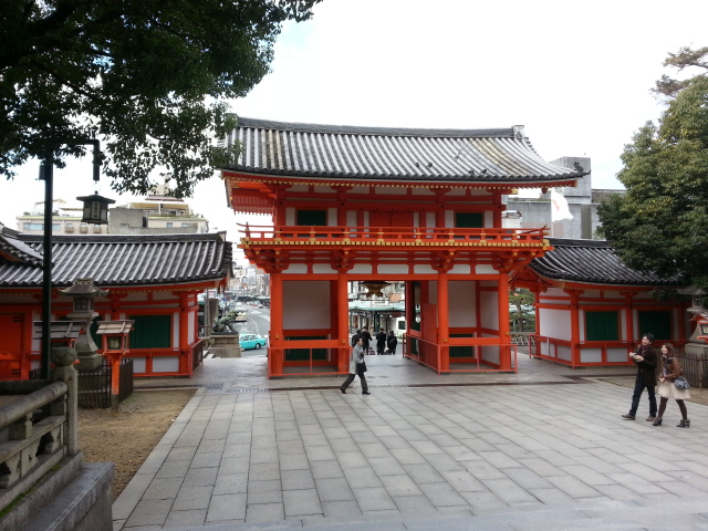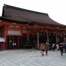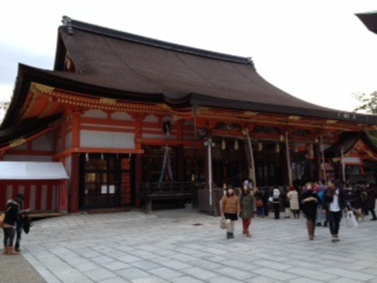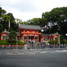牛頭天王を祀っているようです。 基本的には疫病退散の神社ですが、美人祈願や縁結び、さらには商売繁盛の恵比須様も祀られてい... 続きを読むました。歴史の重みある大絵馬を掲げ、訪れる参拝客を出迎えます。 四条通の突き当りに大きな門がある他、境内南側にも門が据えられていました。円山公園にも隣接しており、多くの人でごった返していました。 閉じる