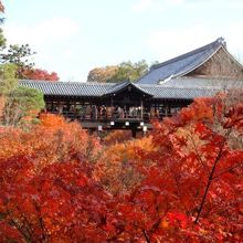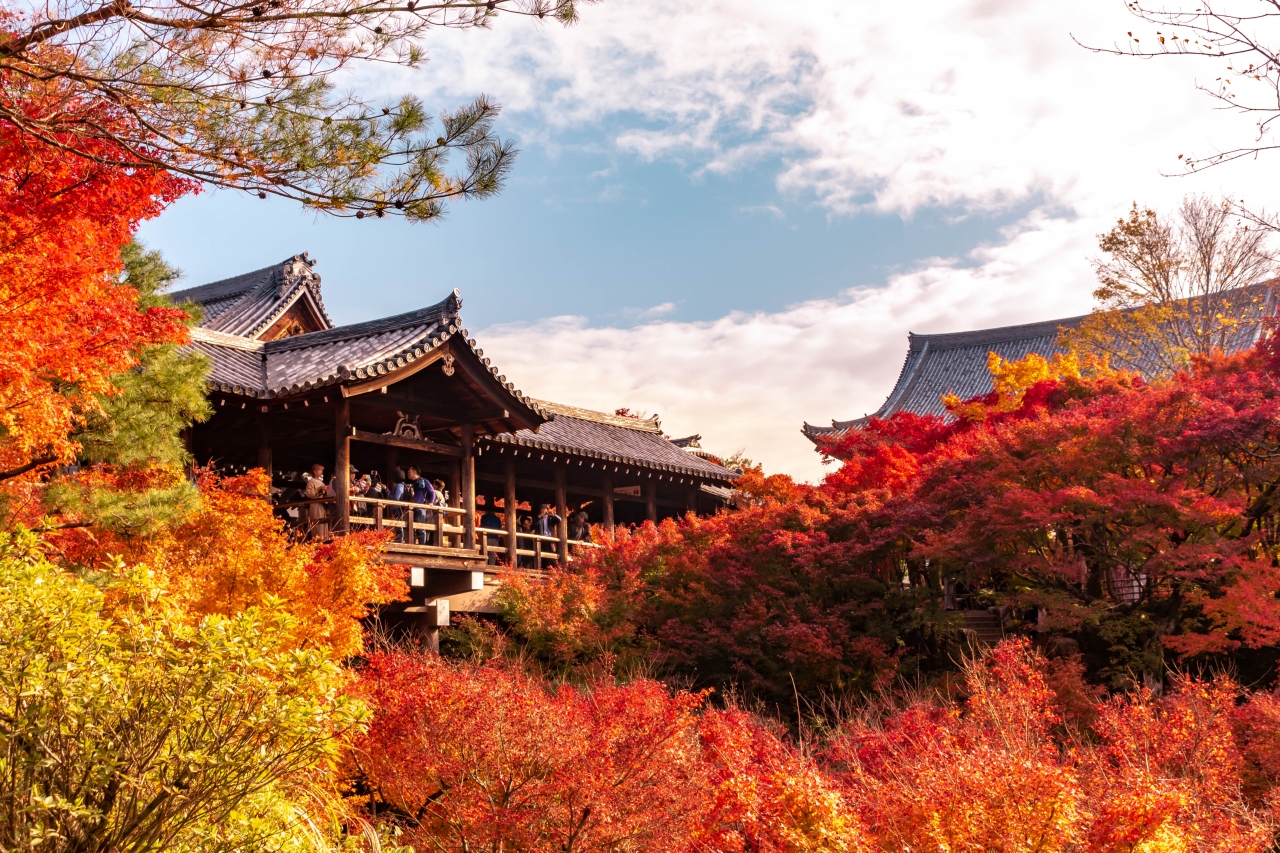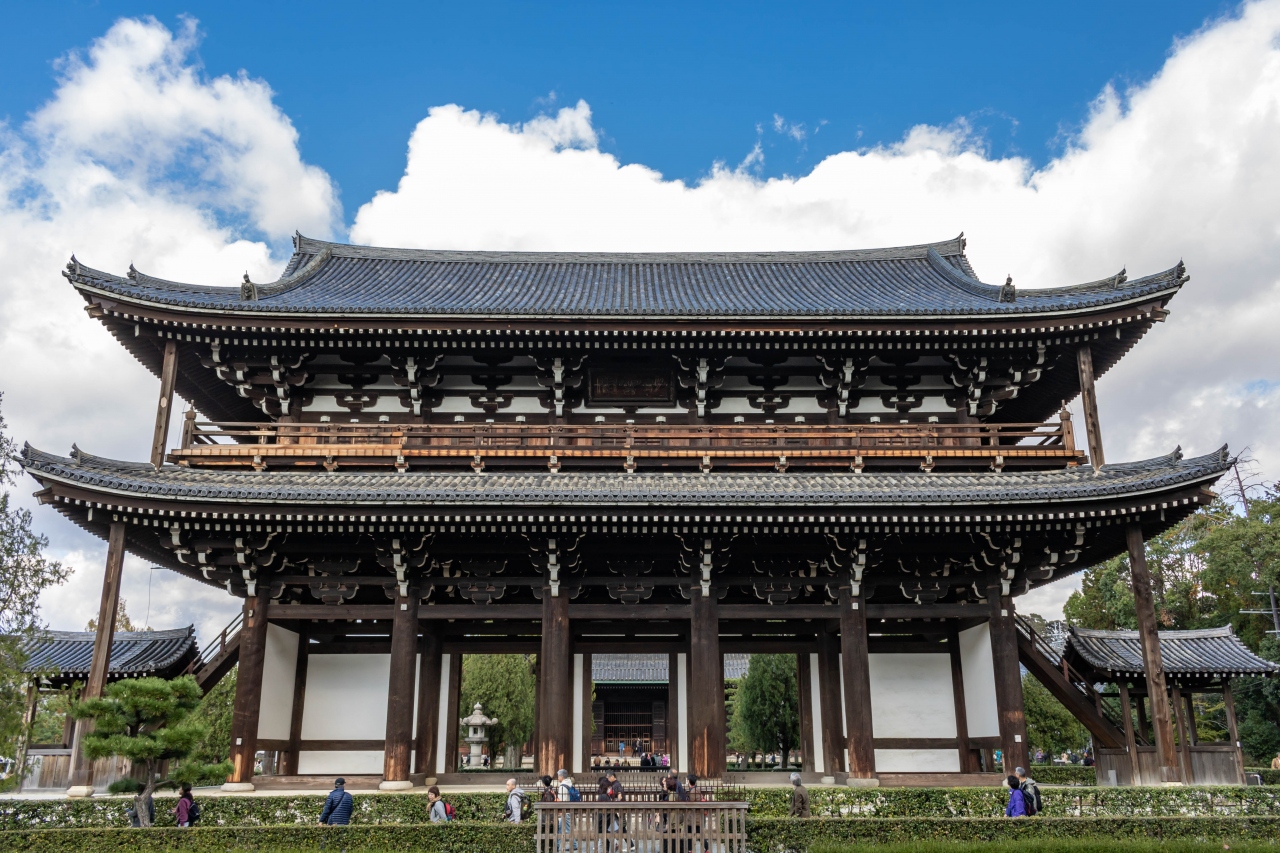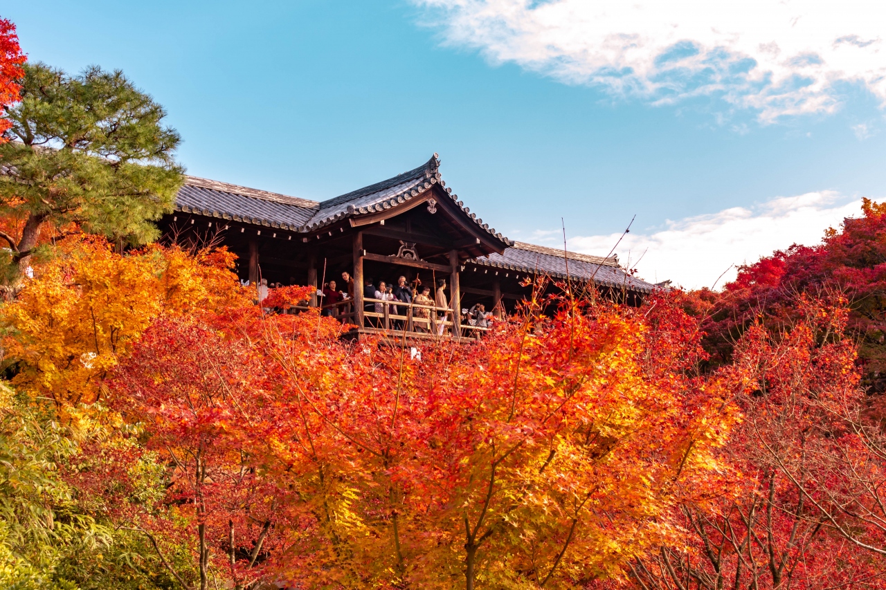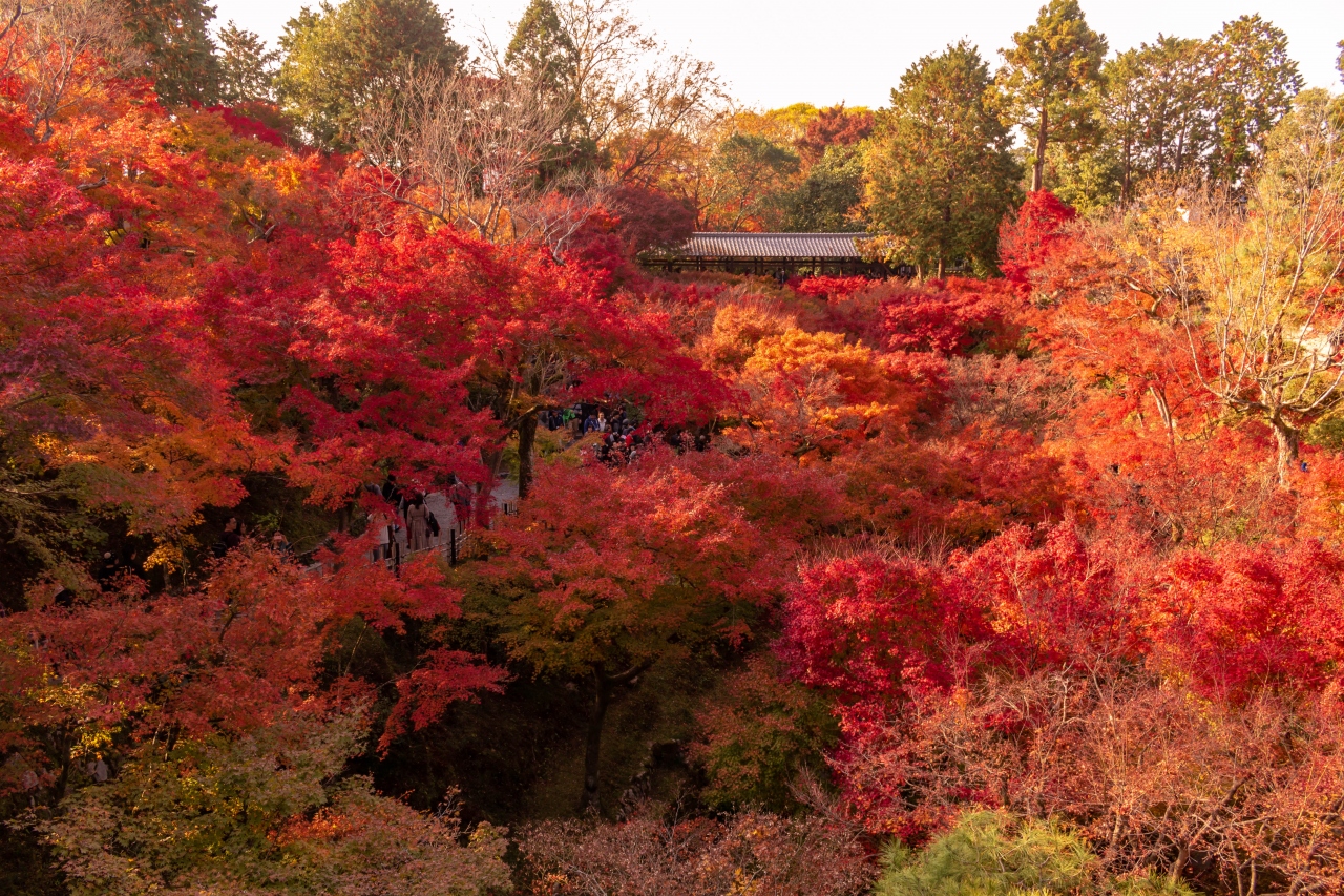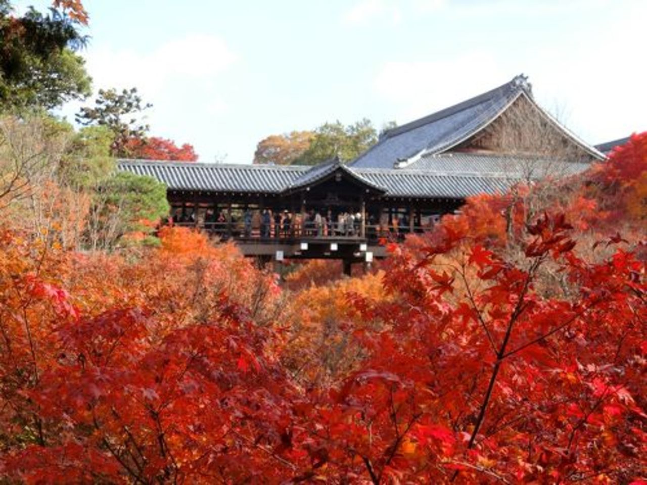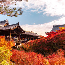 京都五山の一つ。九條道家が氏寺として造営。伽藍や塔頭が広い境内に並ぶ。通天橋は紅葉の名所。