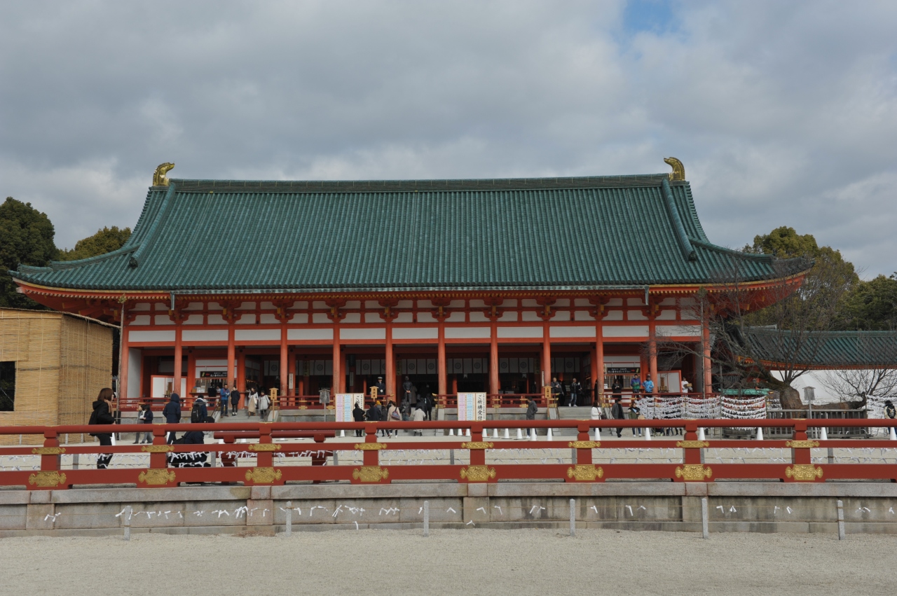 1895年、平安遷都1100年を記念して創建された神社。24mの高さがあり、国の登録有形文化財になっている大鳥居が神宮道をまたぐ。鮮やかな朱色と緑に塗りわけられた社殿は、朝堂院を模している。広大な庭園には珍しい鳥類や、甲羅に草を生やすミノガメ、本州では珍しい南石亀などが生息する。