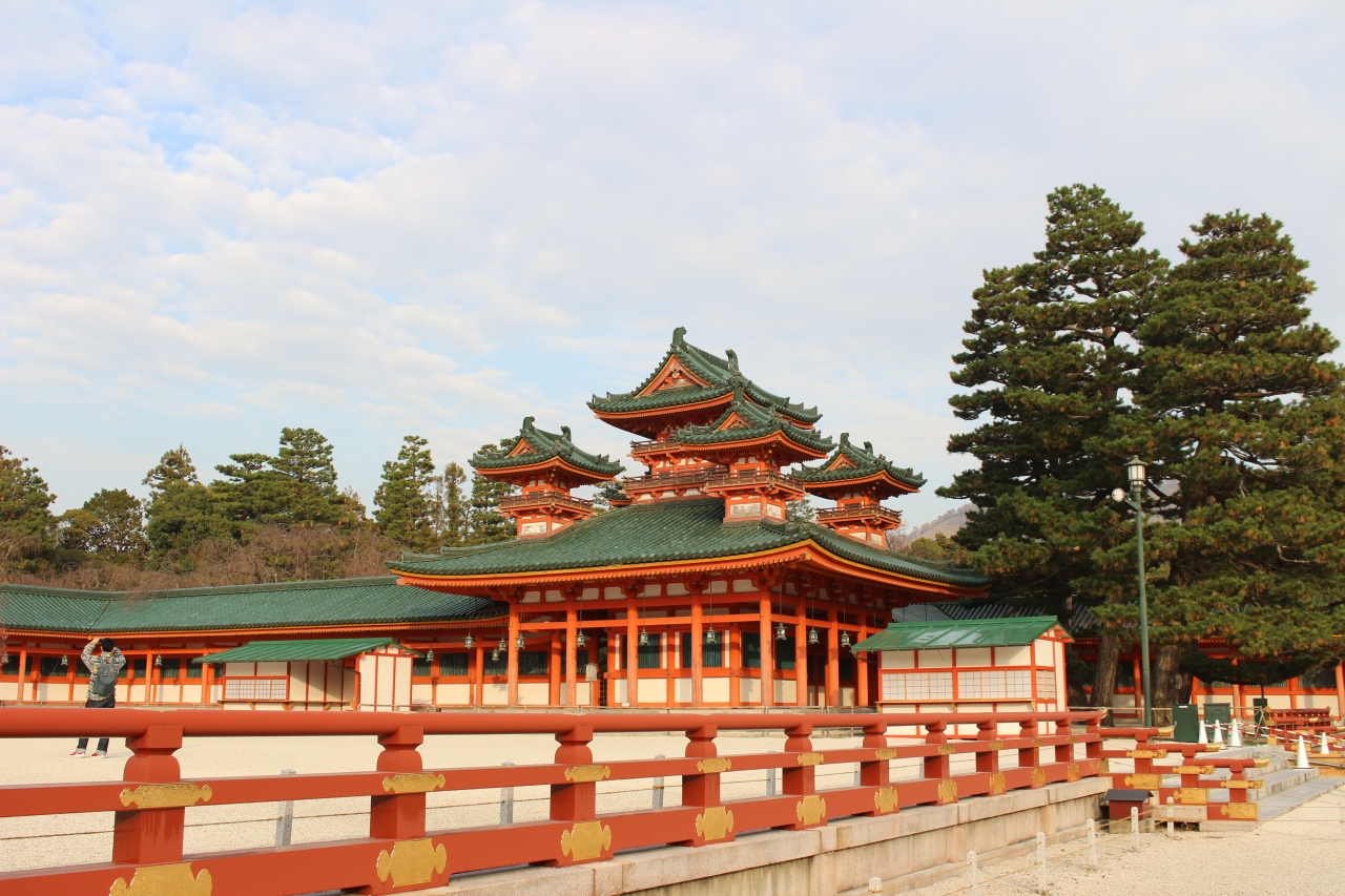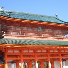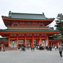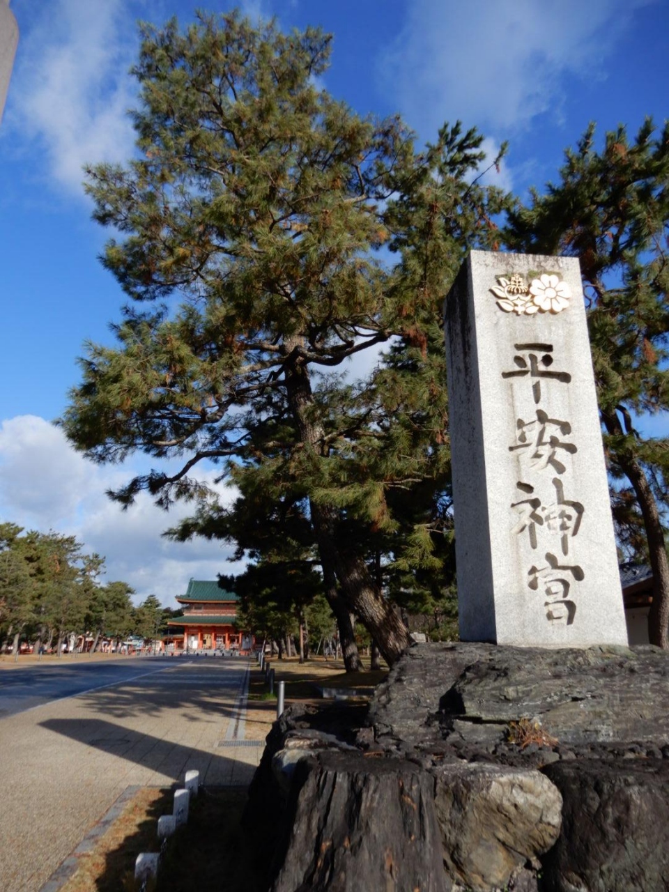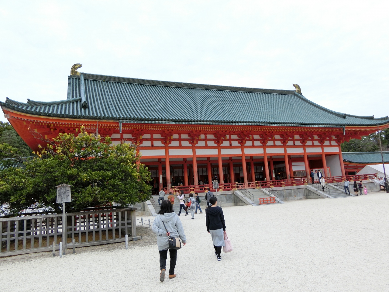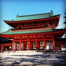 1895年、平安遷都1100年を記念して創建された神社。24mの高さがあり、国の登録有形文化財になっている大鳥居が神宮道をまたぐ。鮮やかな朱色と緑に塗りわけられた社殿は、朝堂院を模している。広大な庭園には珍しい鳥類や、甲羅に草を生やすミノガメ、本州では珍しい南石亀などが生息する。