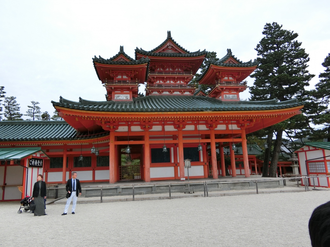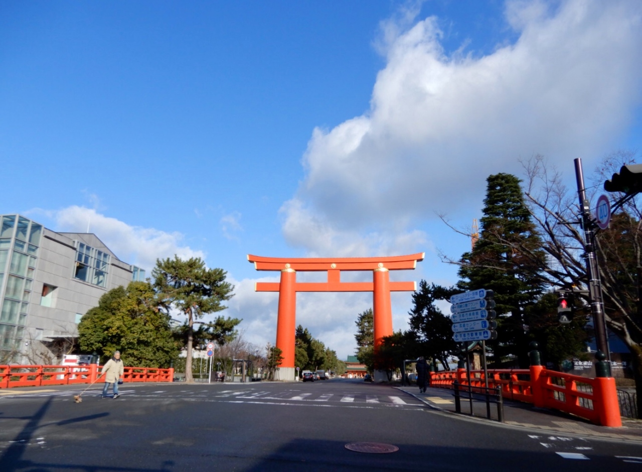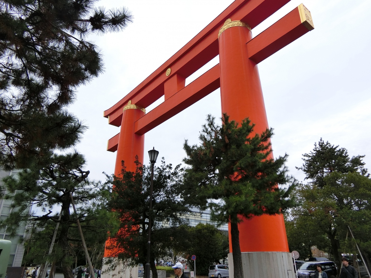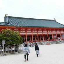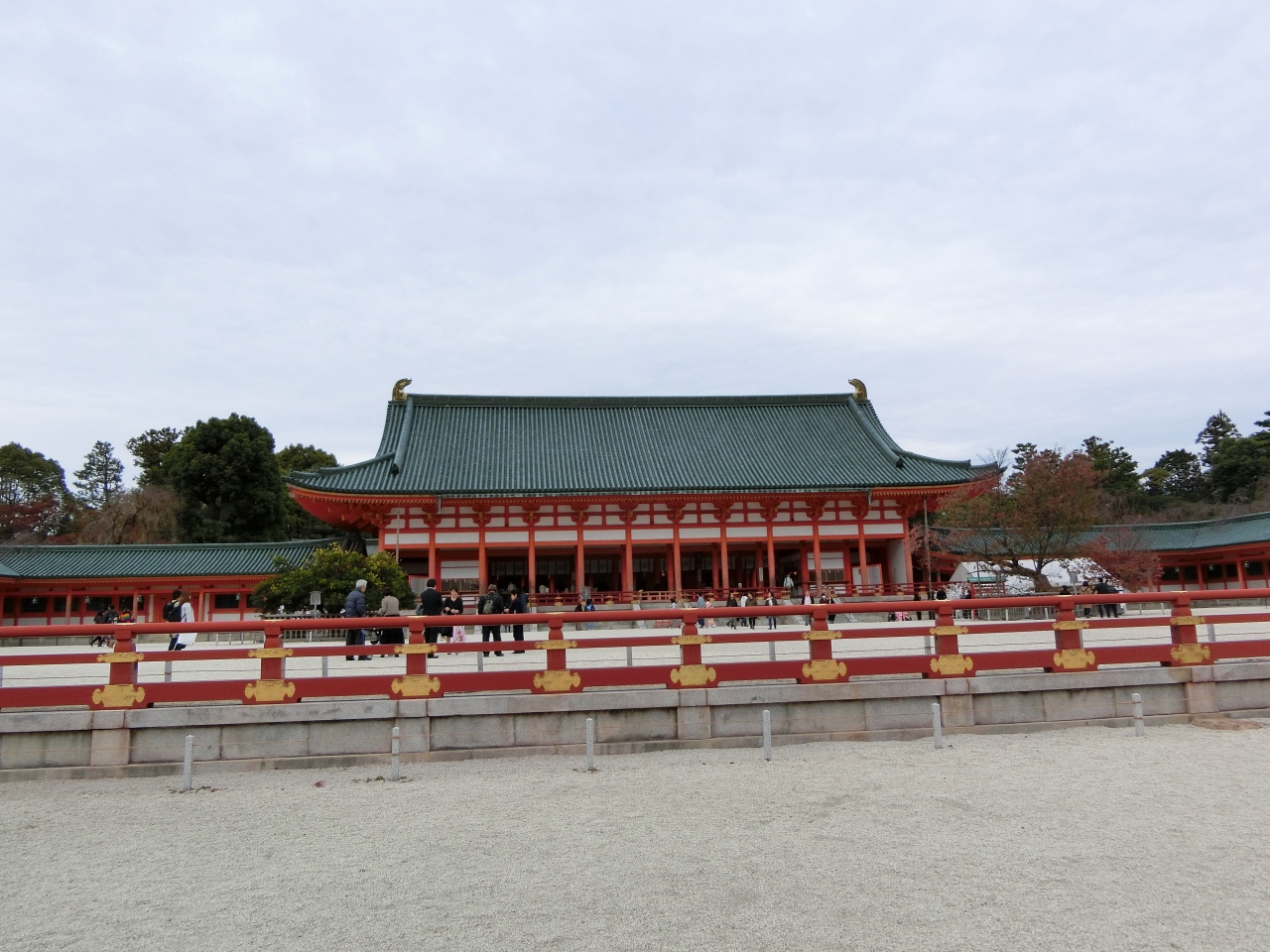 1895年、平安遷都1100年を記念して創建された神社。24mの高さがあり、国の登録有形文化財になっている大鳥居が神宮道をまたぐ。鮮やかな朱色と緑に塗りわけられた社殿は、朝堂院を模している。広大な庭園には珍しい鳥類や、甲羅に草を生やすミノガメ、本州では珍しい南石亀などが生息する。