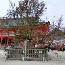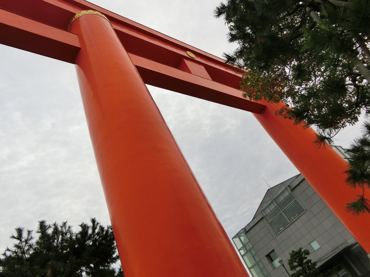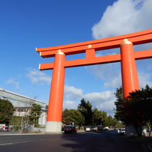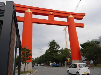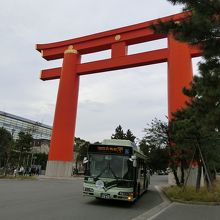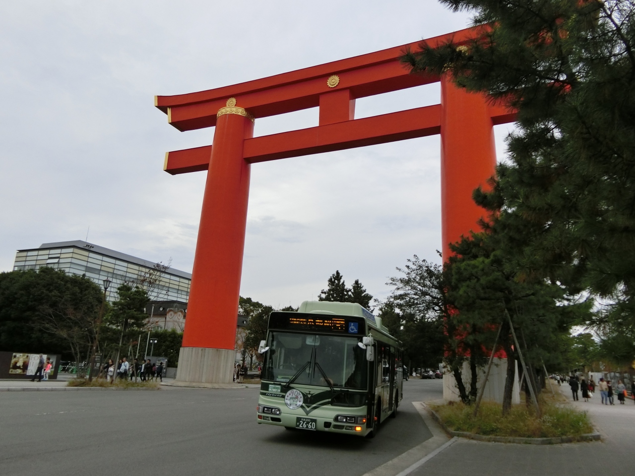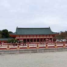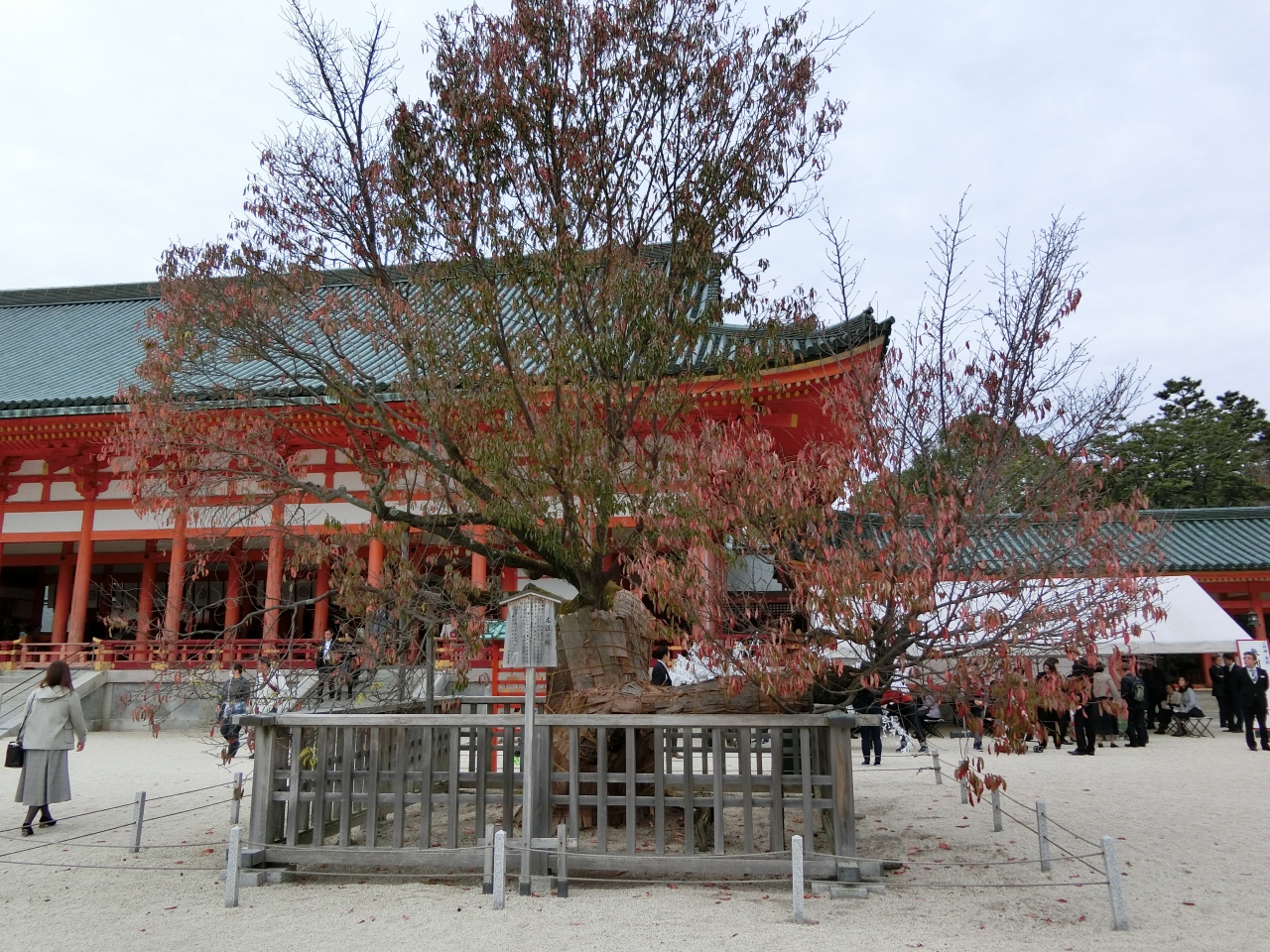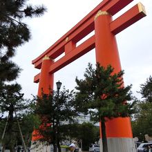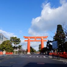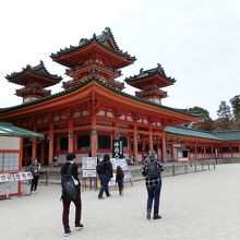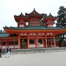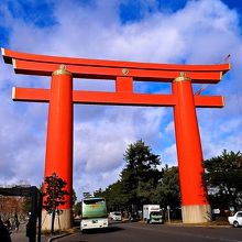1895年、平安遷都1100年を記念して創建された神社。24mの高さがあり、国の登録有形文化財になっている大鳥居が神宮道をまたぐ。鮮やかな朱色と緑に塗りわけられた社殿は、朝堂院を模している。広大な庭園には珍しい鳥類や、甲羅に草を生やすミノガメ、本州では珍しい南石亀などが生息する。