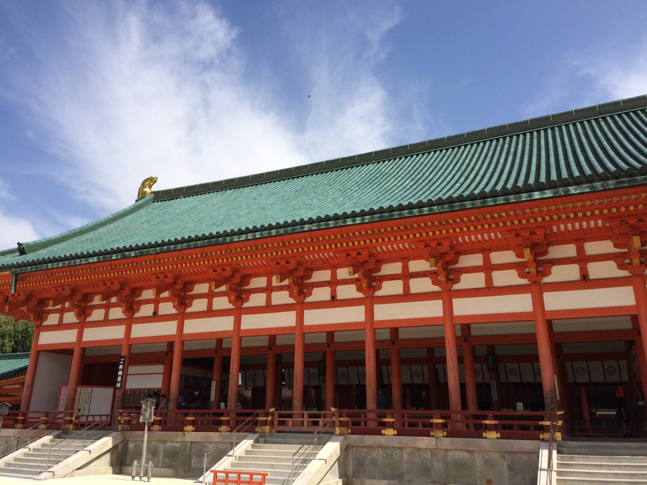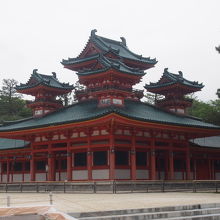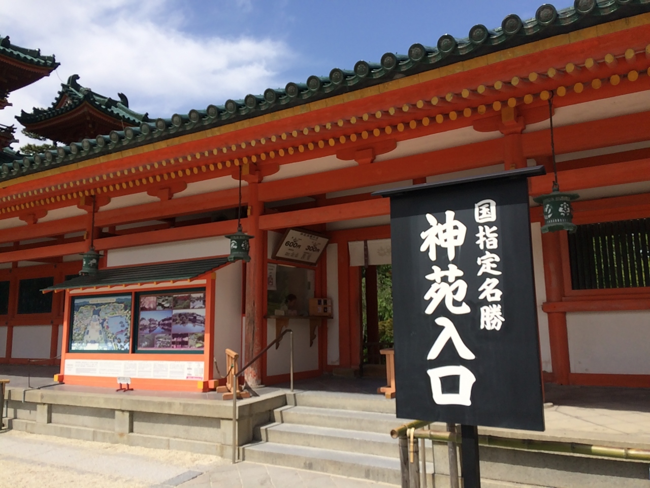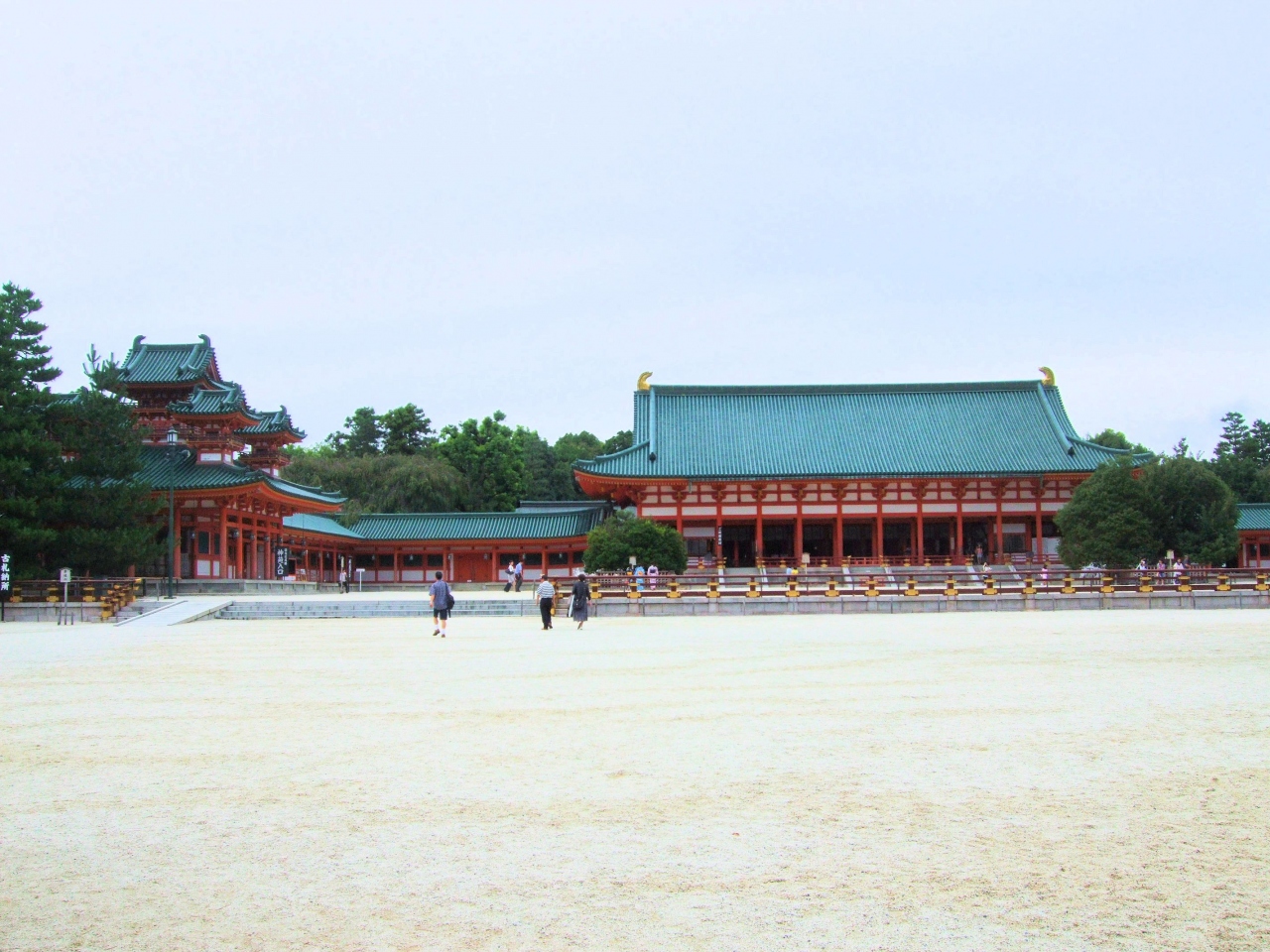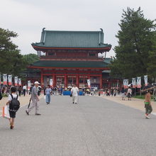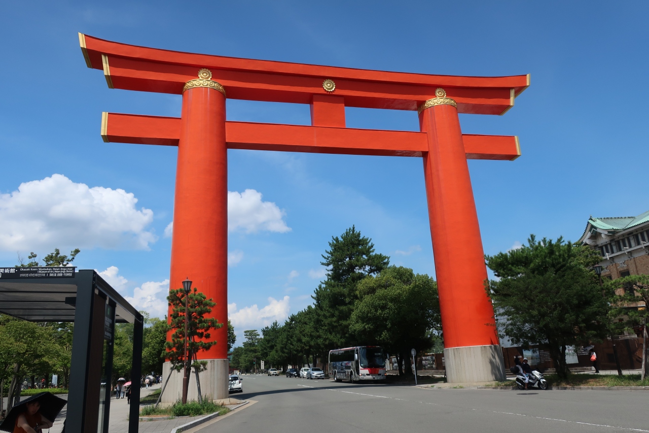 1895年、平安遷都1100年を記念して創建された神社。24mの高さがあり、国の登録有形文化財になっている大鳥居が神宮道をまたぐ。鮮やかな朱色と緑に塗りわけられた社殿は、朝堂院を模している。広大な庭園には珍しい鳥類や、甲羅に草を生やすミノガメ、本州では珍しい南石亀などが生息する。