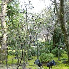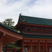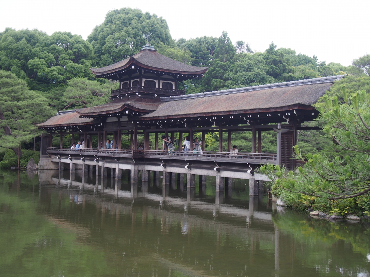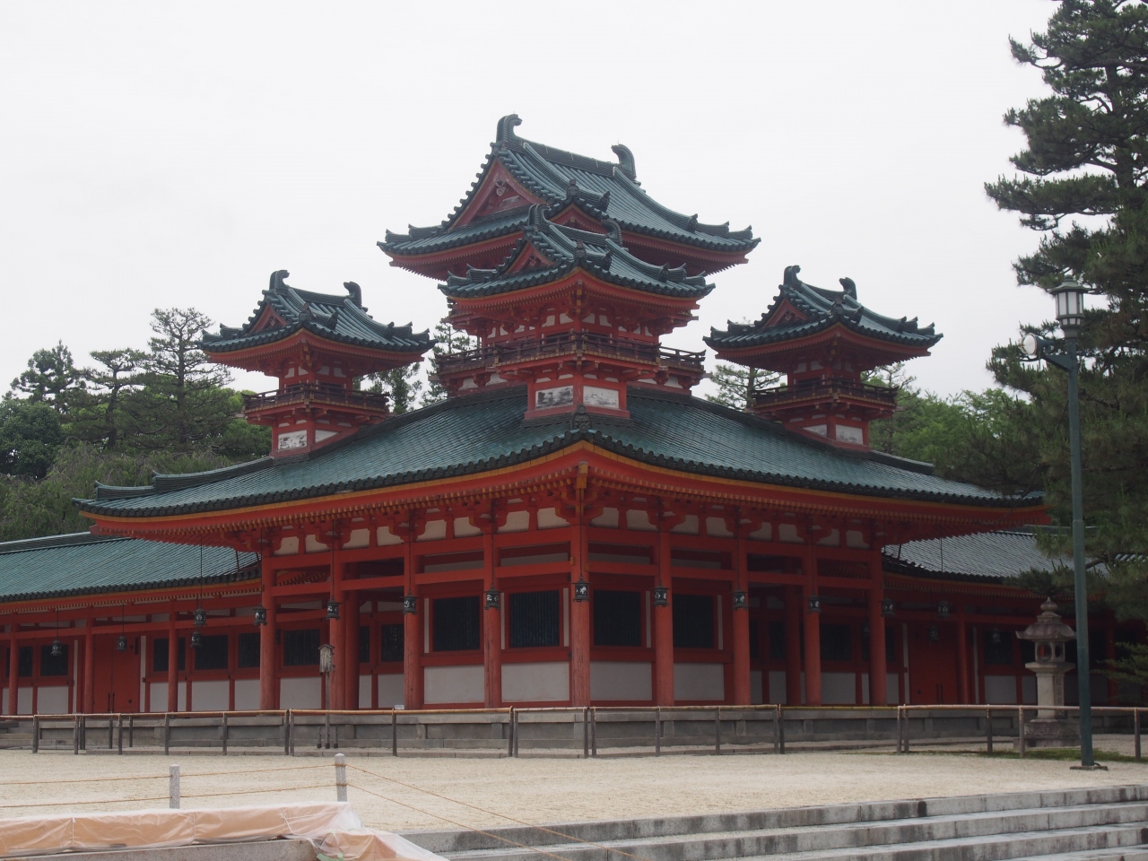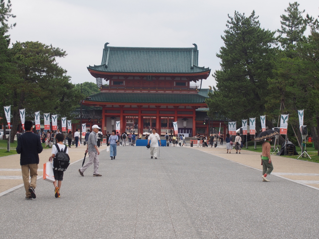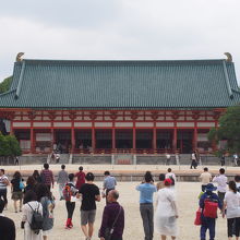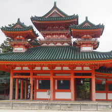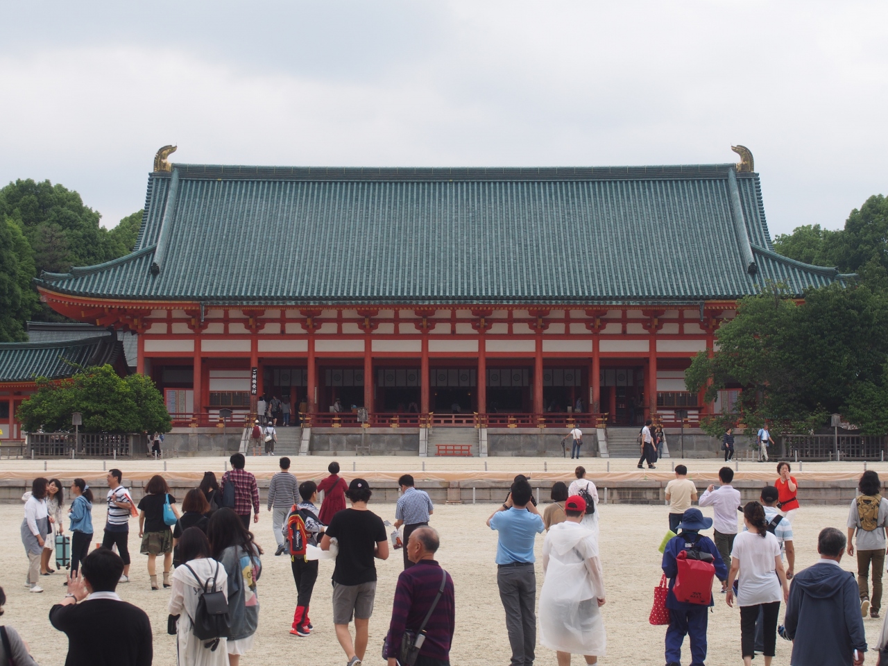 1895年、平安遷都1100年を記念して創建された神社。24mの高さがあり、国の登録有形文化財になっている大鳥居が神宮道をまたぐ。鮮やかな朱色と緑に塗りわけられた社殿は、朝堂院を模している。広大な庭園には珍しい鳥類や、甲羅に草を生やすミノガメ、本州では珍しい南石亀などが生息する。