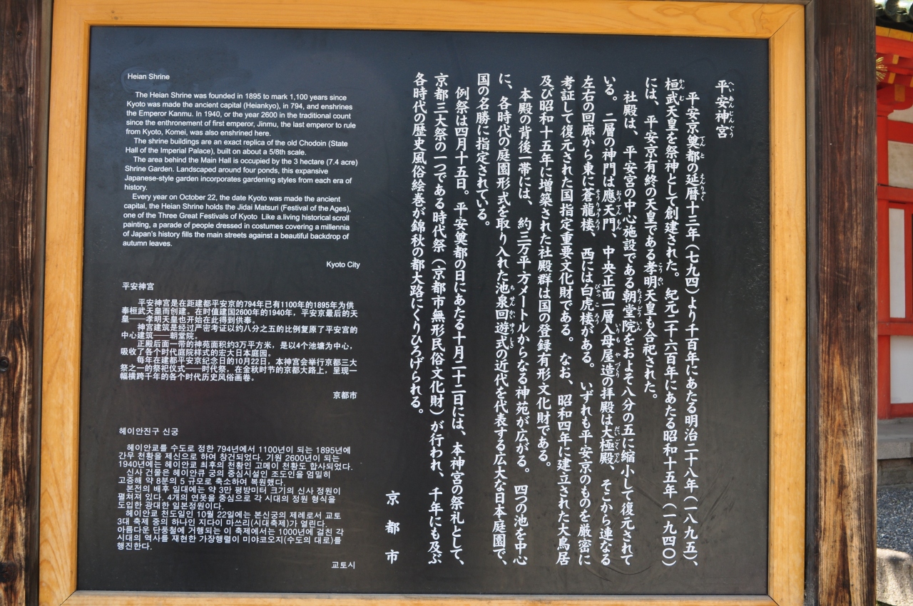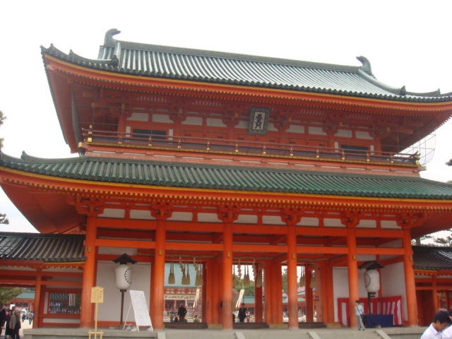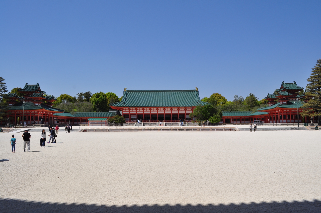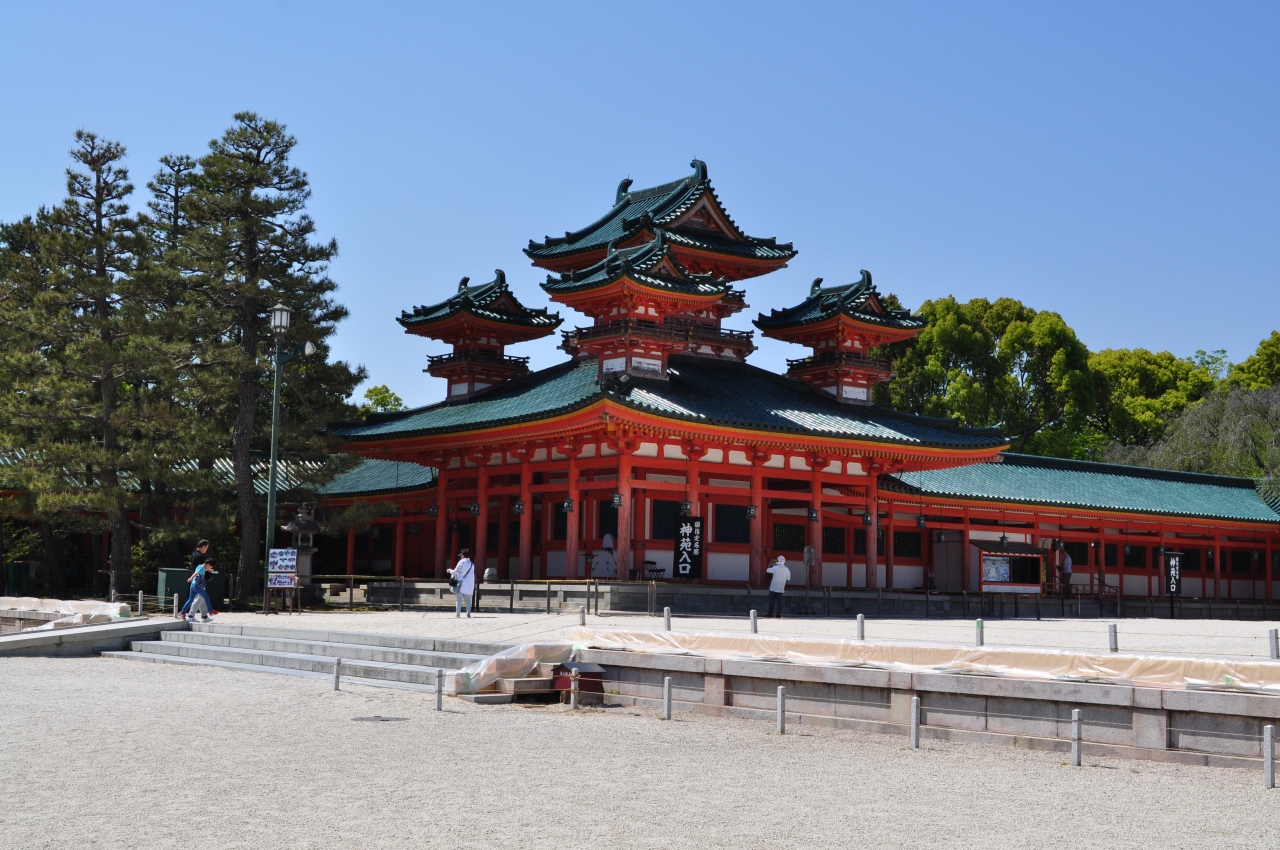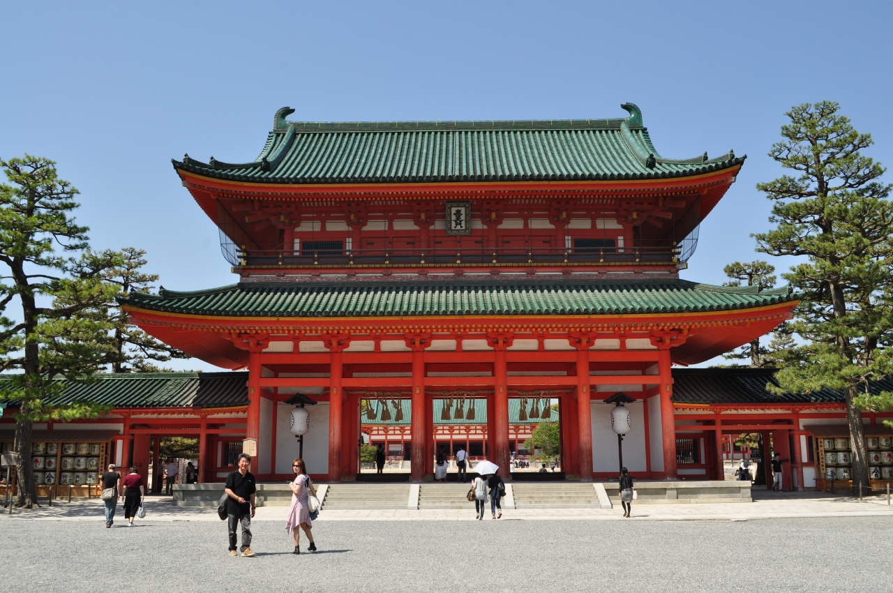 1895年、平安遷都1100年を記念して創建された神社。24mの高さがあり、国の登録有形文化財になっている大鳥居が神宮道をまたぐ。鮮やかな朱色と緑に塗りわけられた社殿は、朝堂院を模している。広大な庭園には珍しい鳥類や、甲羅に草を生やすミノガメ、本州では珍しい南石亀などが生息する。