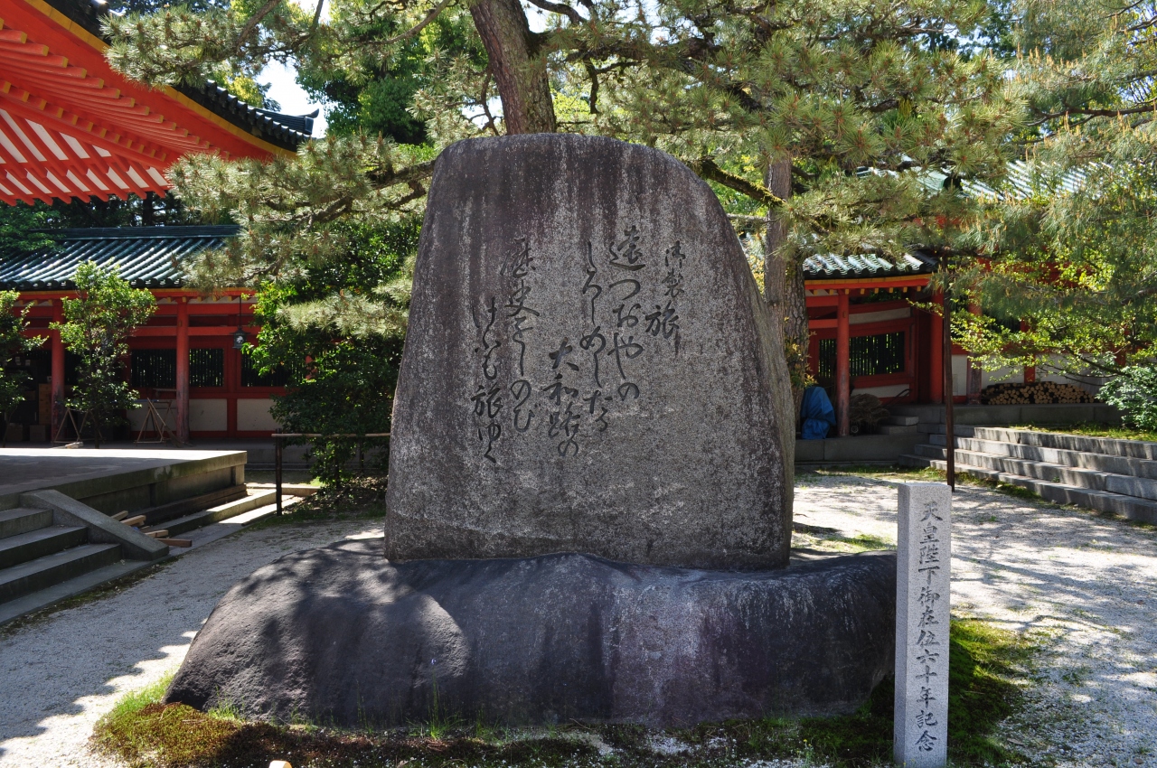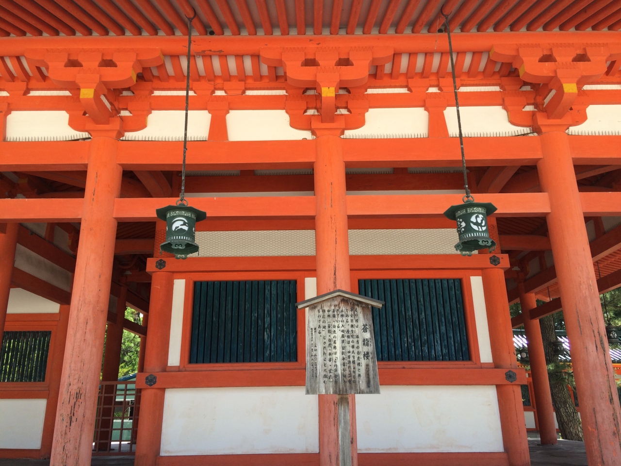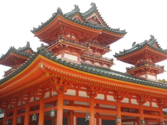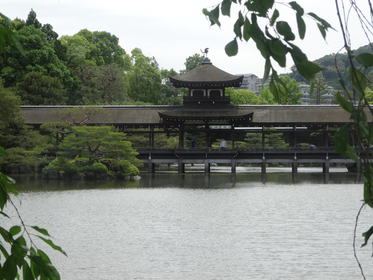 1895年、平安遷都1100年を記念して創建された神社。24mの高さがあり、国の登録有形文化財になっている大鳥居が神宮道をまたぐ。鮮やかな朱色と緑に塗りわけられた社殿は、朝堂院を模している。広大な庭園には珍しい鳥類や、甲羅に草を生やすミノガメ、本州では珍しい南石亀などが生息する。