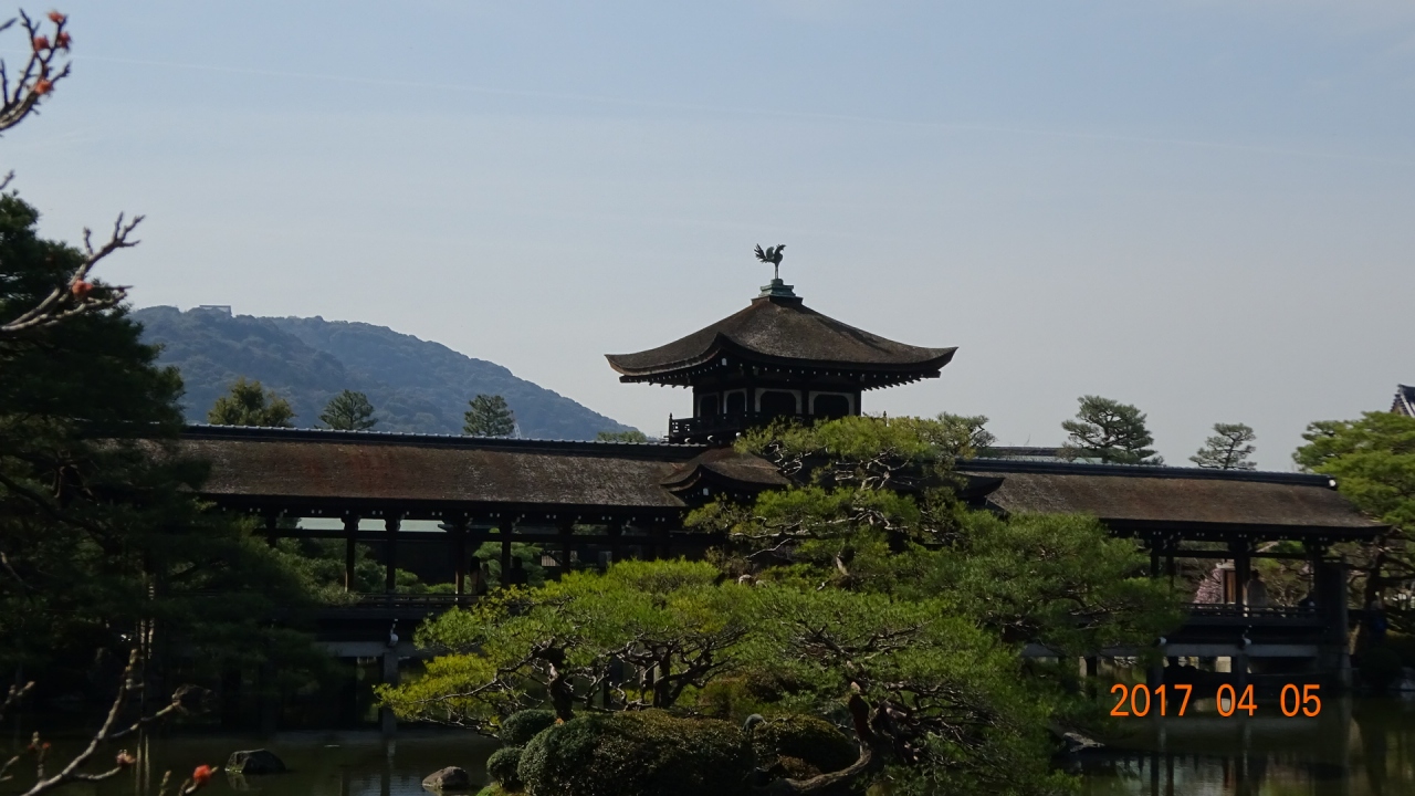 1895年、平安遷都1100年を記念して創建された神社。24mの高さがあり、国の登録有形文化財になっている大鳥居が神宮道をまたぐ。鮮やかな朱色と緑に塗りわけられた社殿は、朝堂院を模している。広大な庭園には珍しい鳥類や、甲羅に草を生やすミノガメ、本州では珍しい南石亀などが生息する。