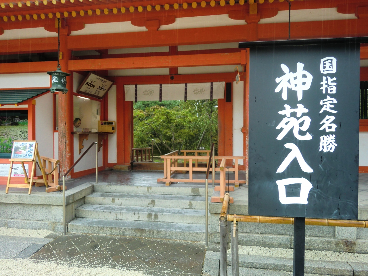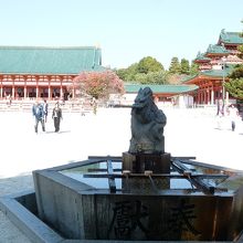 1895年、平安遷都1100年を記念して創建された神社。24mの高さがあり、国の登録有形文化財になっている大鳥居が神宮道をまたぐ。鮮やかな朱色と緑に塗りわけられた社殿は、朝堂院を模している。広大な庭園には珍しい鳥類や、甲羅に草を生やすミノガメ、本州では珍しい南石亀などが生息する。