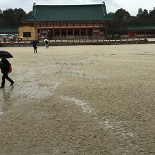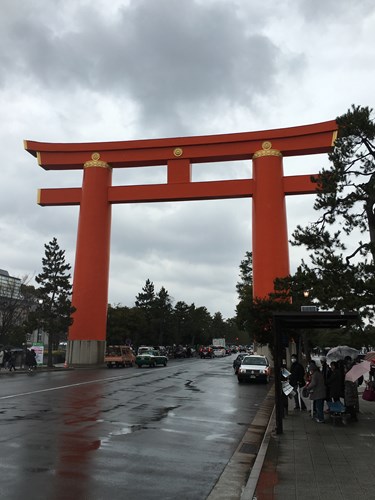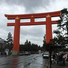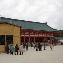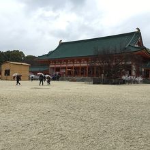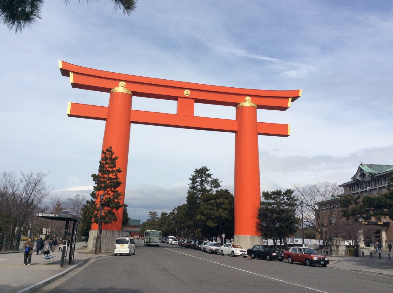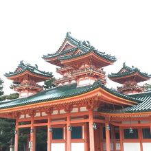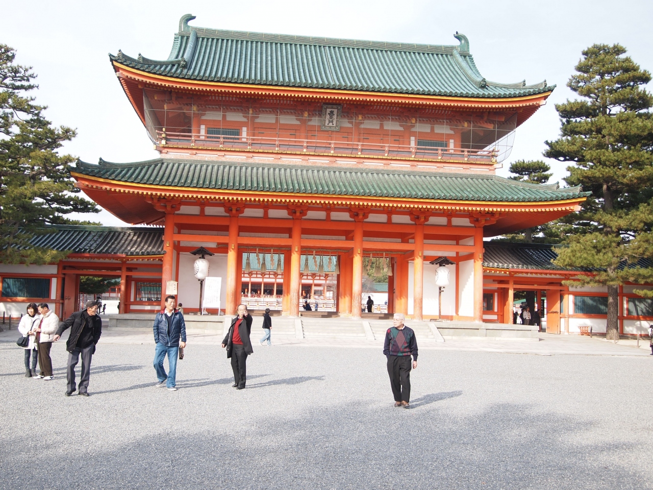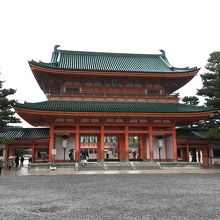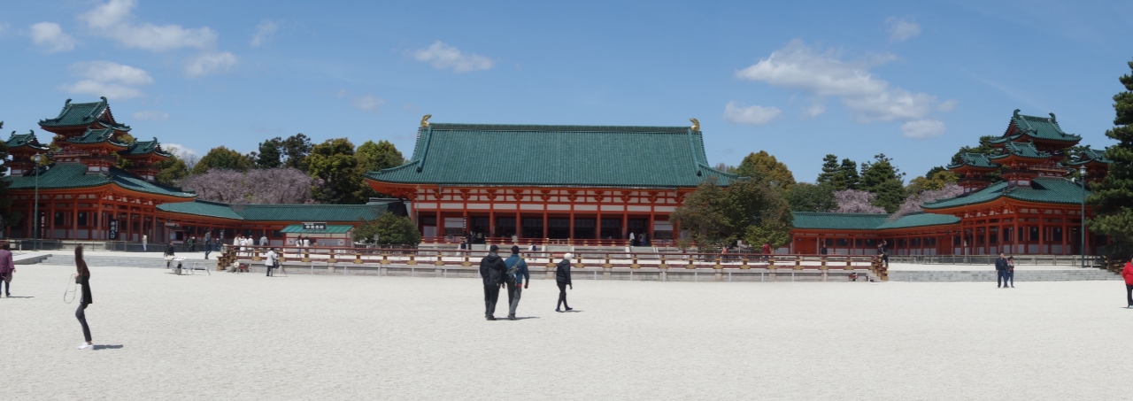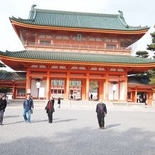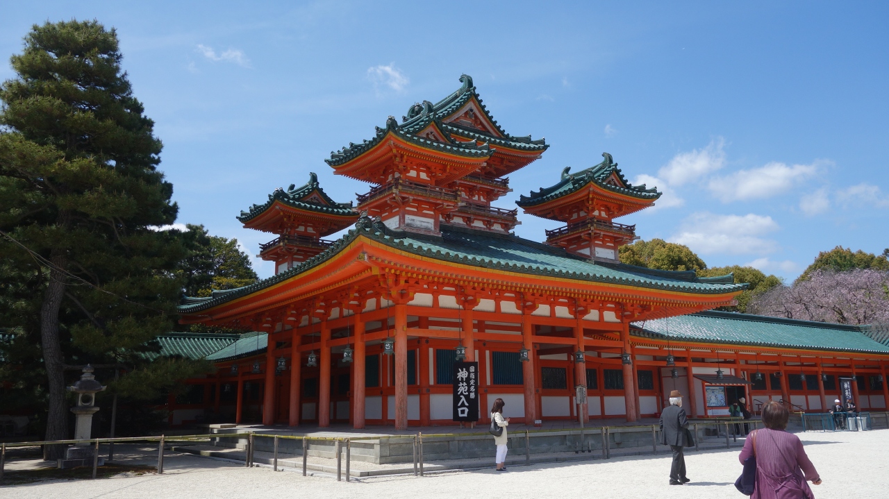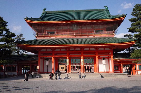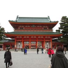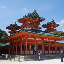 1895年、平安遷都1100年を記念して創建された神社。24mの高さがあり、国の登録有形文化財になっている大鳥居が神宮道をまたぐ。鮮やかな朱色と緑に塗りわけられた社殿は、朝堂院を模している。広大な庭園には珍しい鳥類や、甲羅に草を生やすミノガメ、本州では珍しい南石亀などが生息する。