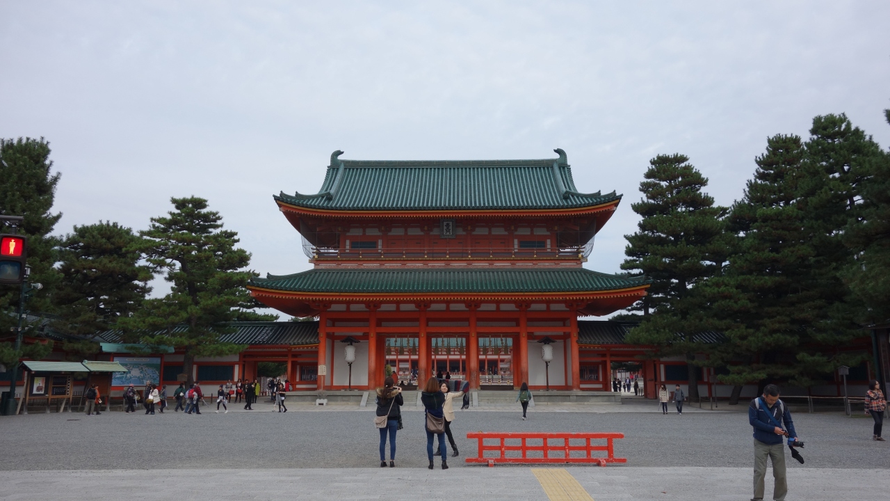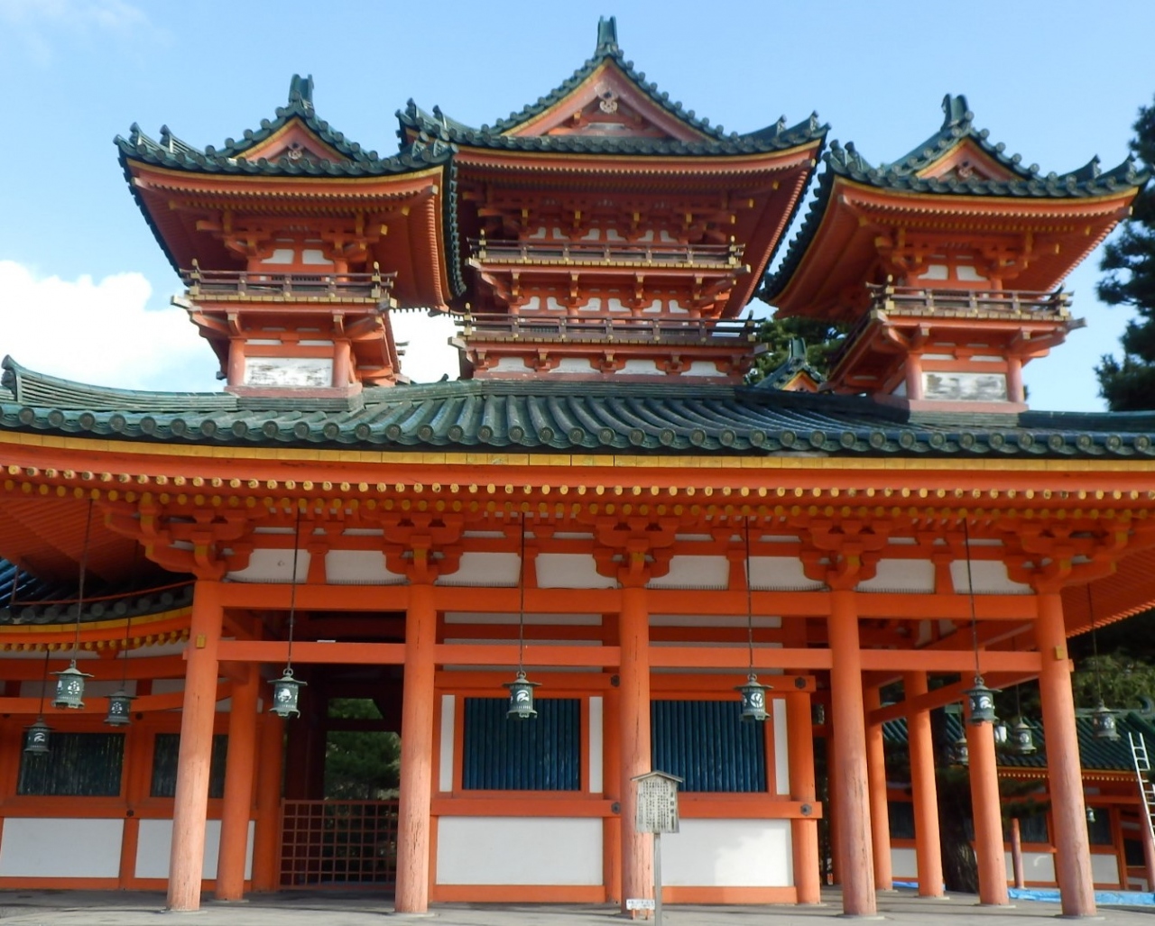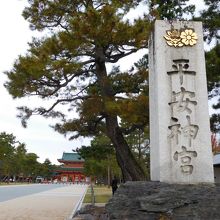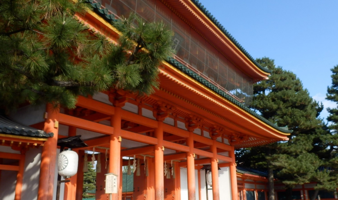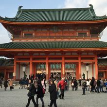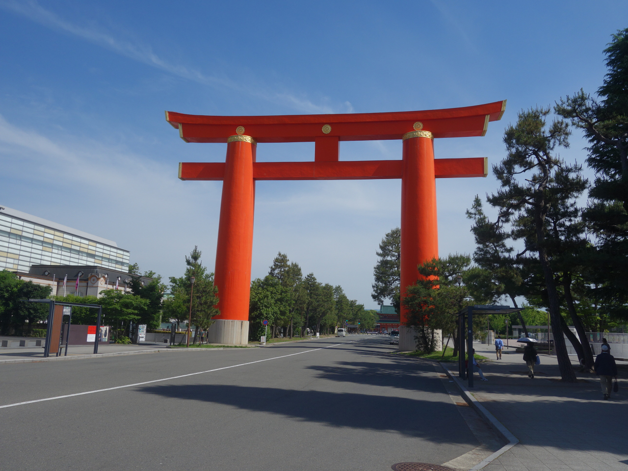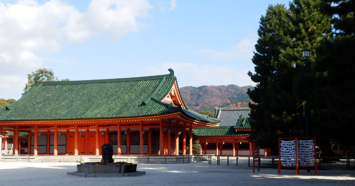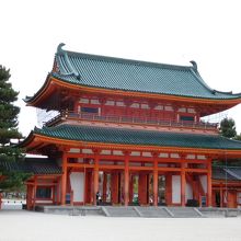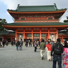 1895年、平安遷都1100年を記念して創建された神社。24mの高さがあり、国の登録有形文化財になっている大鳥居が神宮道をまたぐ。鮮やかな朱色と緑に塗りわけられた社殿は、朝堂院を模している。広大な庭園には珍しい鳥類や、甲羅に草を生やすミノガメ、本州では珍しい南石亀などが生息する。