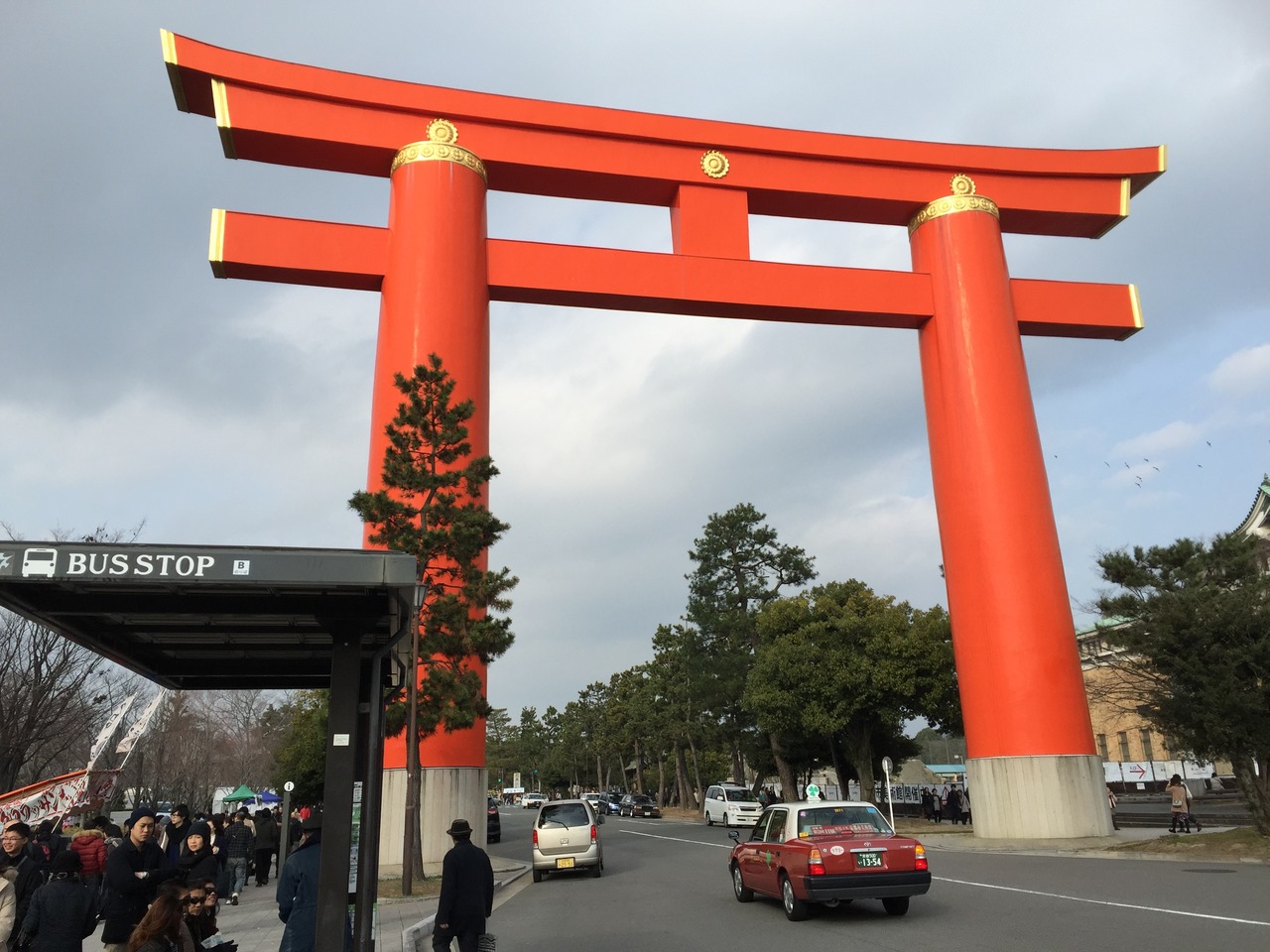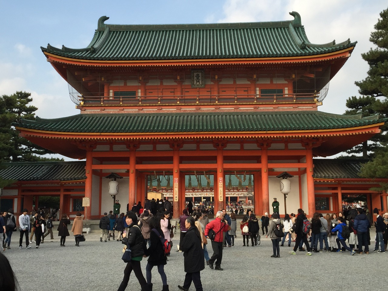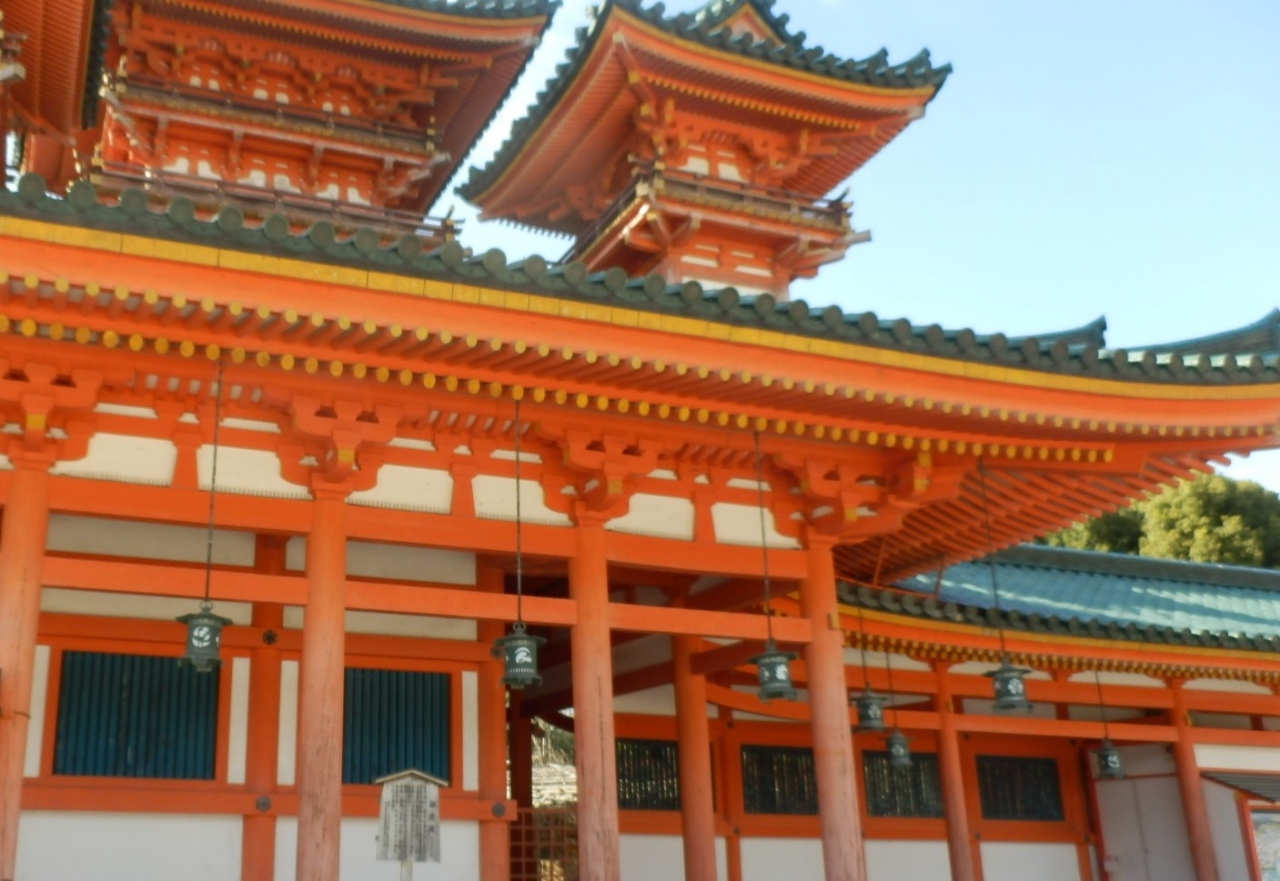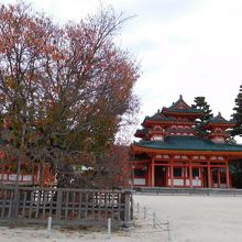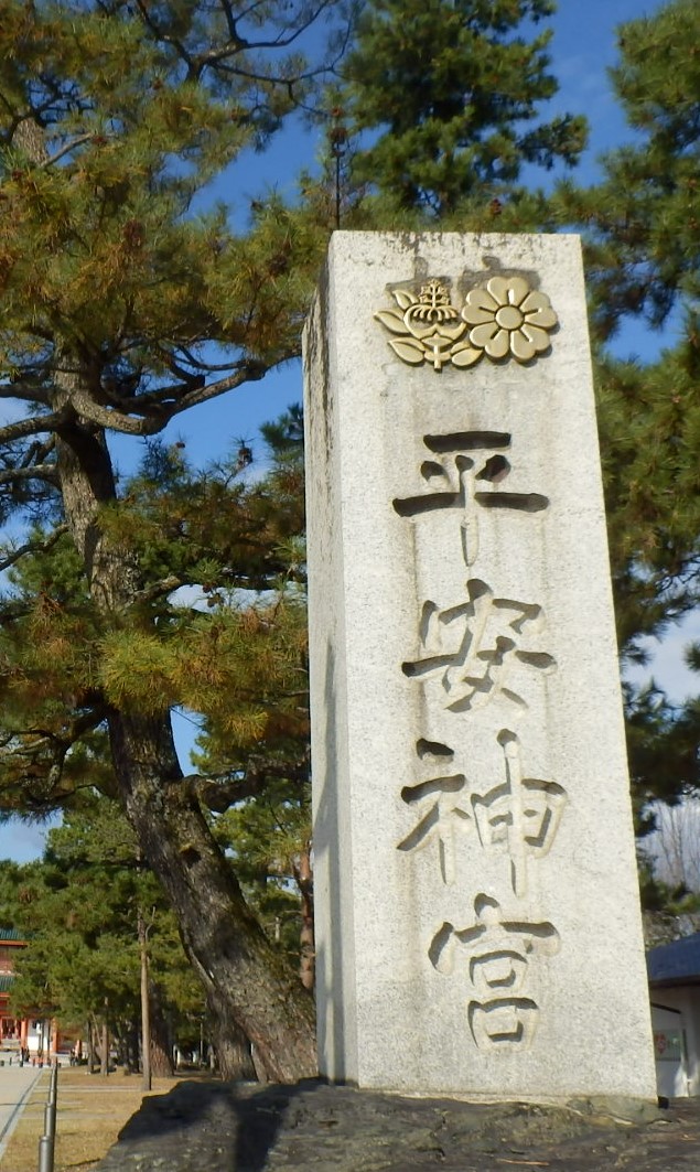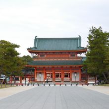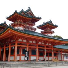 1895年、平安遷都1100年を記念して創建された神社。24mの高さがあり、国の登録有形文化財になっている大鳥居が神宮道をまたぐ。鮮やかな朱色と緑に塗りわけられた社殿は、朝堂院を模している。広大な庭園には珍しい鳥類や、甲羅に草を生やすミノガメ、本州では珍しい南石亀などが生息する。