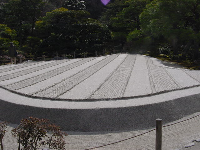 銀閣寺境内にある向月台と銀沙灘と呼ばれる砂盛り。これらの砂盛りは月待山に上る月を観賞する為に作られたという説と月の光を反射...  続きを読むさせて本堂を照らす役割があるという説の2つの説があるみたいですが、どちらの説も決め手に欠けるそうです。どちらにしても共に「月」に関係するものであることは間違いのないようで、ここから金閣寺=太陽、銀閣寺=月というイメージが生まれたのかもしれません。  閉じる