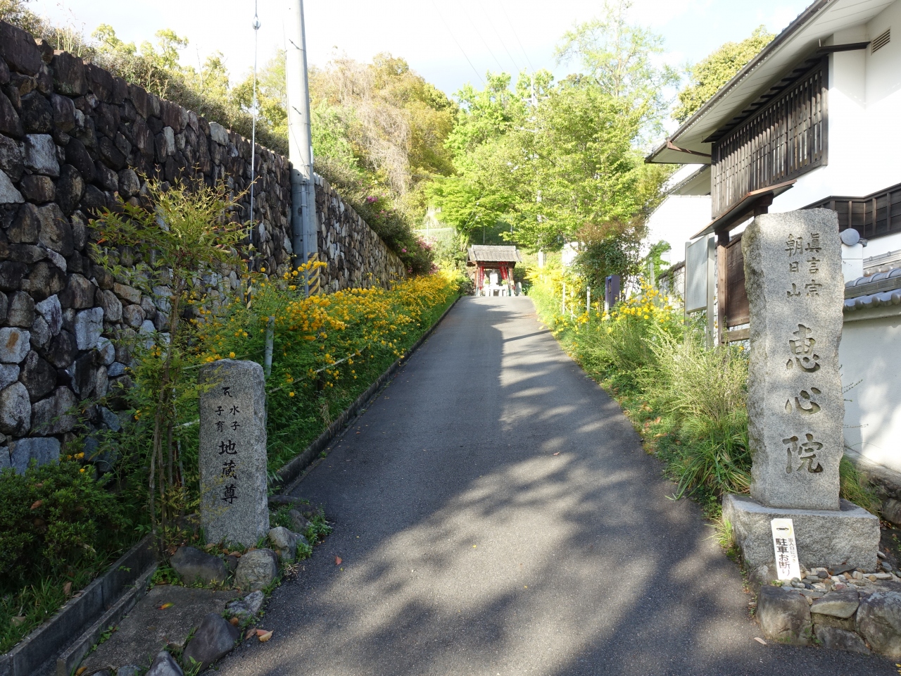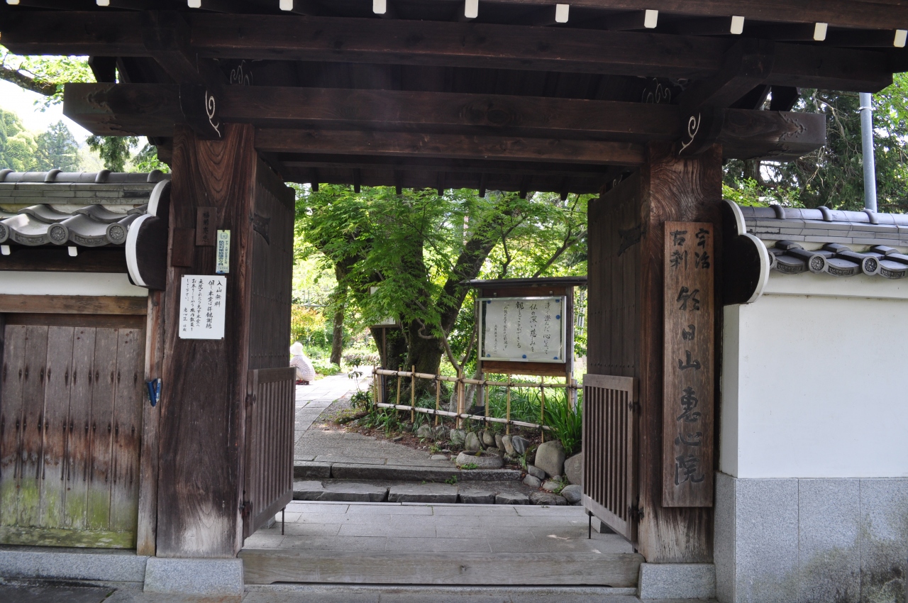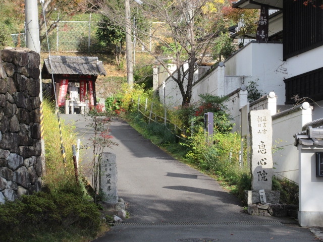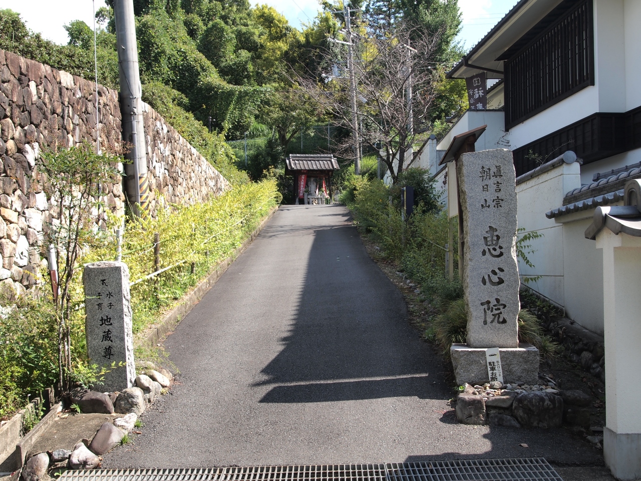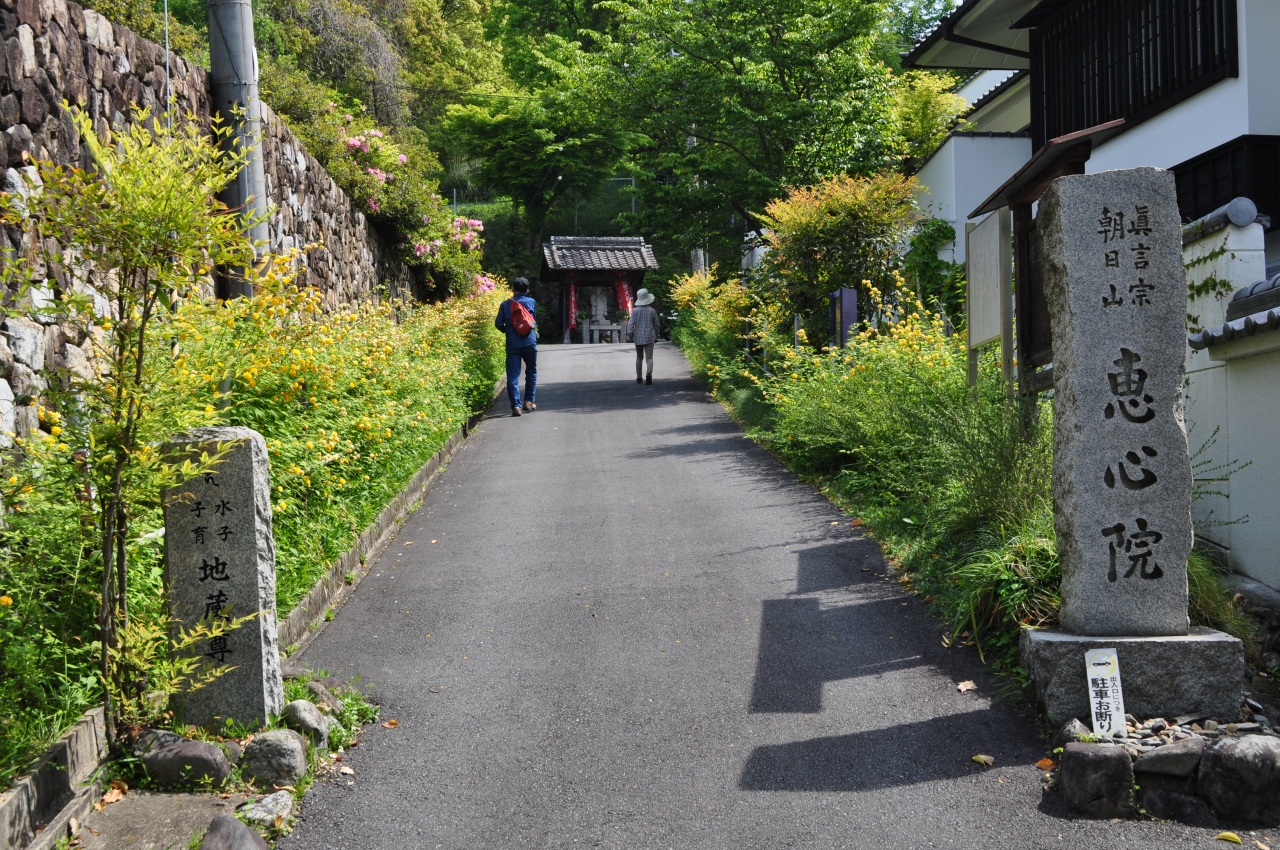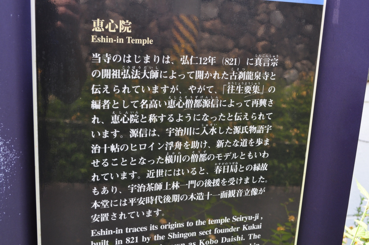 春や秋の季節には境内に植えられた数多くの花々が心を和ませてくれる「花の寺」として知られています。当寺のはじまりは、古刹龍泉寺と伝えられていますが、やがて「往生要集」の著者として名高い恵心僧都源信(えしんそうずげんしん)によって再興され、恵心院と称するようになりました。源信は、宇治川に入水した源氏物語宇治十帖のヒロイン浮舟を助け、新たな道を歩ませることとなった横川の僧都のモデルともいわれています。