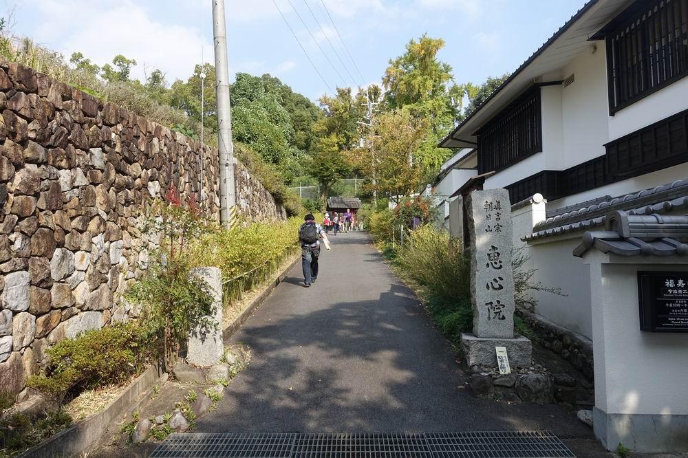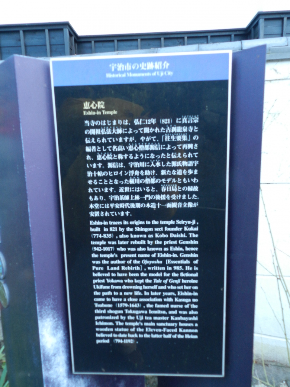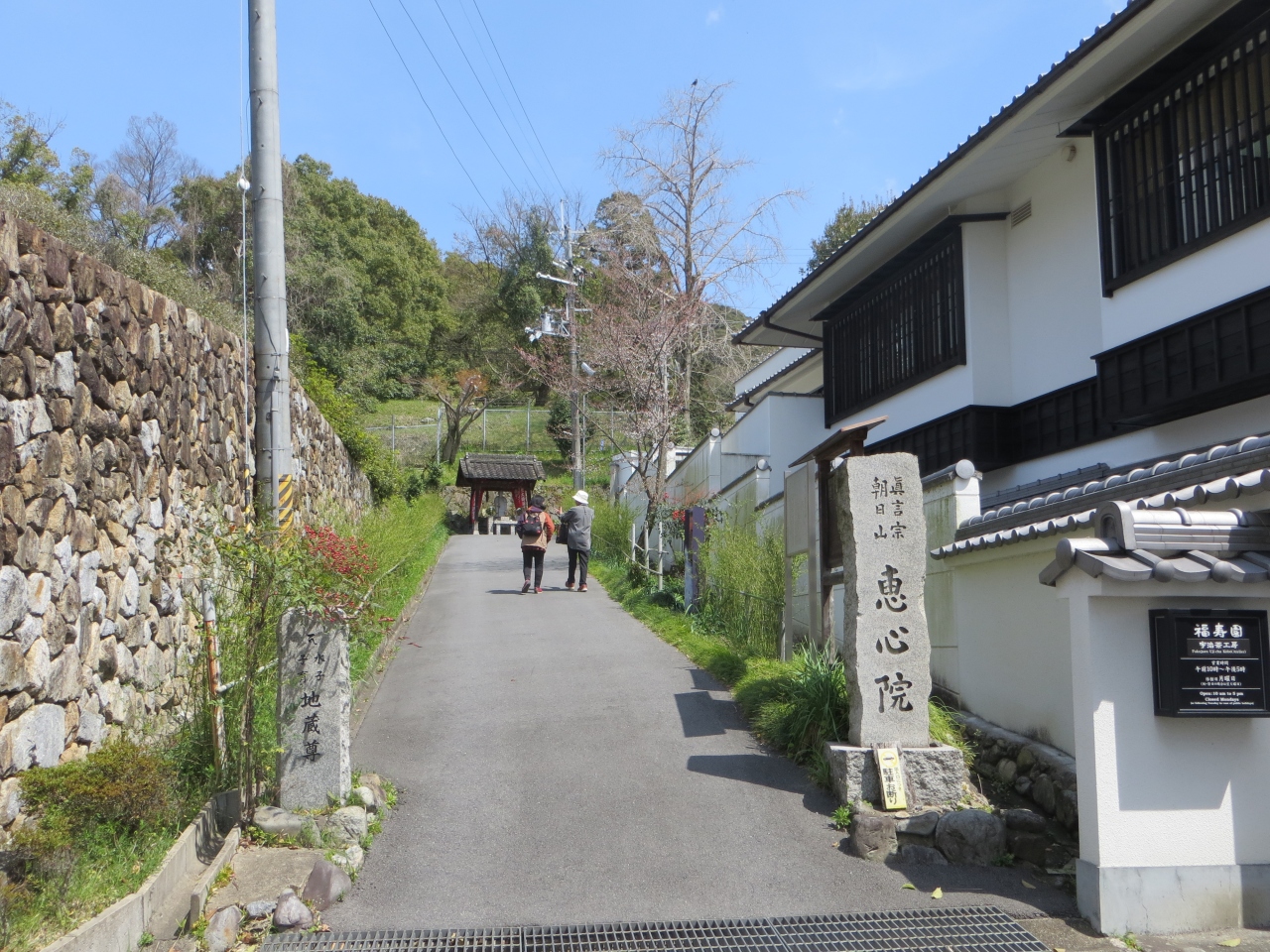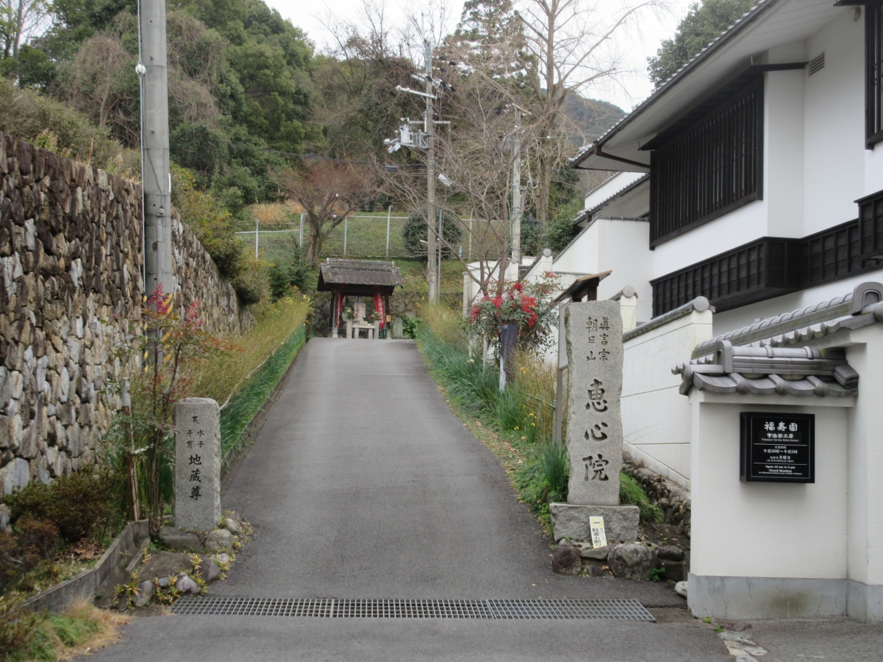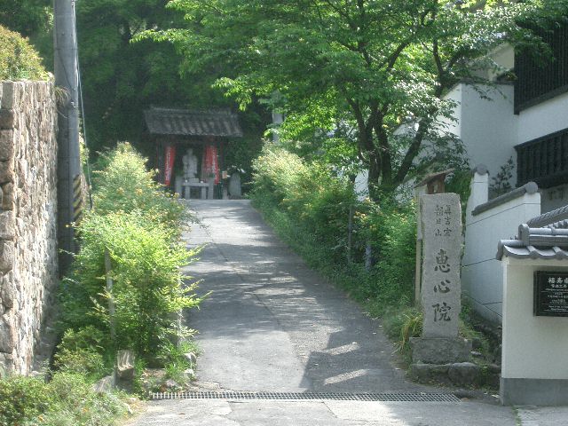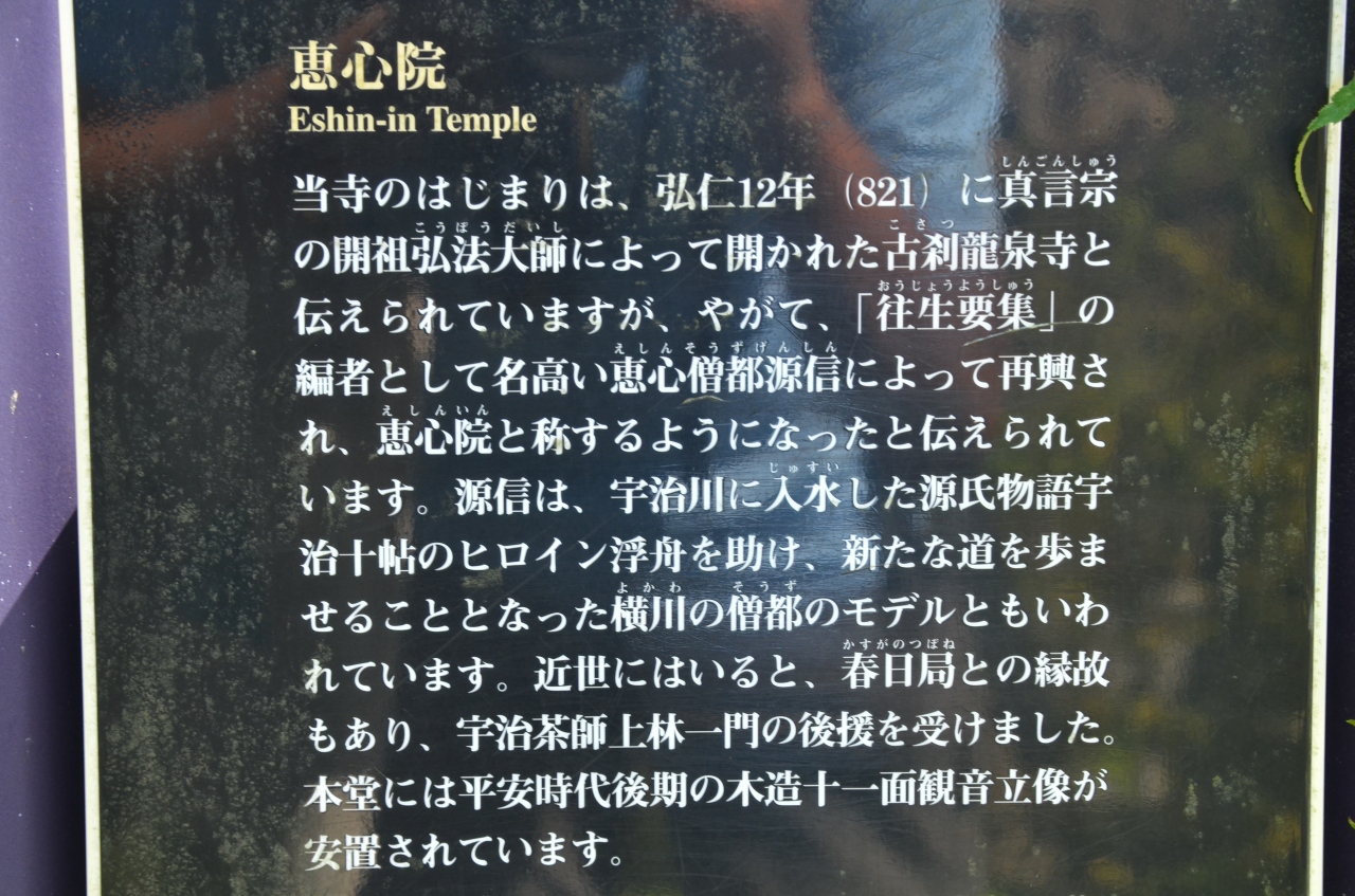 春や秋の季節には境内に植えられた数多くの花々が心を和ませてくれる「花の寺」として知られています。当寺のはじまりは、古刹龍泉寺と伝えられていますが、やがて「往生要集」の著者として名高い恵心僧都源信(えしんそうずげんしん)によって再興され、恵心院と称するようになりました。源信は、宇治川に入水した源氏物語宇治十帖のヒロイン浮舟を助け、新たな道を歩ませることとなった横川の僧都のモデルともいわれています。