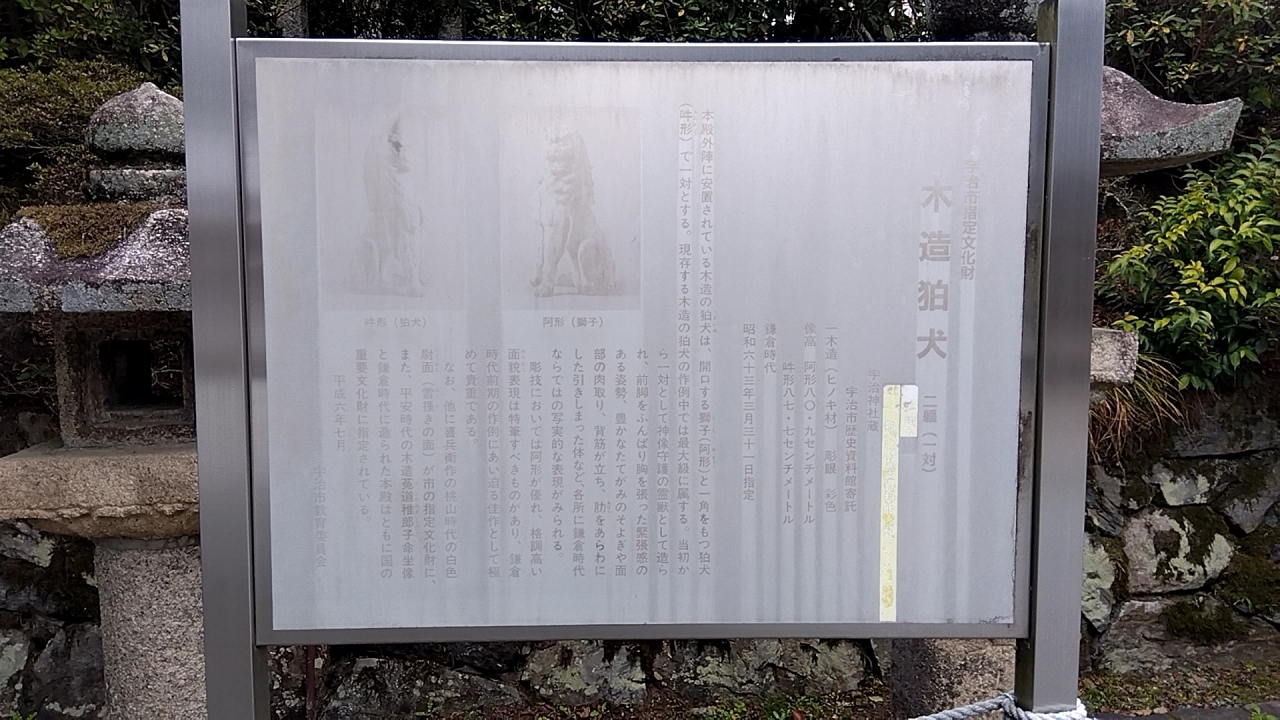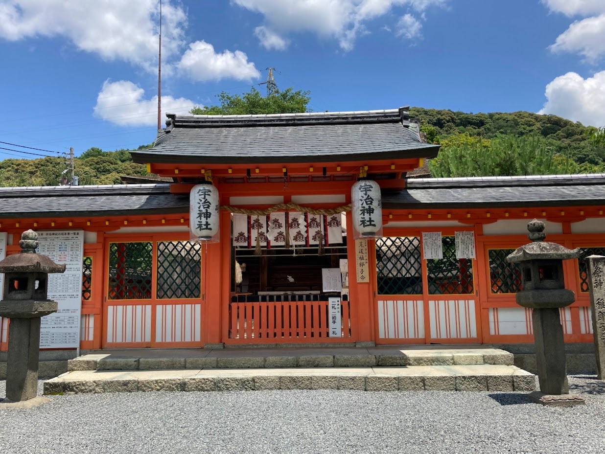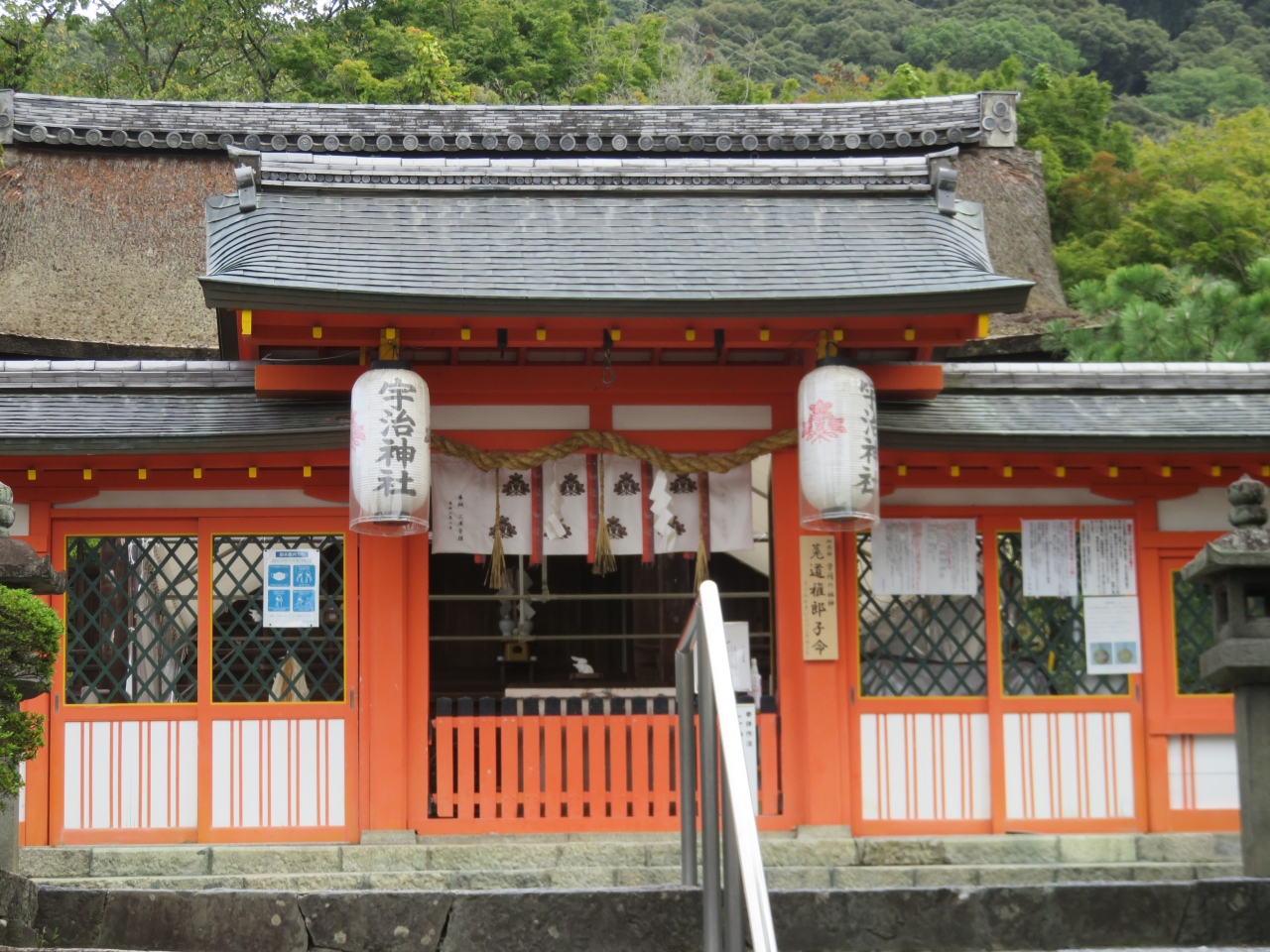 宇治川沿いに建つ宇治神社は、平安時代創建と伝えられ、古くは離宮八幡宮(桐原日桁宮(きりはらひげたのみや))と称し、祭神は応神天皇の皇子莵道稚郎子(うじのわきいらつこ)とされている。三間社流造りの本殿(重文)は鎌倉時代に建立されたものだが、他にも木造狛犬や白色尉面など貴重な文化財が伝わっている。