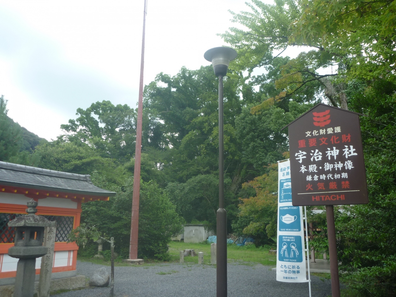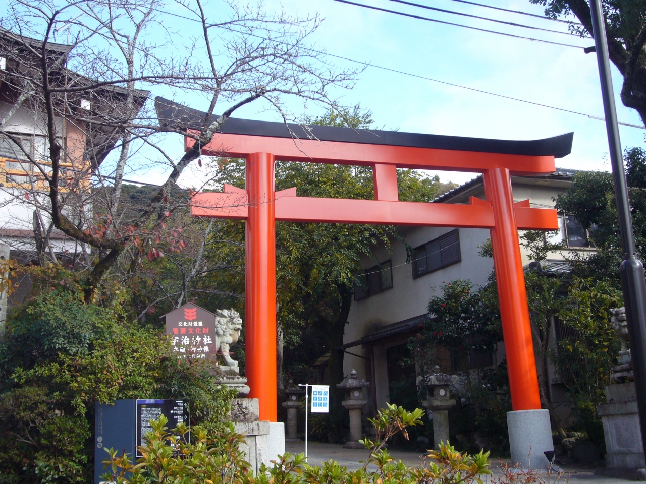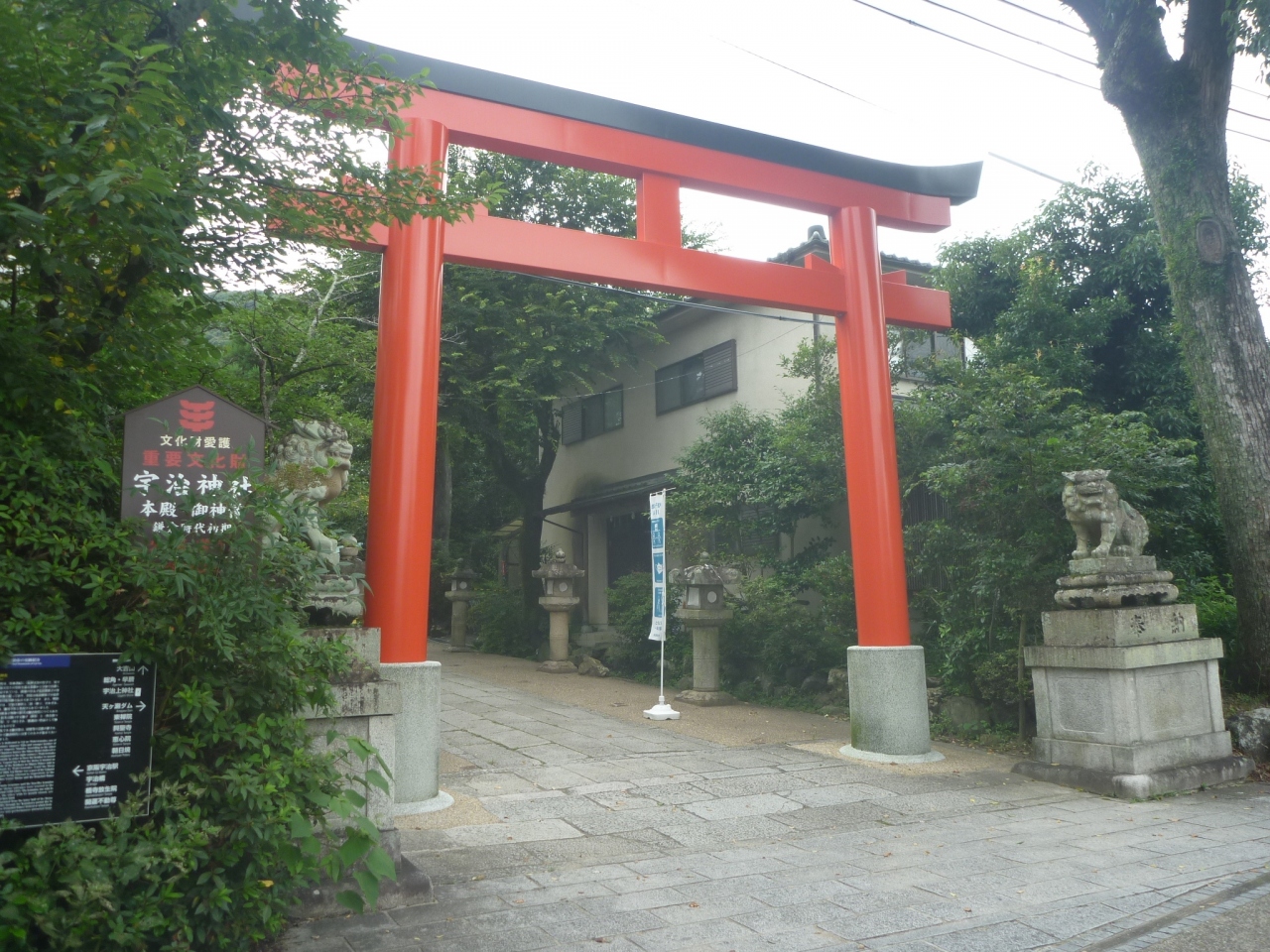 宇治川沿いに建つ宇治神社は、平安時代創建と伝えられ、古くは離宮八幡宮(桐原日桁宮(きりはらひげたのみや))と称し、祭神は応神天皇の皇子莵道稚郎子(うじのわきいらつこ)とされている。三間社流造りの本殿(重文)は鎌倉時代に建立されたものだが、他にも木造狛犬や白色尉面など貴重な文化財が伝わっている。