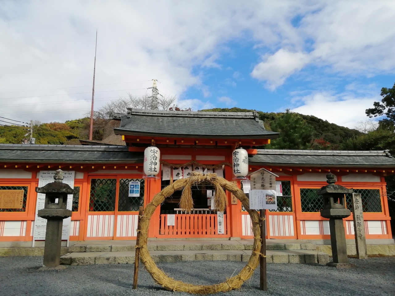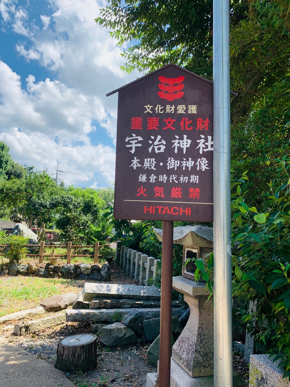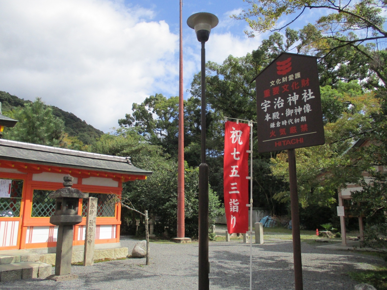 宇治川沿いに建つ宇治神社は、平安時代創建と伝えられ、古くは離宮八幡宮(桐原日桁宮(きりはらひげたのみや))と称し、祭神は応神天皇の皇子莵道稚郎子(うじのわきいらつこ)とされている。三間社流造りの本殿(重文)は鎌倉時代に建立されたものだが、他にも木造狛犬や白色尉面など貴重な文化財が伝わっている。