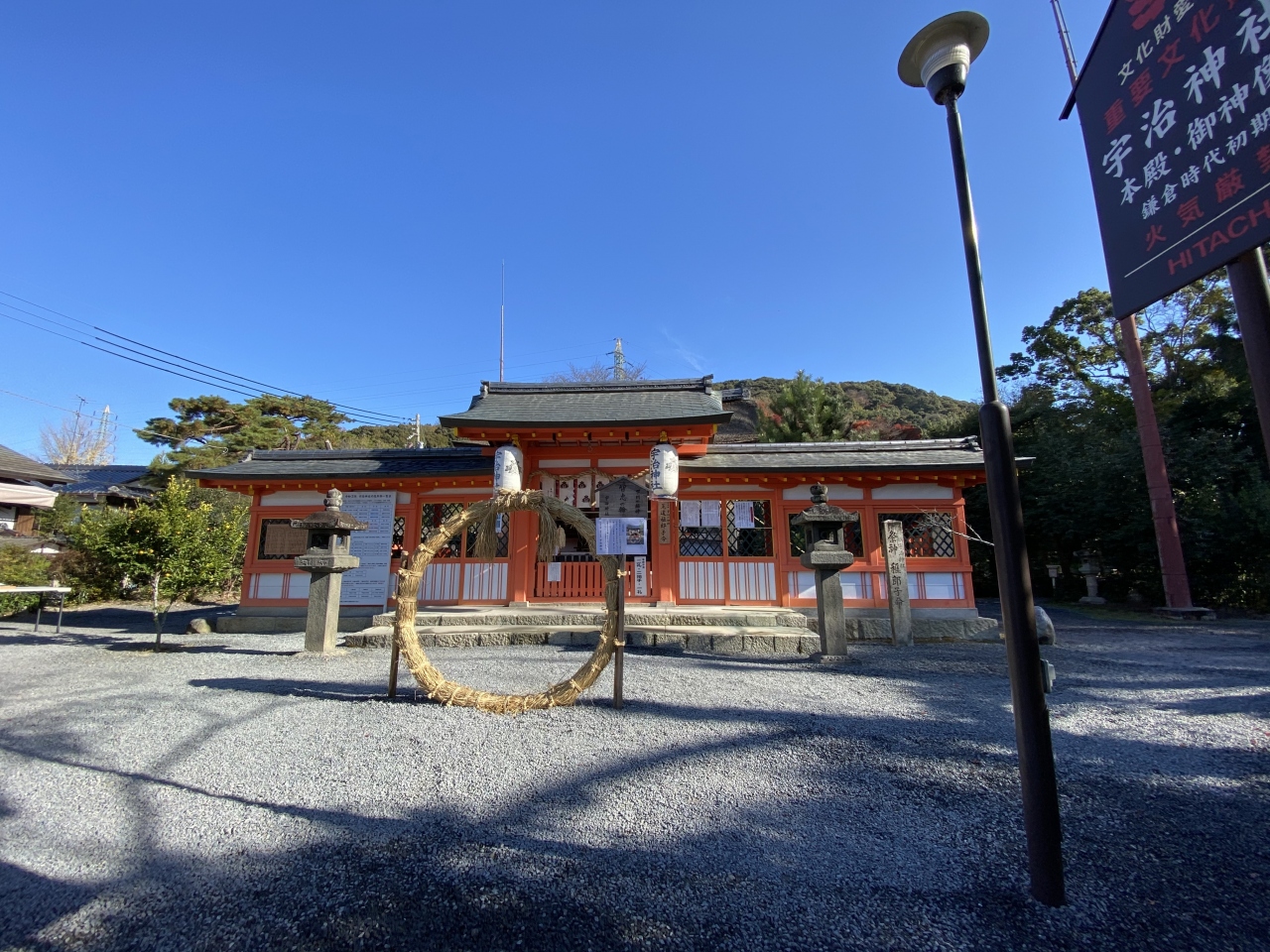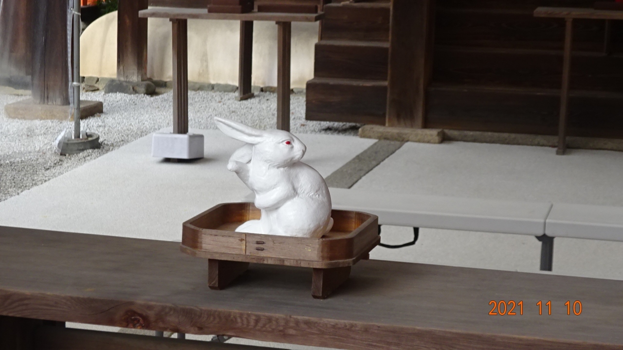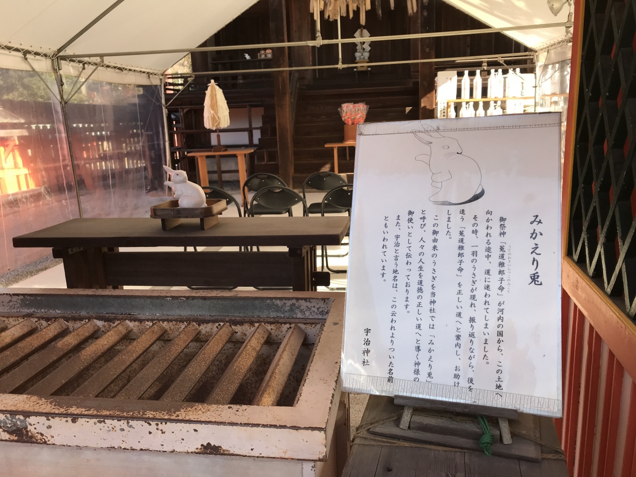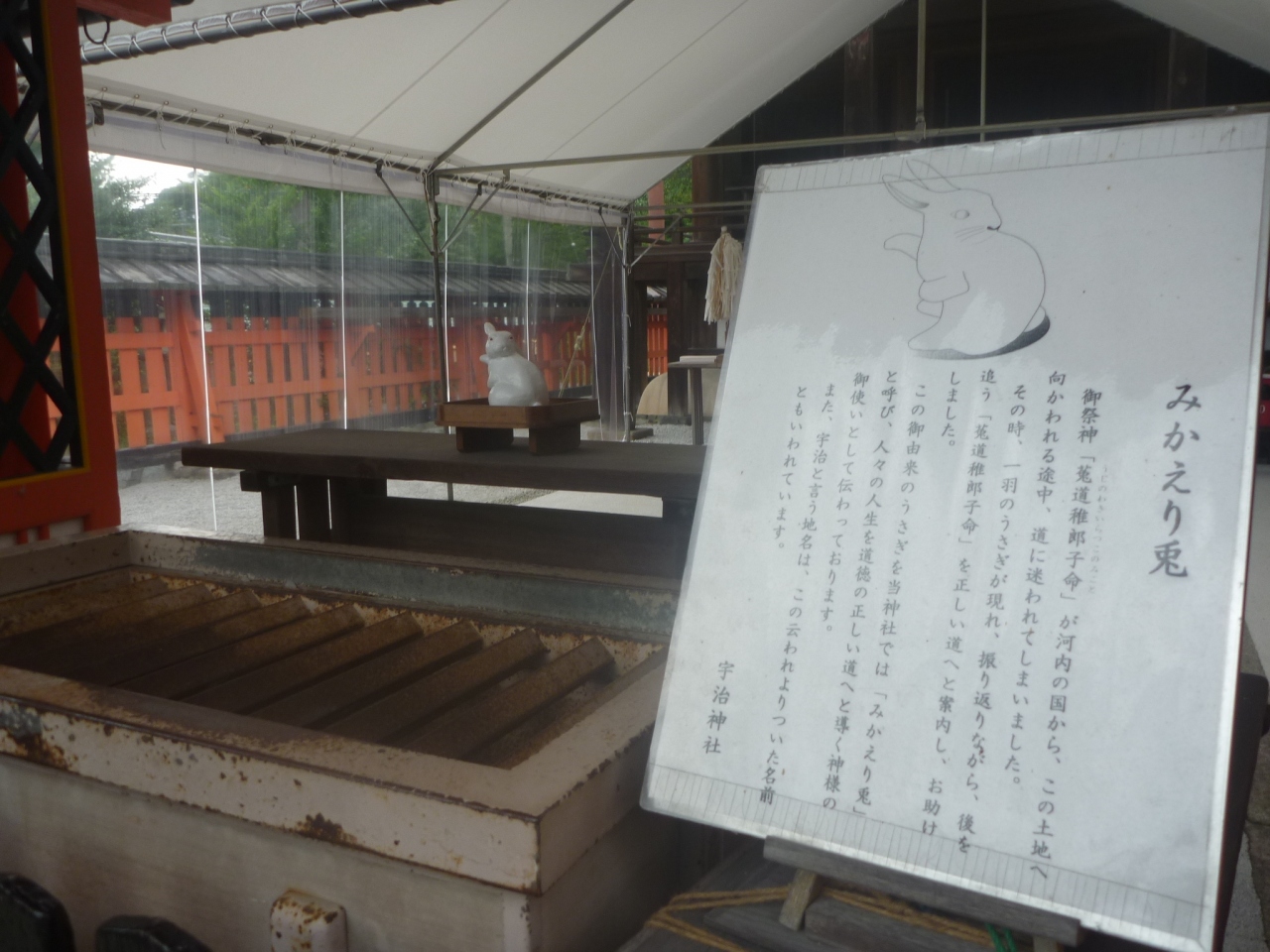 宇治神社は、宇治川東岸、朝日山の山裾にある神社です。宇治神社には、日本書紀に「兄である仁徳天皇との皇位を巡る葛藤から宇治で... 続きを読む自殺した」 と記されている皇太子 菟道稚郎子の等身大坐像を祀っているそうです。この辺りは菟道稚郎子が造営した桐原日桁宮跡と伝わっています。赤い鳥居の奥に見える本殿は、三間社流造り桧皮葺きの社殿で、鎌倉時代初期の建物で見ごたえが感じられました。かつてご祭神が宇治までの道を迷っているところ、道案内をしたのが兎だったのだそうです。振り返りながら案内している姿から「みかえり兎」と呼ばれています。正しい人生の道を示す神様の使いとされています。 閉じる