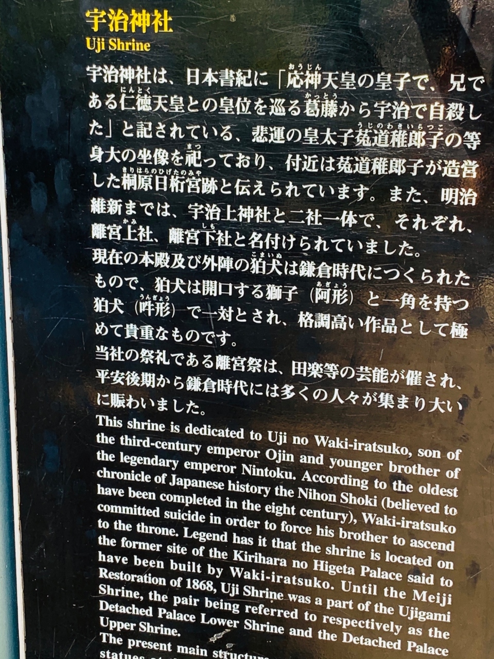 かって宇治離宮八幡と呼ばれていた神社、御祭神は菟道稚郎子命(うじのわきいらつこのみこと)とされておりこの神様の名前が付ける... 続きを読むられた当時は現在の宇治(うじ)は菟道(うじ)と書いていたらしい、所在地を見ると京都府宇治市宇治山田とあった、宇治山田は伊勢神宮の場所と思っていたが京都府宇治市にもあったのにはびっくりした、この神社へ直接行くときは宇治橋東詰から川に沿って徒歩20分進むと川辺に宇治十帖の像があり左側に第一の鳥居がありますのでここから階段を登ります、かなり長い登りです、すこし頑張る必要がある、宇治上神社はここからさらに登り坂を徒歩8分の位置にあります 閉じる