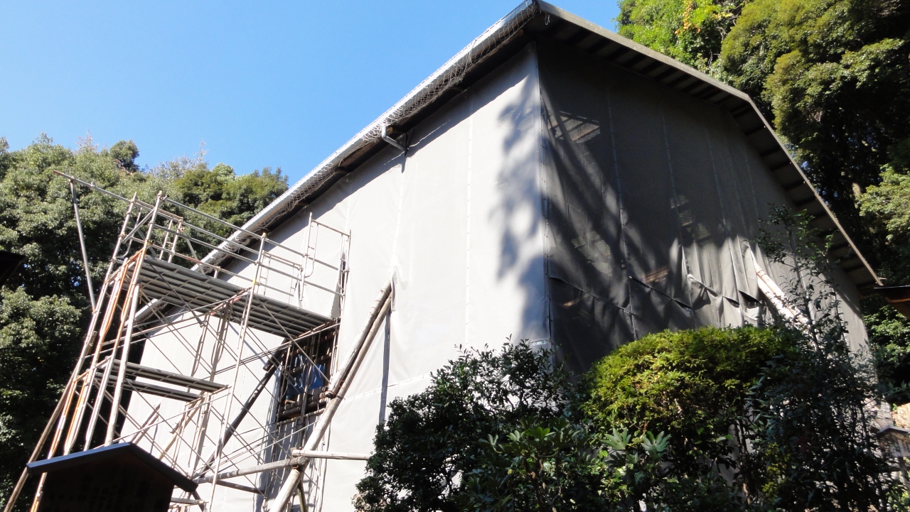 世界遺産 宇治上神社の本殿・拝殿は平成26年の年末まで改修工事のためシートに覆われてみることができません