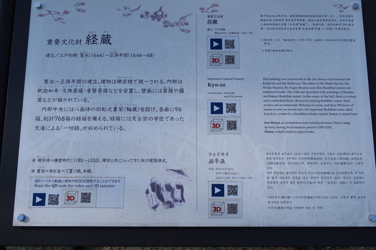 世界遺産「仁和寺」の境内右奥に建つ厳かな経蔵。寛永~正保年間の建立の禅宗様式の建造物で重要文化財に指定されています。天台宗...  続きを読むの学匠であった徳川家康の側近の天海和尚の「一切経」も釈迦如来・文殊菩薩・普賢菩薩などと一緒に納められているようです。格式を感じる経蔵です。  閉じる