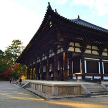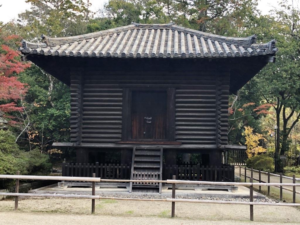 「宝蔵」の先に細い道がありその突き当りにあるのが「新宝蔵」です。途中の右手の「滄海池」には、紅葉が見られ、目の保養になりました。通りかかる人は皆カメラのシャッターを切っていました。「新宝蔵」は、「唐招提寺」が伝える多くの文化財を管理・収蔵するために、昭和45年(1970年)に校倉造りを真似て建てられた収蔵殿です。建築様式は鉄筋コンクリート造りです。「金堂」に安置されていた重要文化財の「木造大日如来坐像」のほか、「旧講堂木彫群」と呼ばれる奈良時代末期に制作された多数の木彫像や「鑑真和上」の渡航を描いた「東征絵巻」などが保管されています。
