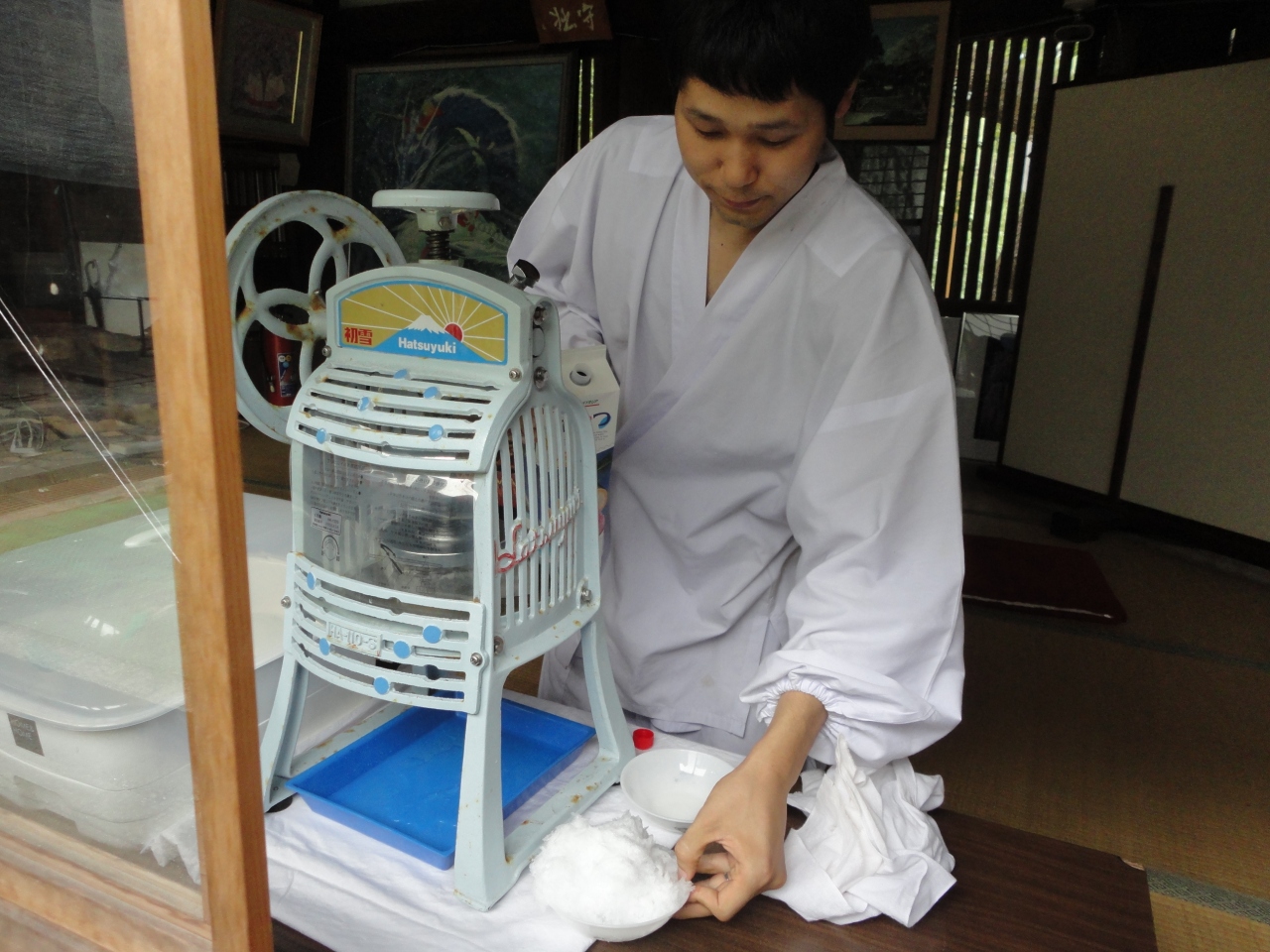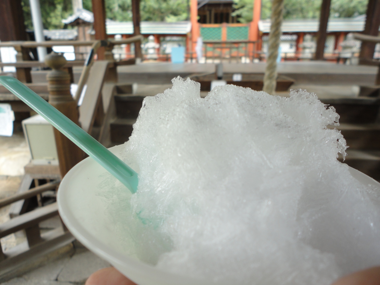 社務所に声をかけると、神社の人が直々にかき氷機で削ってくれはった。