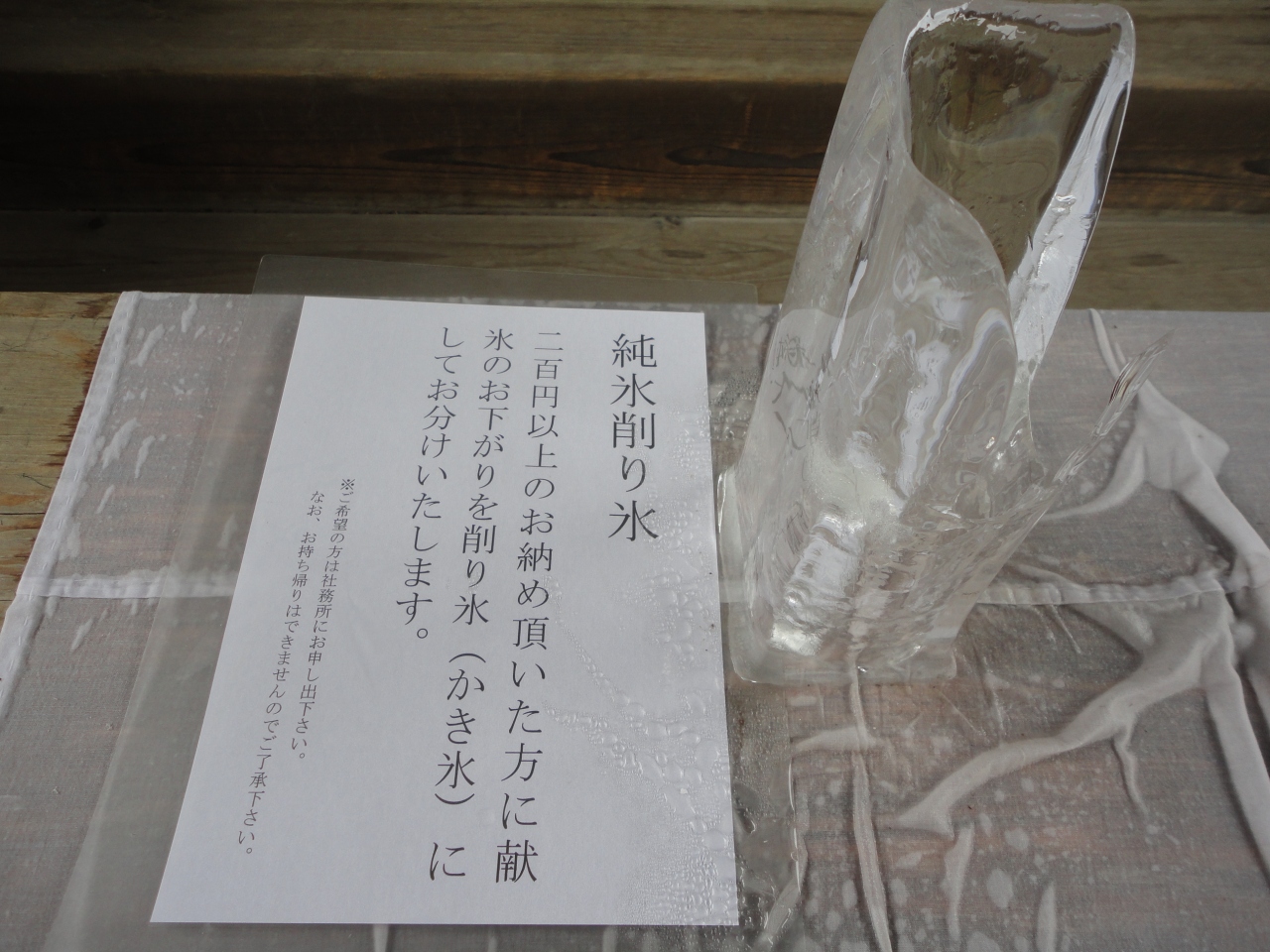 その横に「純氷削り氷 二百円以上のお納め頂いた方に献氷のお下がりを削り氷(かき氷)にしてお分けいたします。