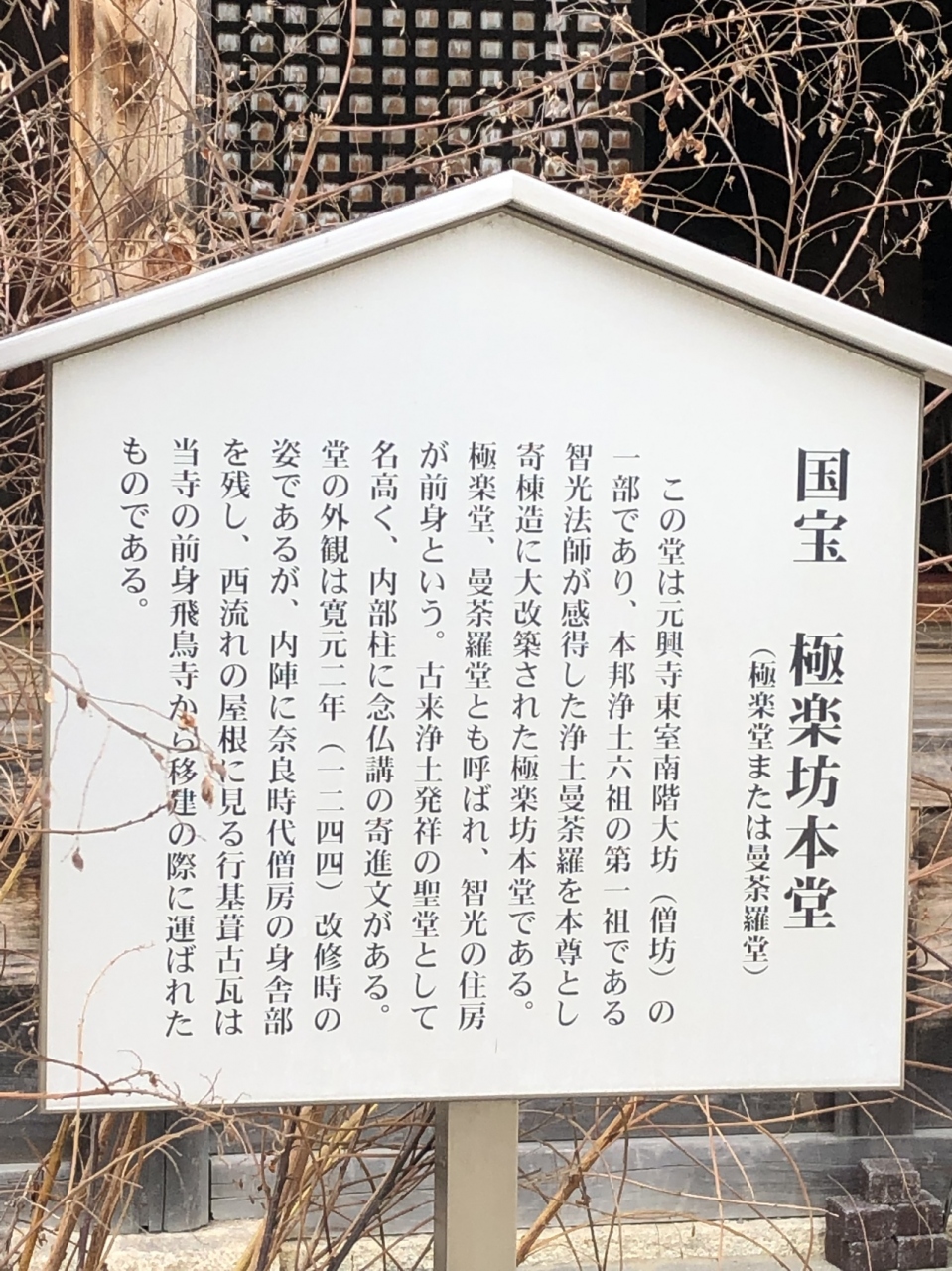 飛鳥寺を創建とする大寺元興寺僧房の一つを改築したもので、智光曼荼羅・五重小塔など、寺宝が多い。かつては南都七大寺の一つといわれた。現在は極楽坊境内、東大塔(五重塔)跡や西小塔院跡が国の史跡として指定されている。世界遺産「古都奈良の文化財」の8資産群のうちのひとつ。 【料金】 大人: 500円 ・秋季特別展期間中は大人のみ600円 ・20名以上団体料金400円/1人(秋季特別展期間中540円) 高校生: 300円 中学生: 300円 小学生: 100円