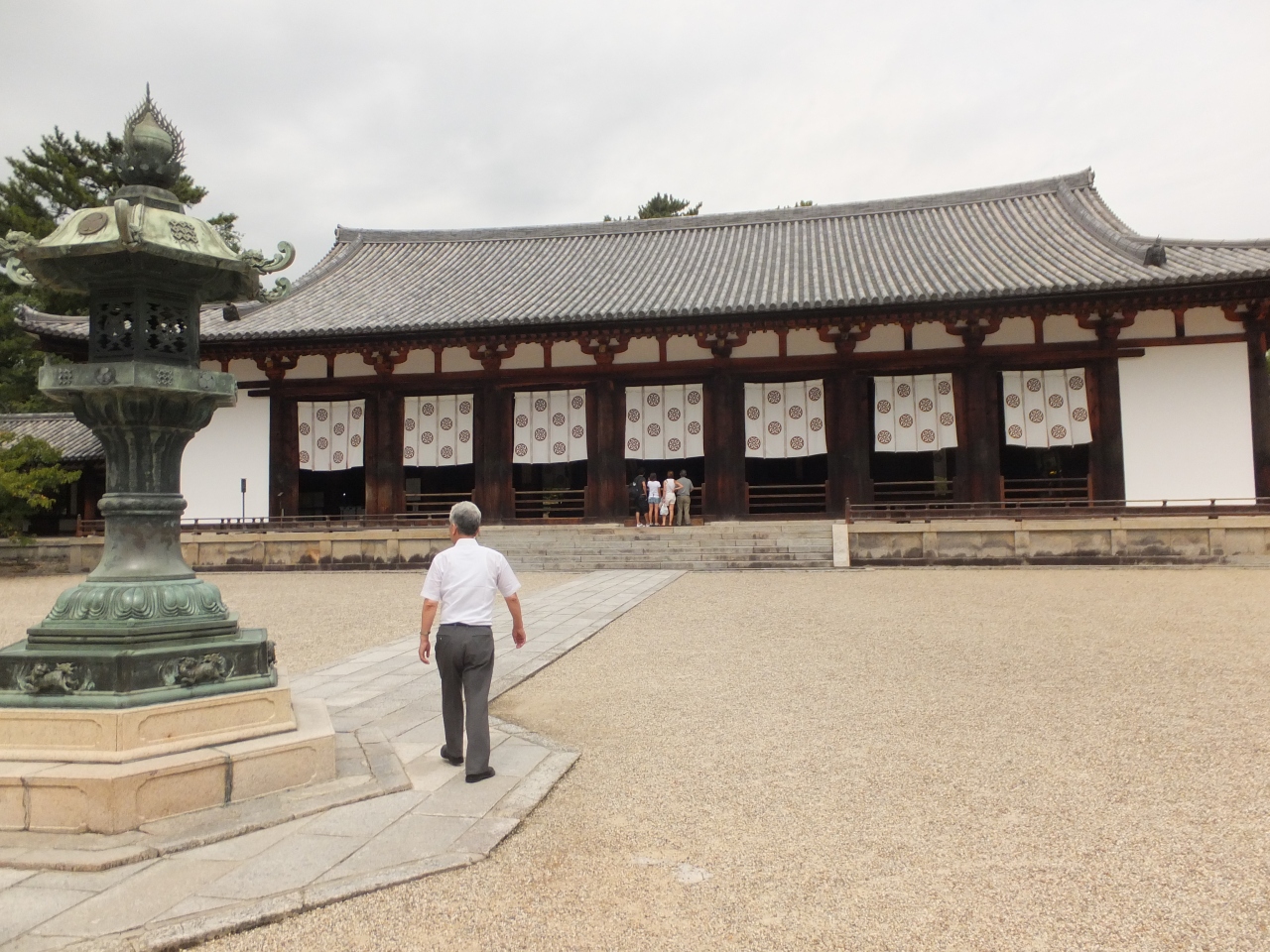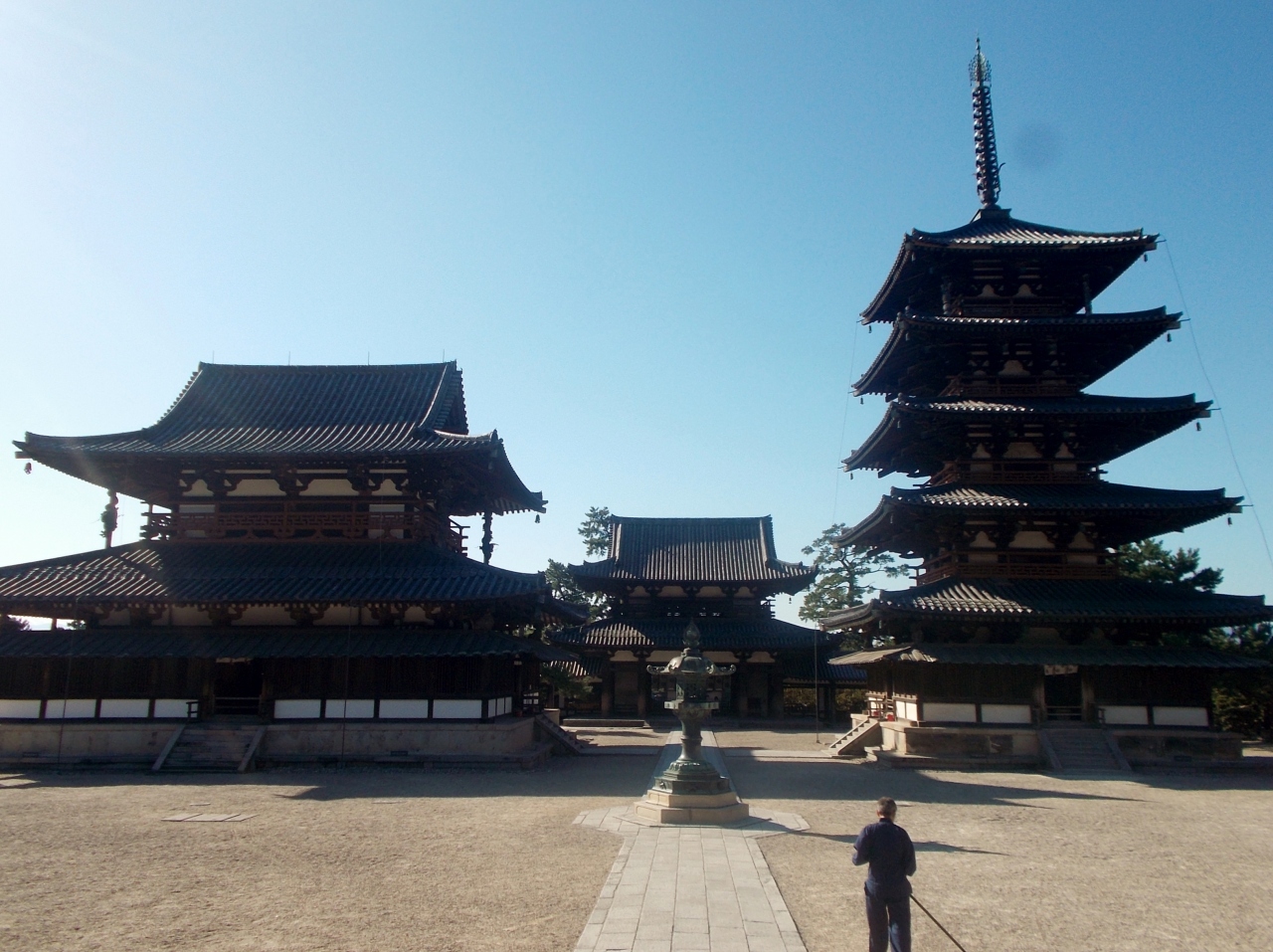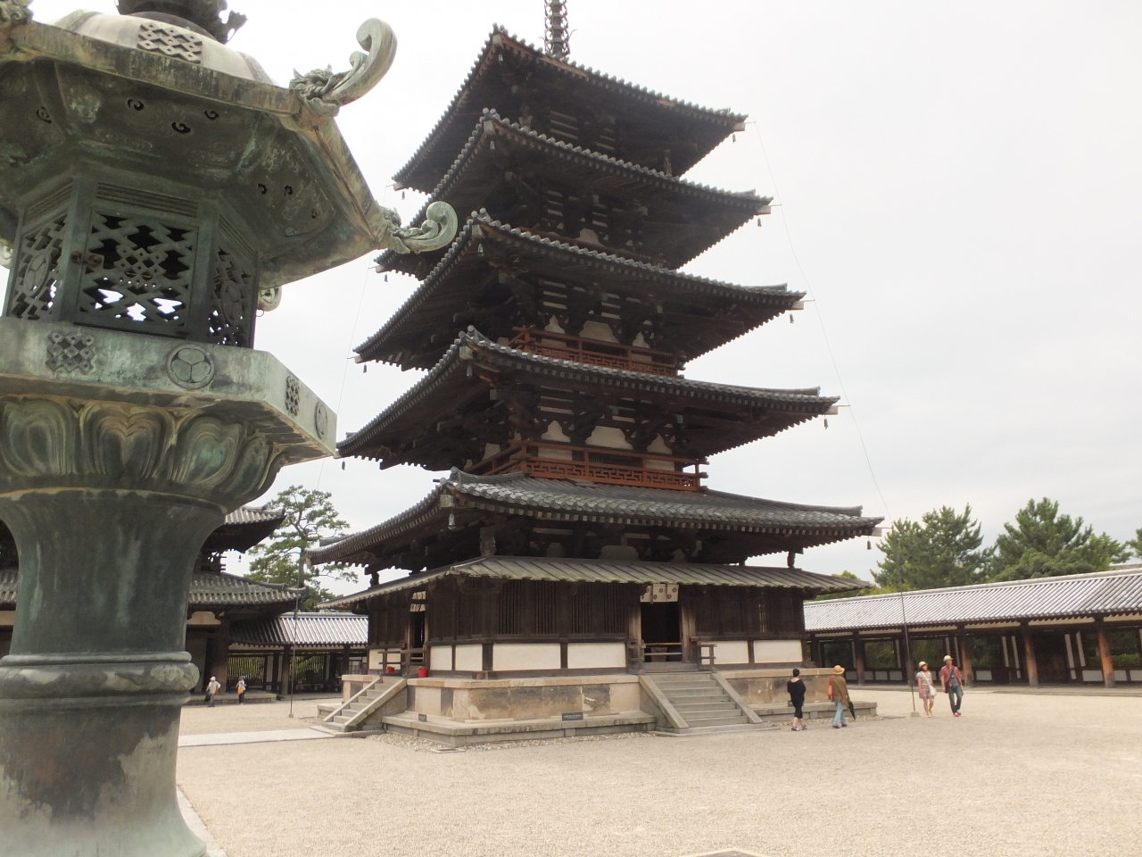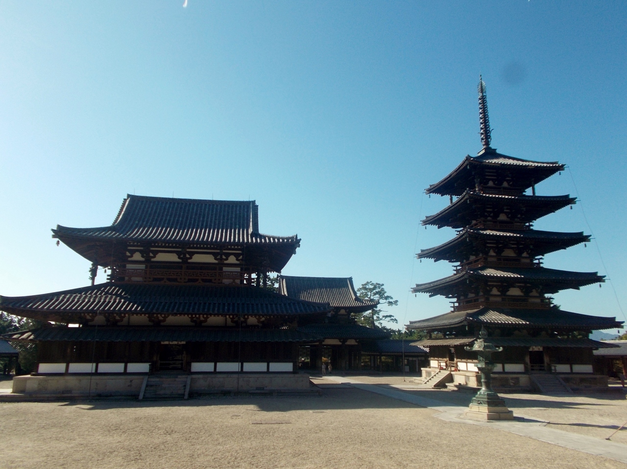 国宝大講堂からの金堂・中門・五重塔の国宝3点の景観。