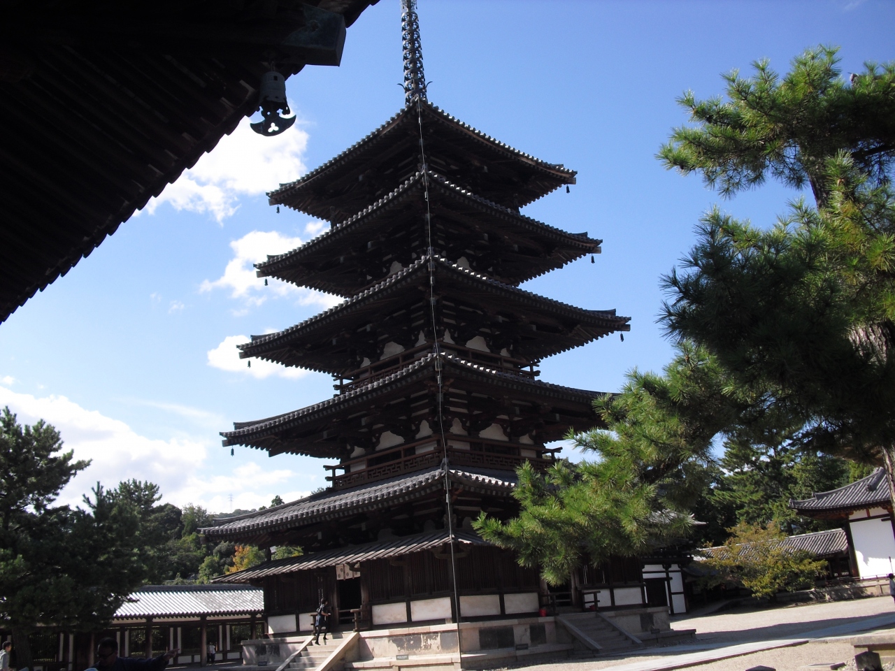 大講堂からの五重塔単体の眺め。屋根の逓減率が大きく美しい塔。