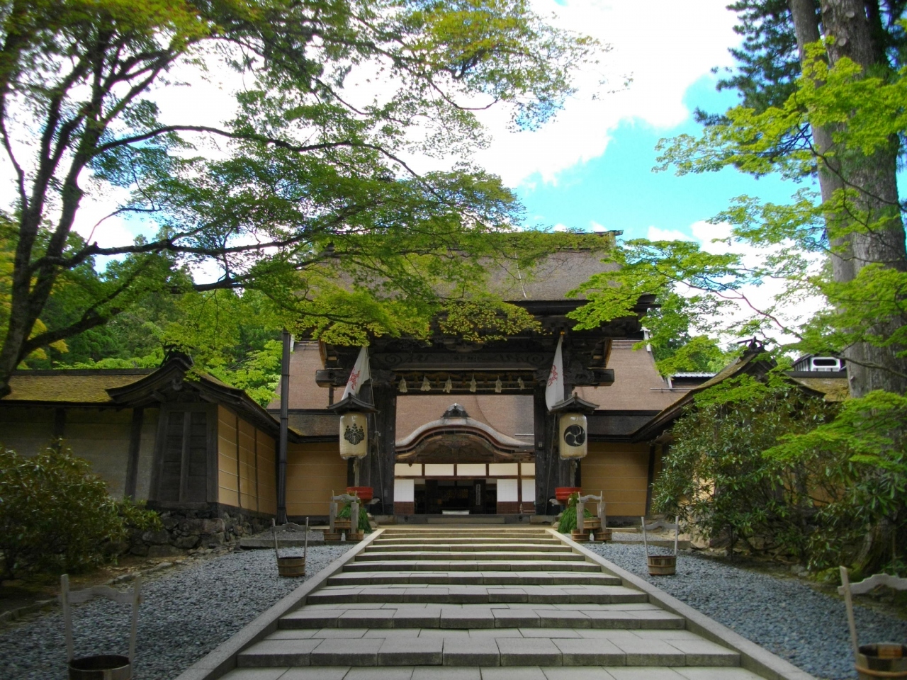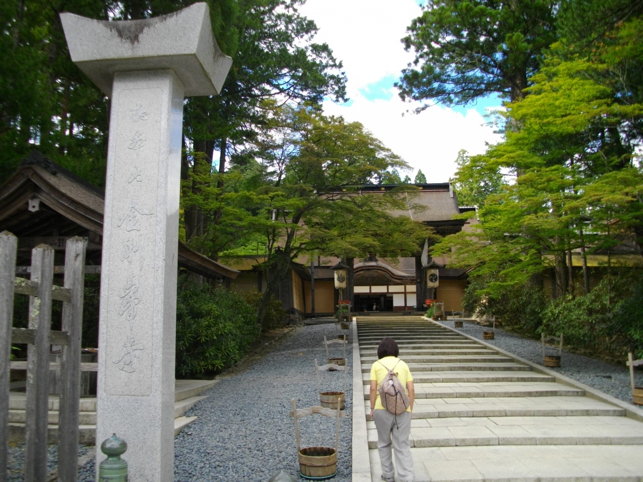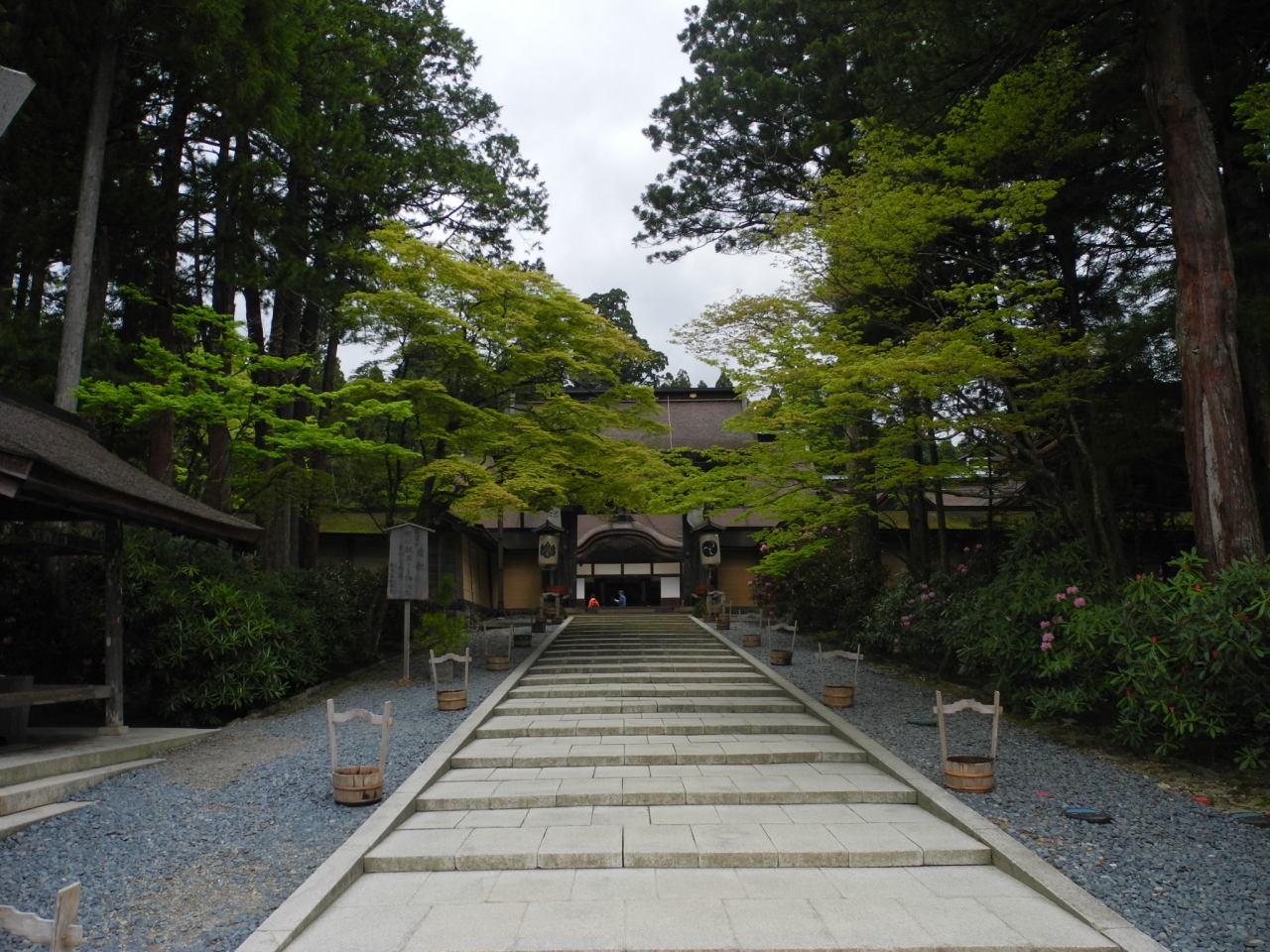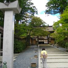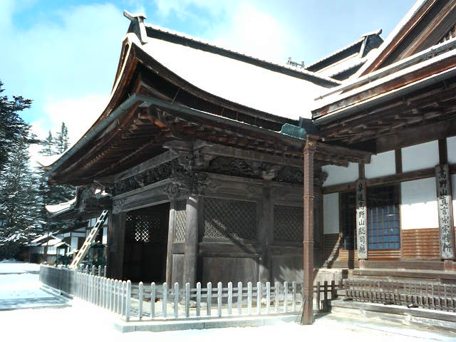 高野山真言宗の総本山。壮大な玄関をもつ建物は文久3年(1863)の再建。主殿は東西三十間、南北三十五間の大建築で、大広間には狩野探幽の襖絵「松に群鶴」が、豊臣秀次自刃したという柳の間には狩野探斎による「雪柳白鷲」が描かれている。