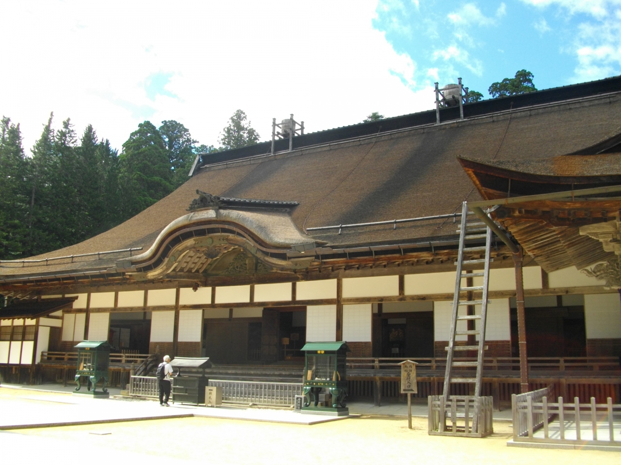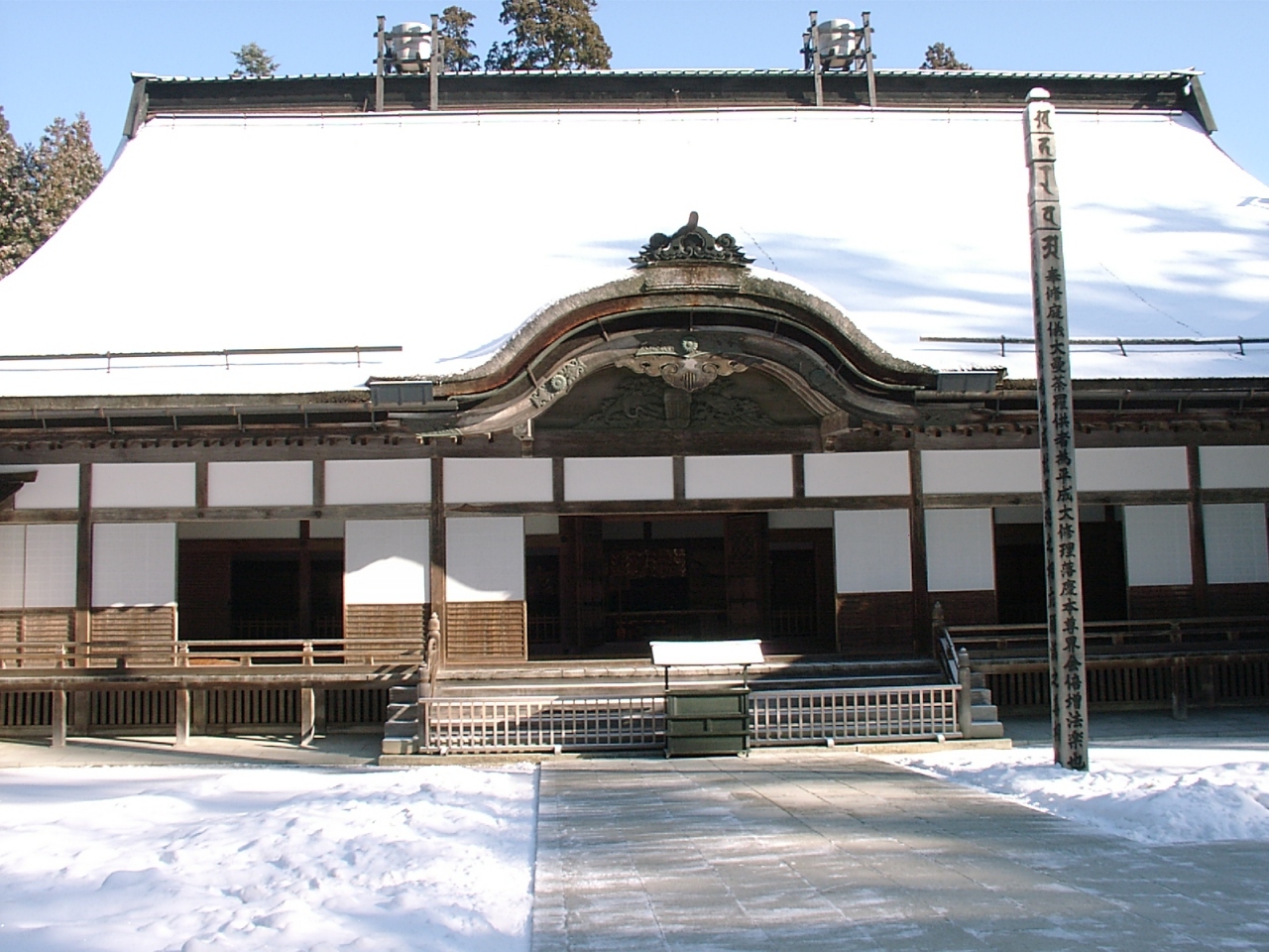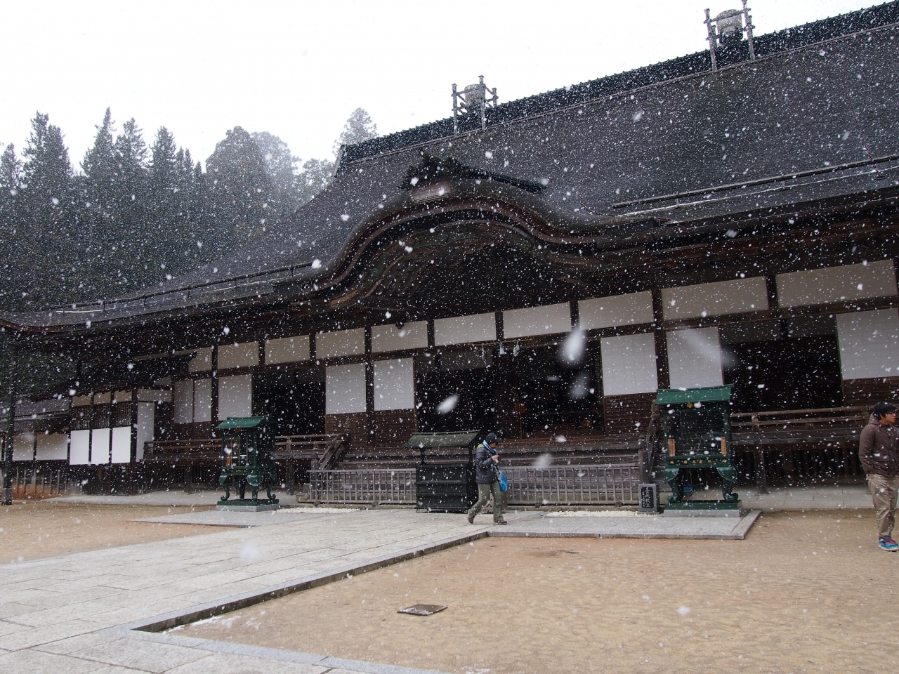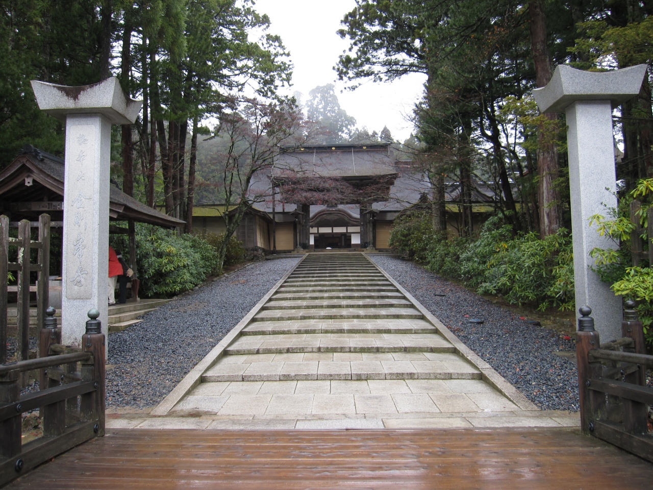 高野山真言宗の総本山。壮大な玄関をもつ建物は文久3年(1863)の再建。主殿は東西三十間、南北三十五間の大建築で、大広間には狩野探幽の襖絵「松に群鶴」が、豊臣秀次自刃したという柳の間には狩野探斎による「雪柳白鷲」が描かれている。