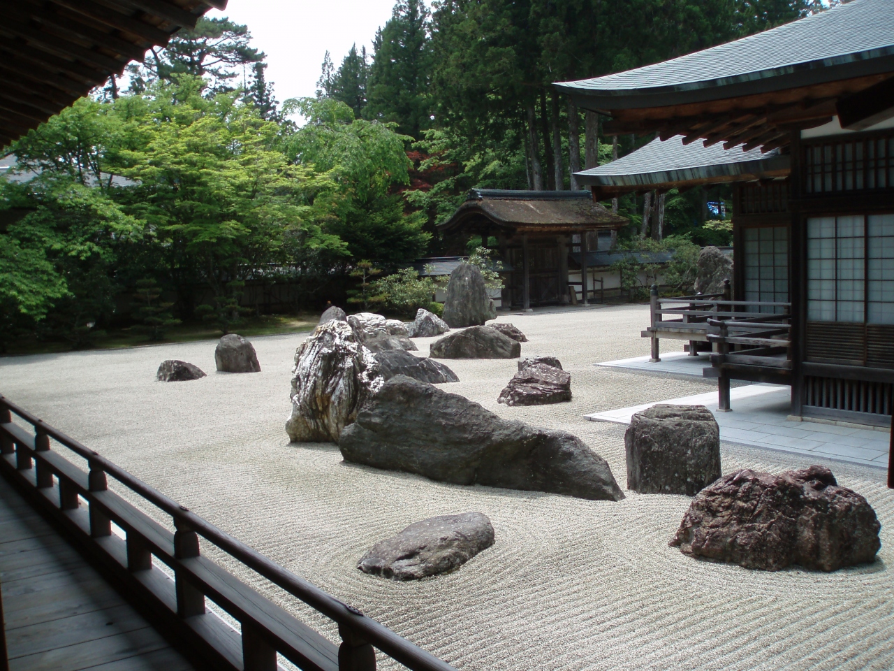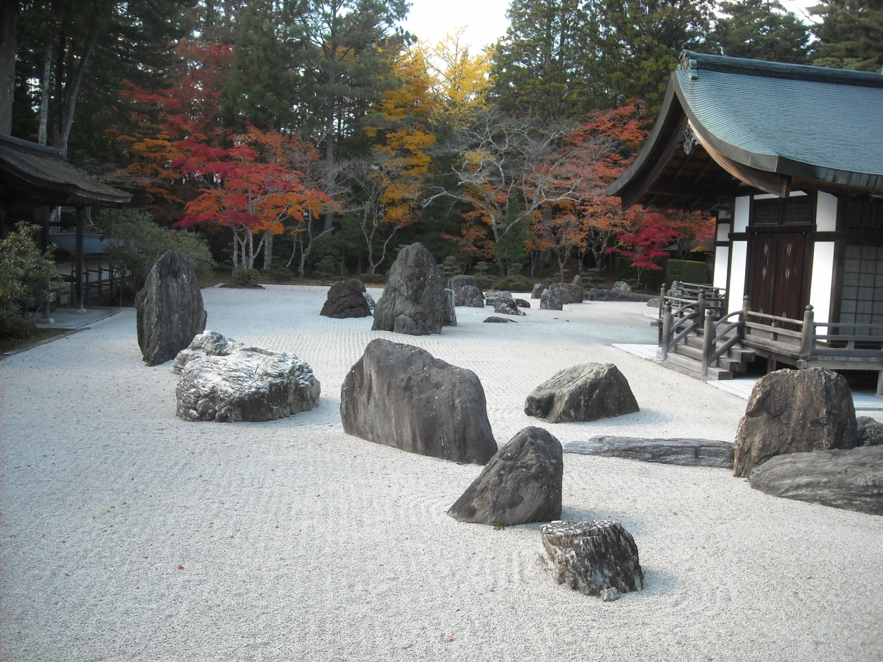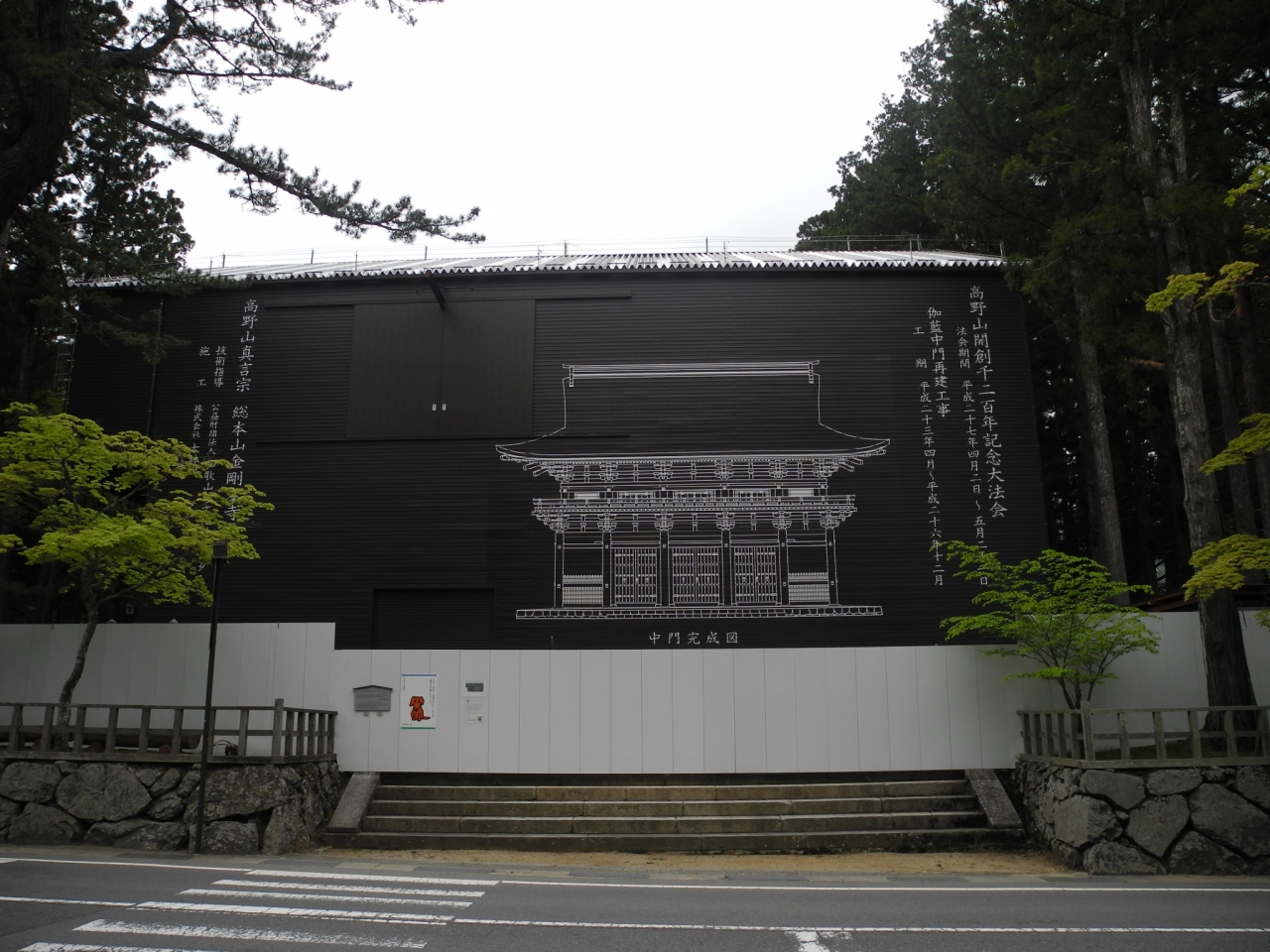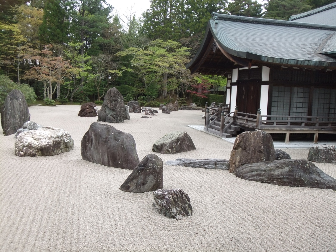 高野山真言宗の総本山。壮大な玄関をもつ建物は文久3年(1863)の再建。主殿は東西三十間、南北三十五間の大建築で、大広間には狩野探幽の襖絵「松に群鶴」が、豊臣秀次自刃したという柳の間には狩野探斎による「雪柳白鷲」が描かれている。
