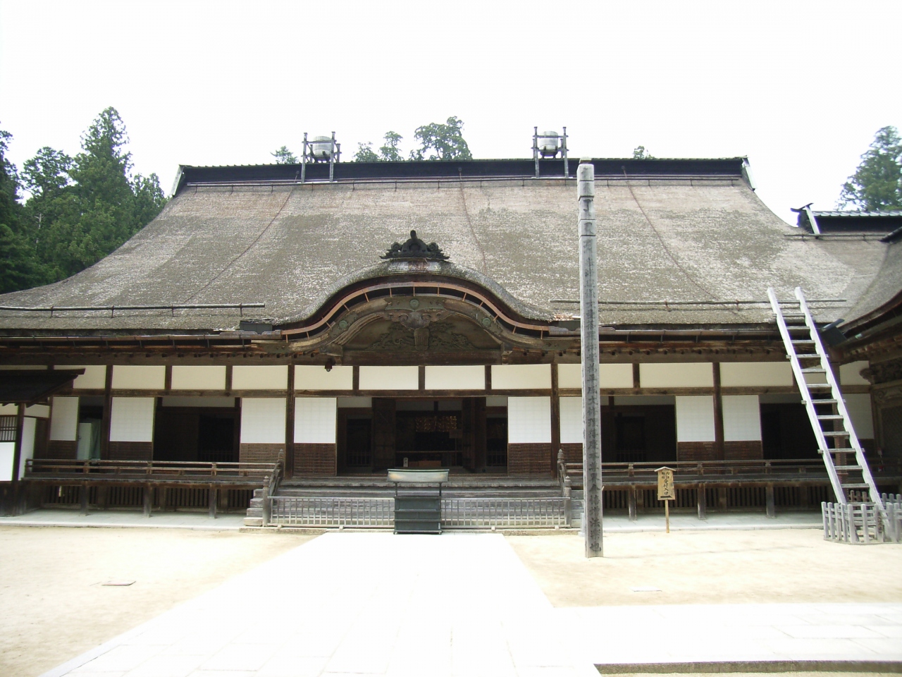 高野山真言宗の総本山。壮大な玄関をもつ建物は文久3年(1863)の再建。主殿は東西三十間、南北三十五間の大建築で、大広間には狩野探幽の襖絵「松に群鶴」が、豊臣秀次自刃したという柳の間には狩野探斎による「雪柳白鷲」が描かれている。
