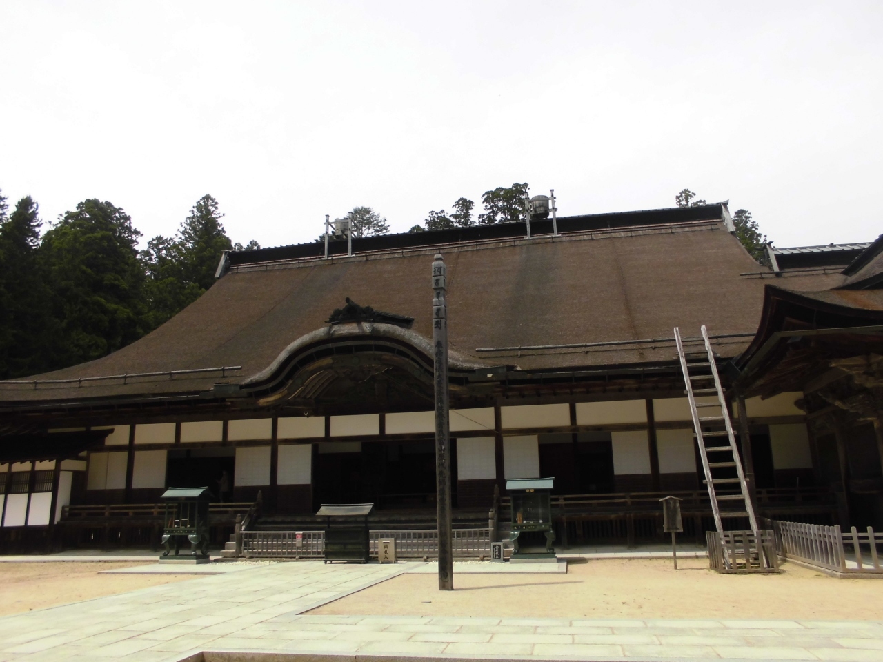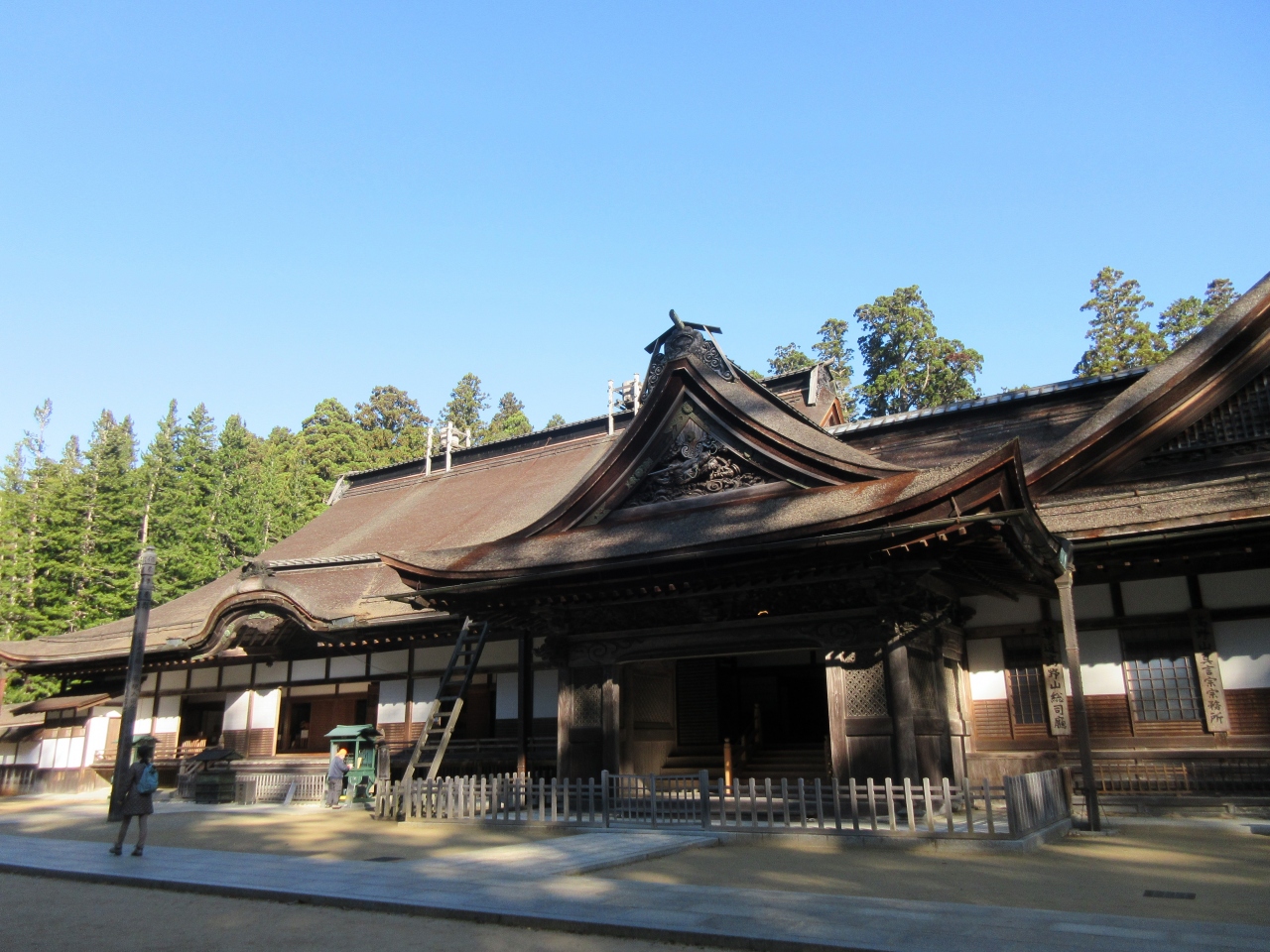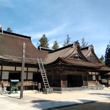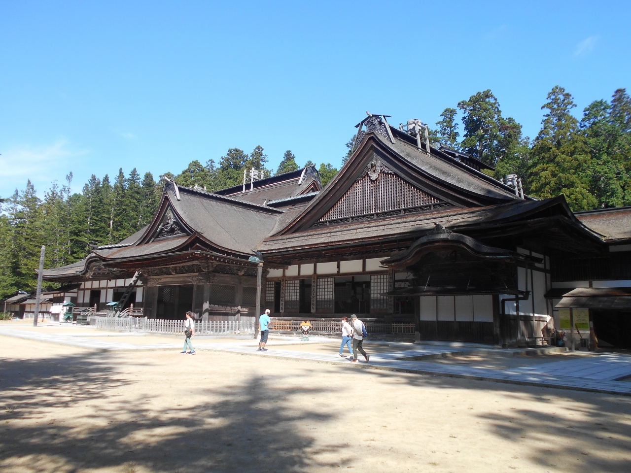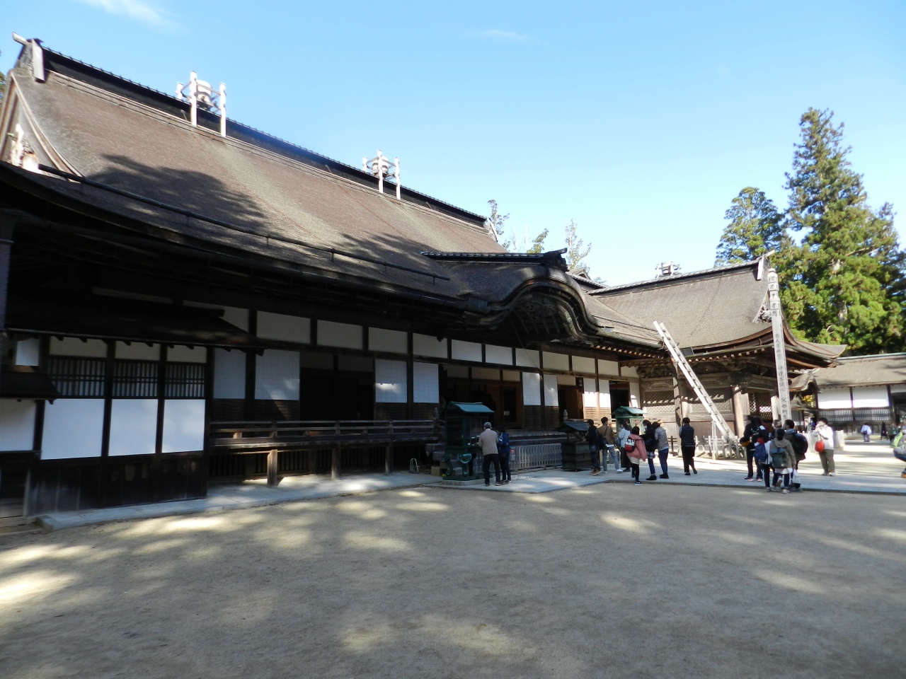 高野山真言宗の総本山。壮大な玄関をもつ建物は文久3年(1863)の再建。主殿は東西三十間、南北三十五間の大建築で、大広間には狩野探幽の襖絵「松に群鶴」が、豊臣秀次自刃したという柳の間には狩野探斎による「雪柳白鷲」が描かれている。