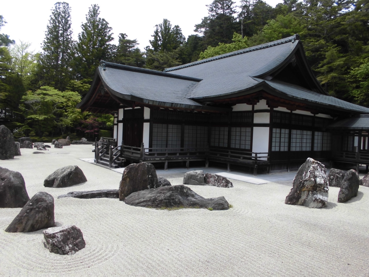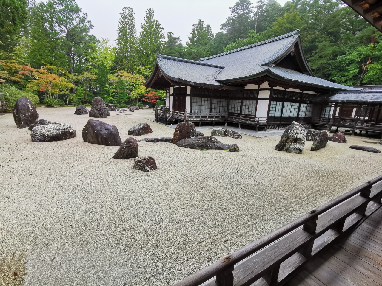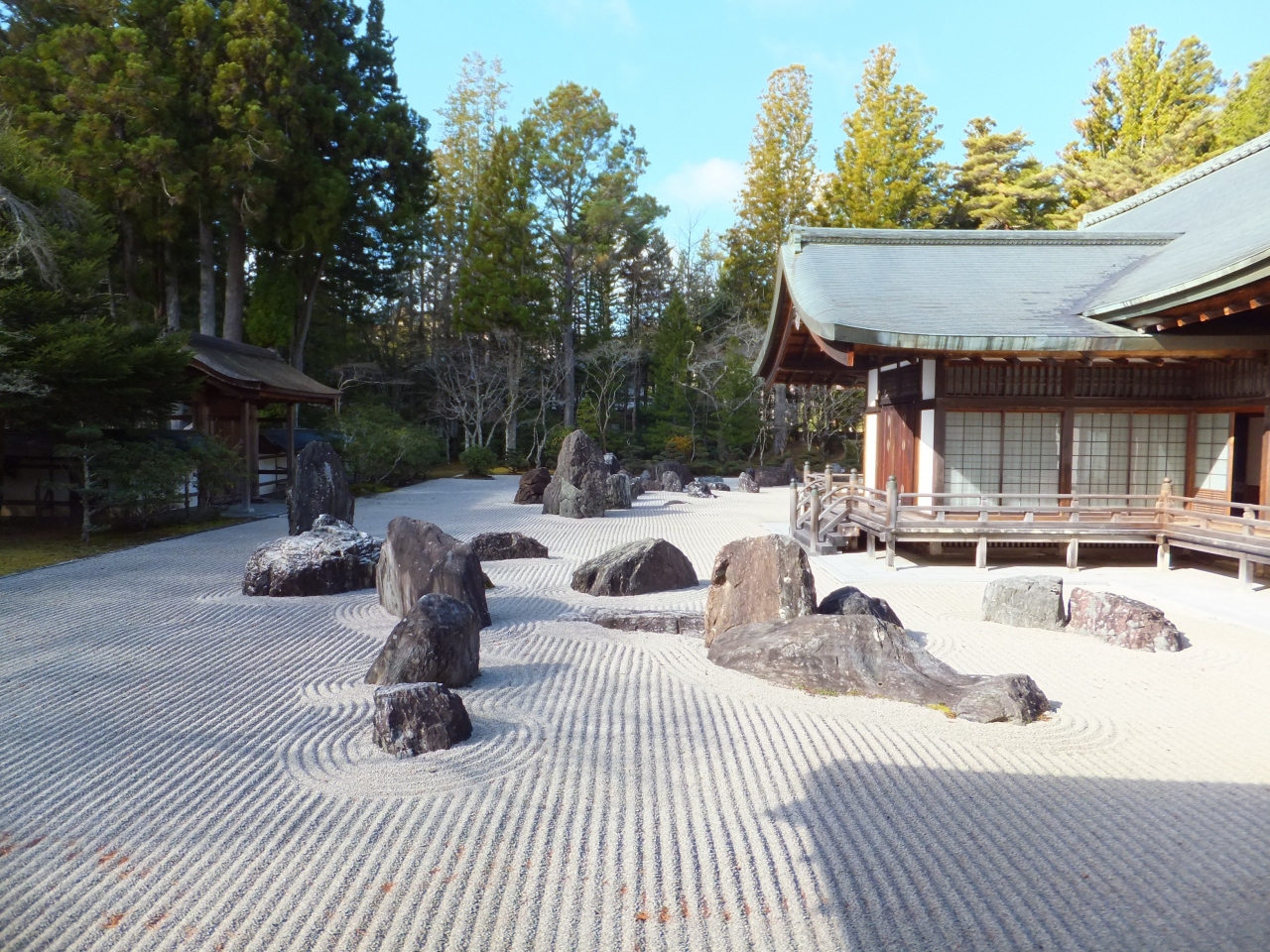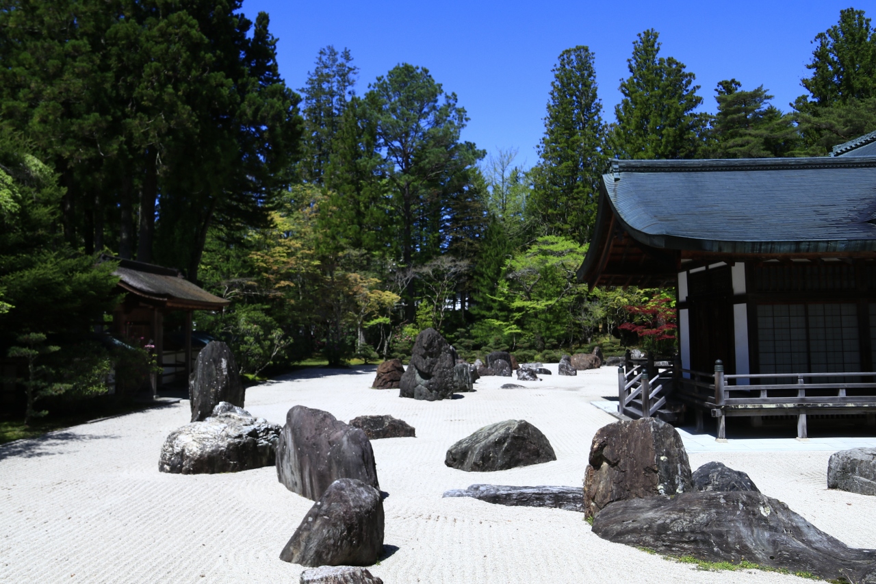 高野山真言宗の総本山。壮大な玄関をもつ建物は文久3年(1863)の再建。主殿は東西三十間、南北三十五間の大建築で、大広間には狩野探幽の襖絵「松に群鶴」が、豊臣秀次自刃したという柳の間には狩野探斎による「雪柳白鷲」が描かれている。